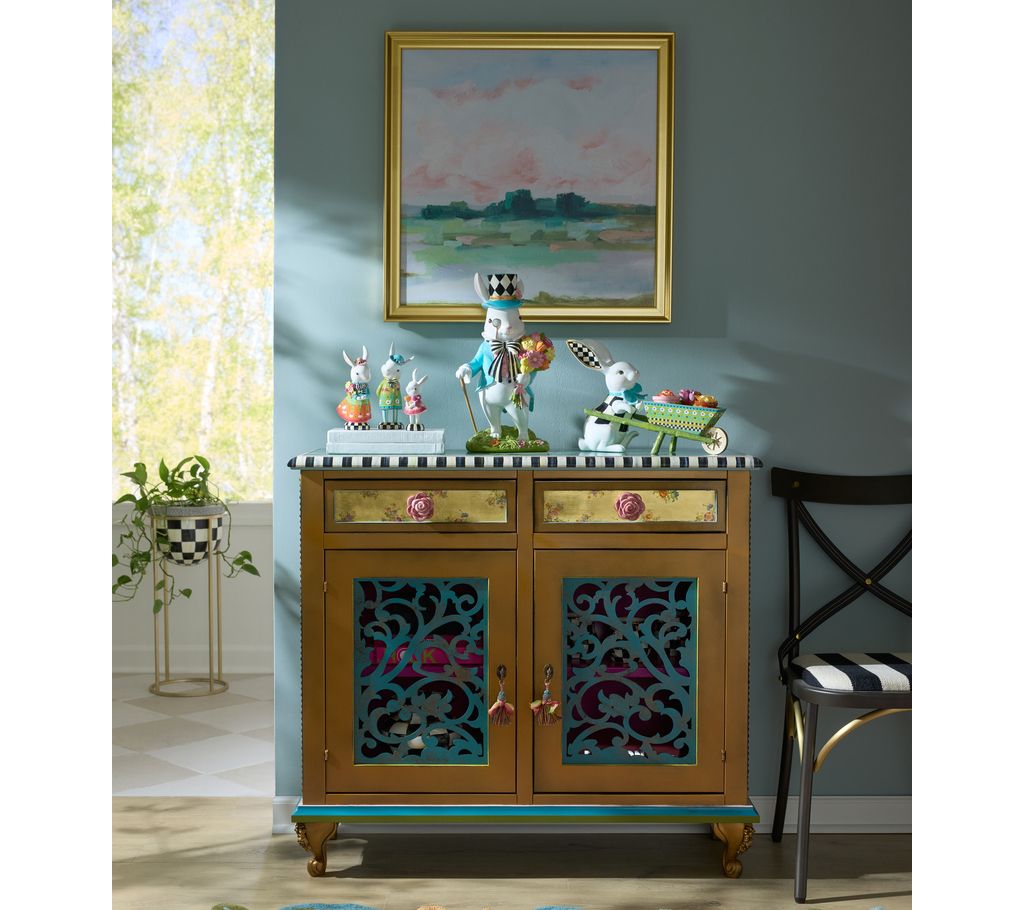 Hop into spring with this delightful tabletop bunny figurine! Decked out in hand-painted Courtly patterns on his hat and tie, this bunny adds a charming touch to any space. Perfect for your mantel, bookshelf, or as a festive centerpiece, he brings a whimsical vibe to your decor. From MacKenzie-Childs.