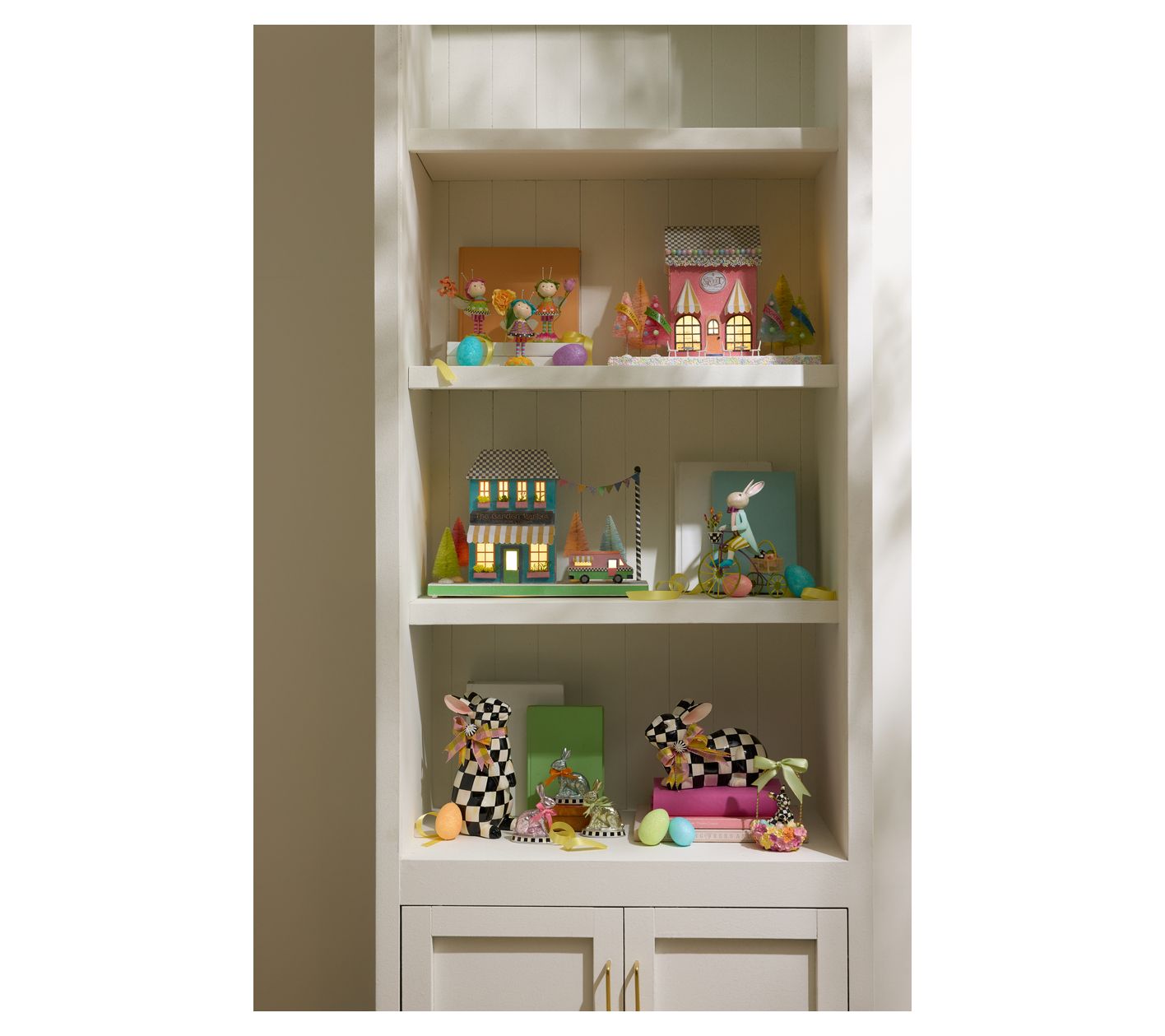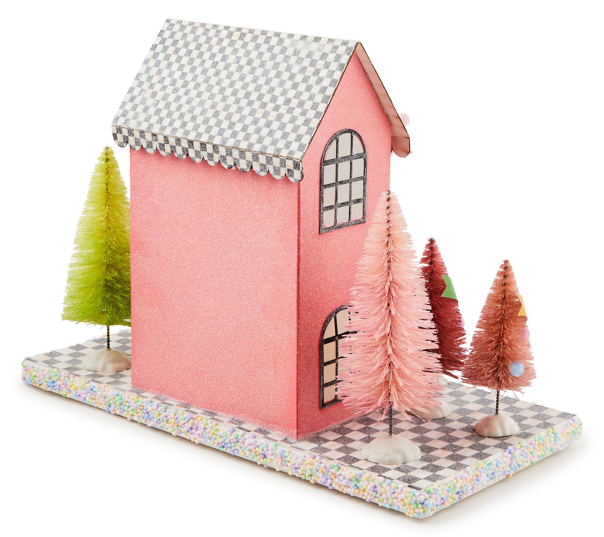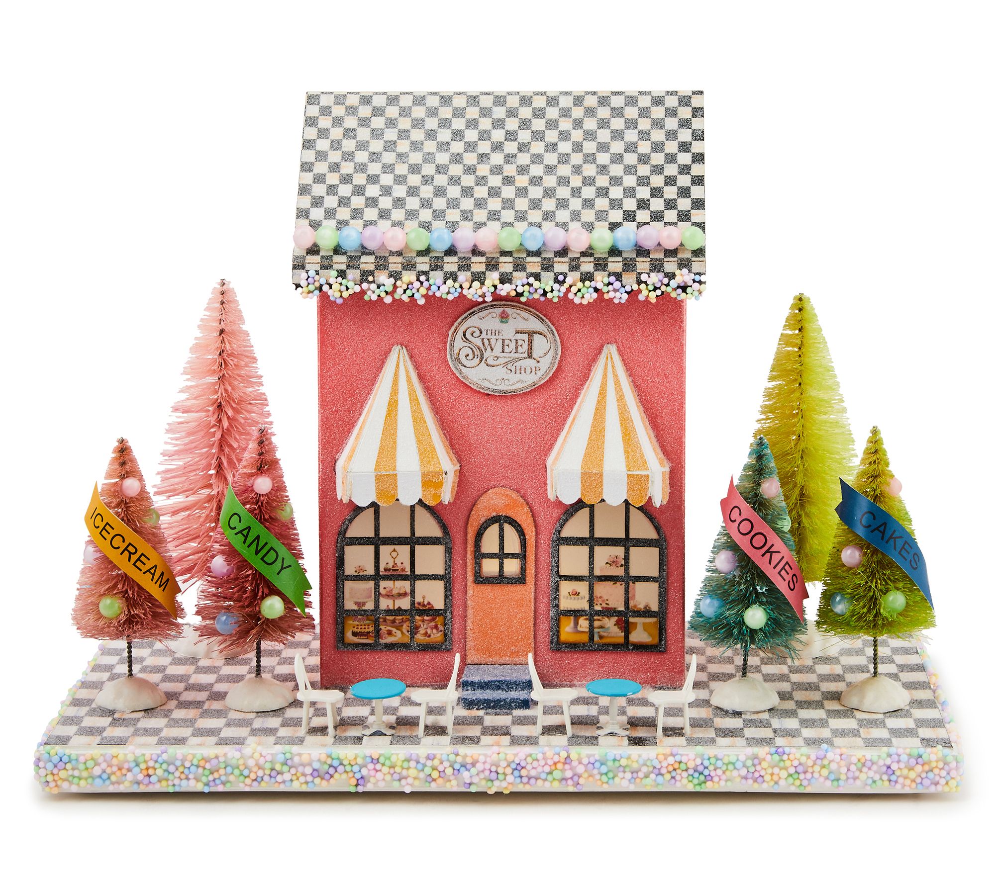 Create a charming springtime display with this MacKenzie-Childs Calico paper illuminated sweet shop. Featuring a Courtly Check roof and whimsical bottlebrush trees, it lights up any space with a dash of enchantment. From MacKenzie-Childs.