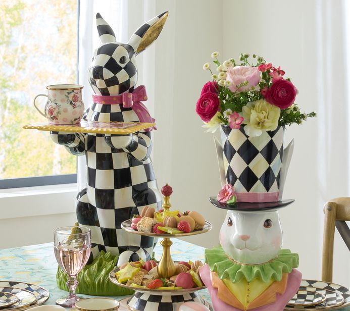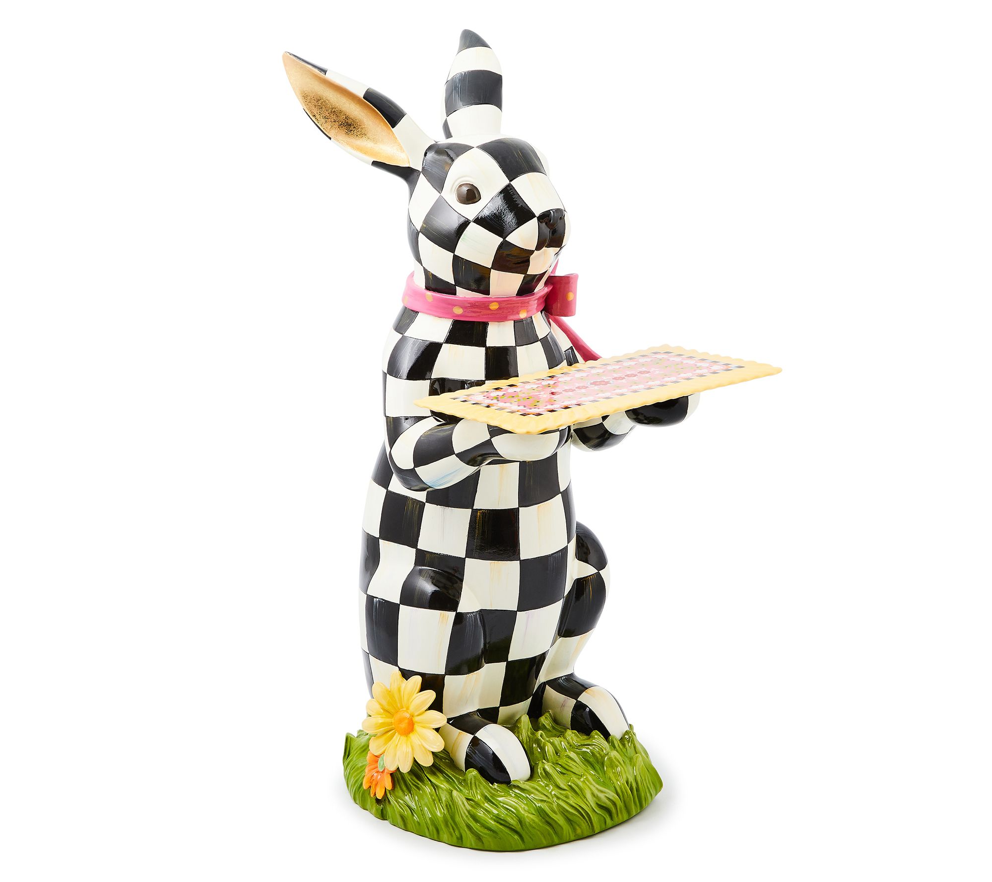 Step up your home decor game with this whimsical MacKenzie-Childs Calico Rabbit Butler. Perfect for serving sweet treats, the hand-painted Courtly Check rabbit holds a ceramic tray that attaches magnetically for easy removal and cleaning. Imagine the charm this piece will bring to your gatherings and displays. From MacKenzie-Childs.