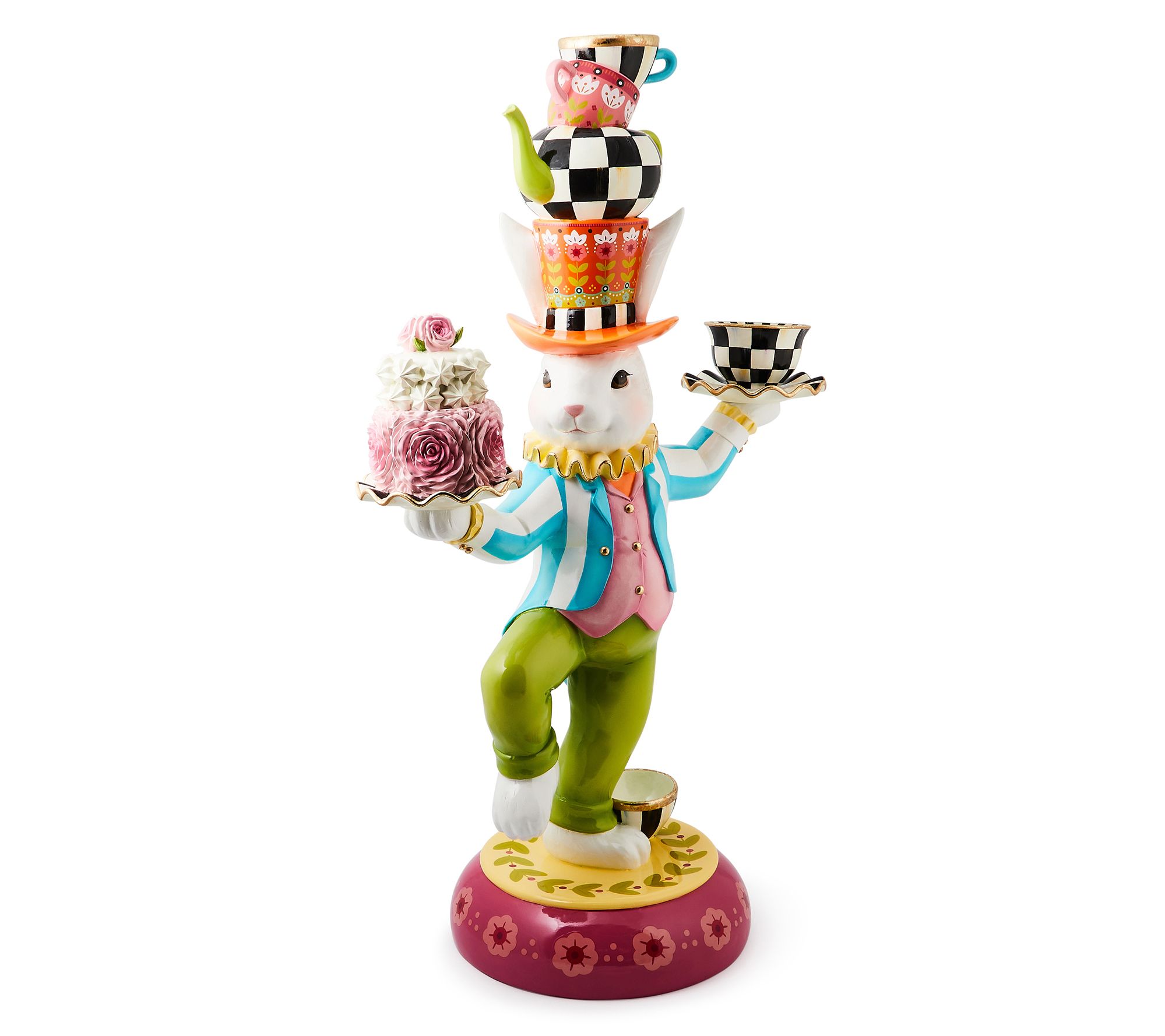 Add a whimsical touch to your home with this delightful Mackenzie-Childs Calico Trophy Rabbit. Perfect for spring decorating, this oversized figurine is weather-resistant and hand-painted, making it ideal for both indoor and outdoor display. It's sure to be a charming and eye-catching piece with an MC tea party balanced on its hat and front legs. From Mackenzie-Childs.