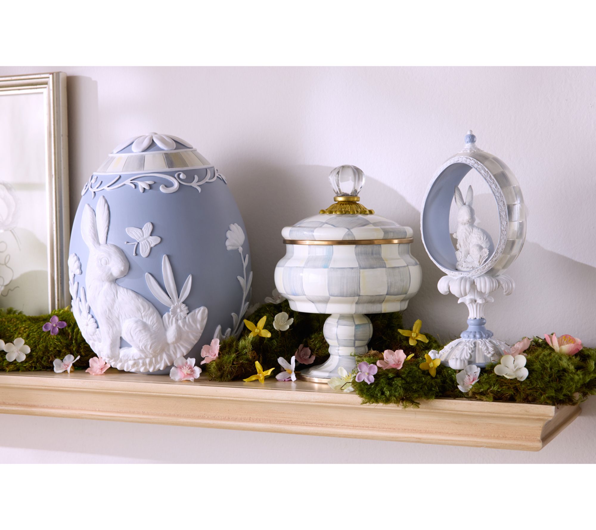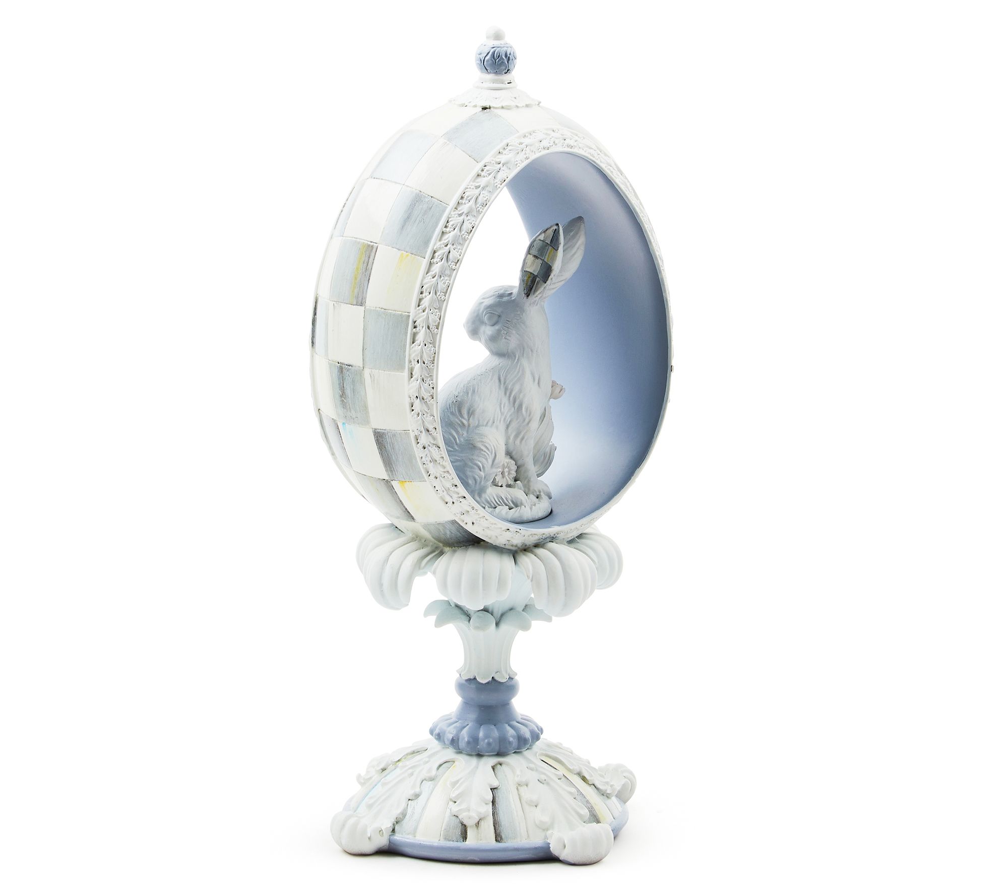 Elevate your spring decor with the MacKenzie-Childs Cameo Panoramic Bunny Egg. Featuring an ivory bunny peeking out from an open Sterling Check egg with a sculpted base, this charming piece brings vintage-inspired elegance to any setting. Ideal for showcasing on your tabletop, mantel, or buffet, it’s sure to capture attention and admiration. From MacKenzie-Childs.