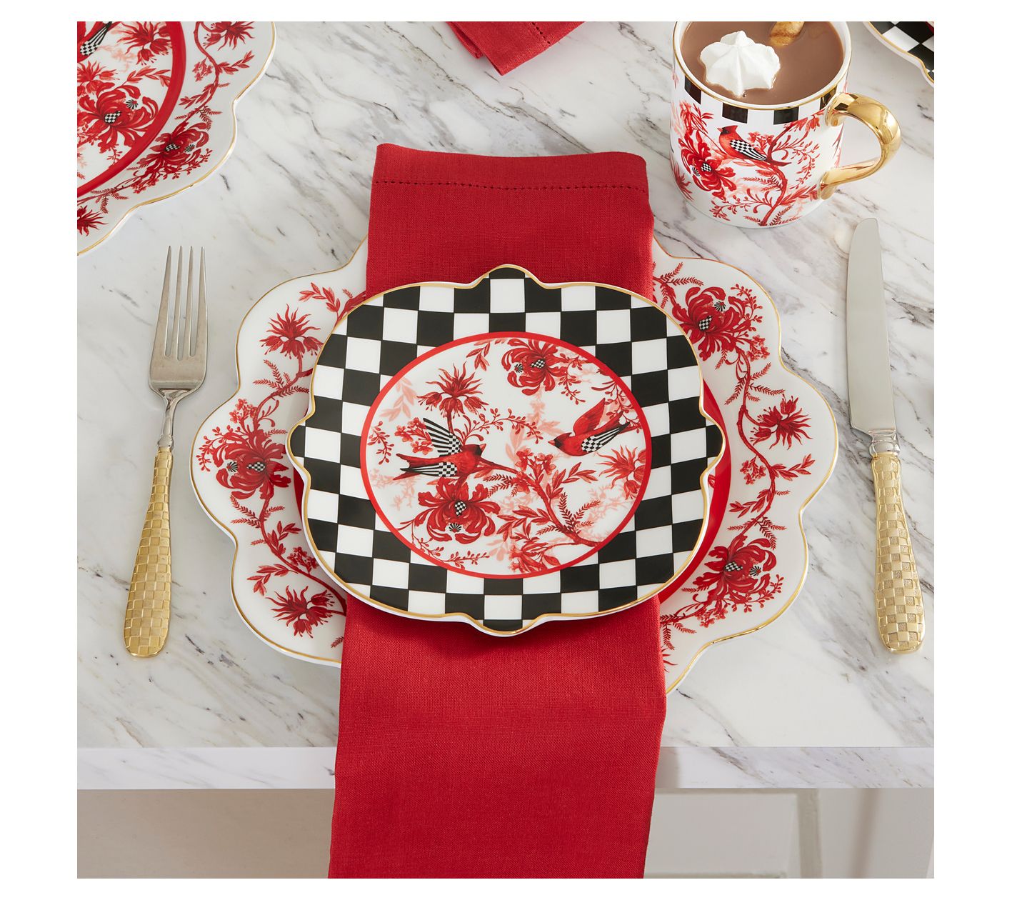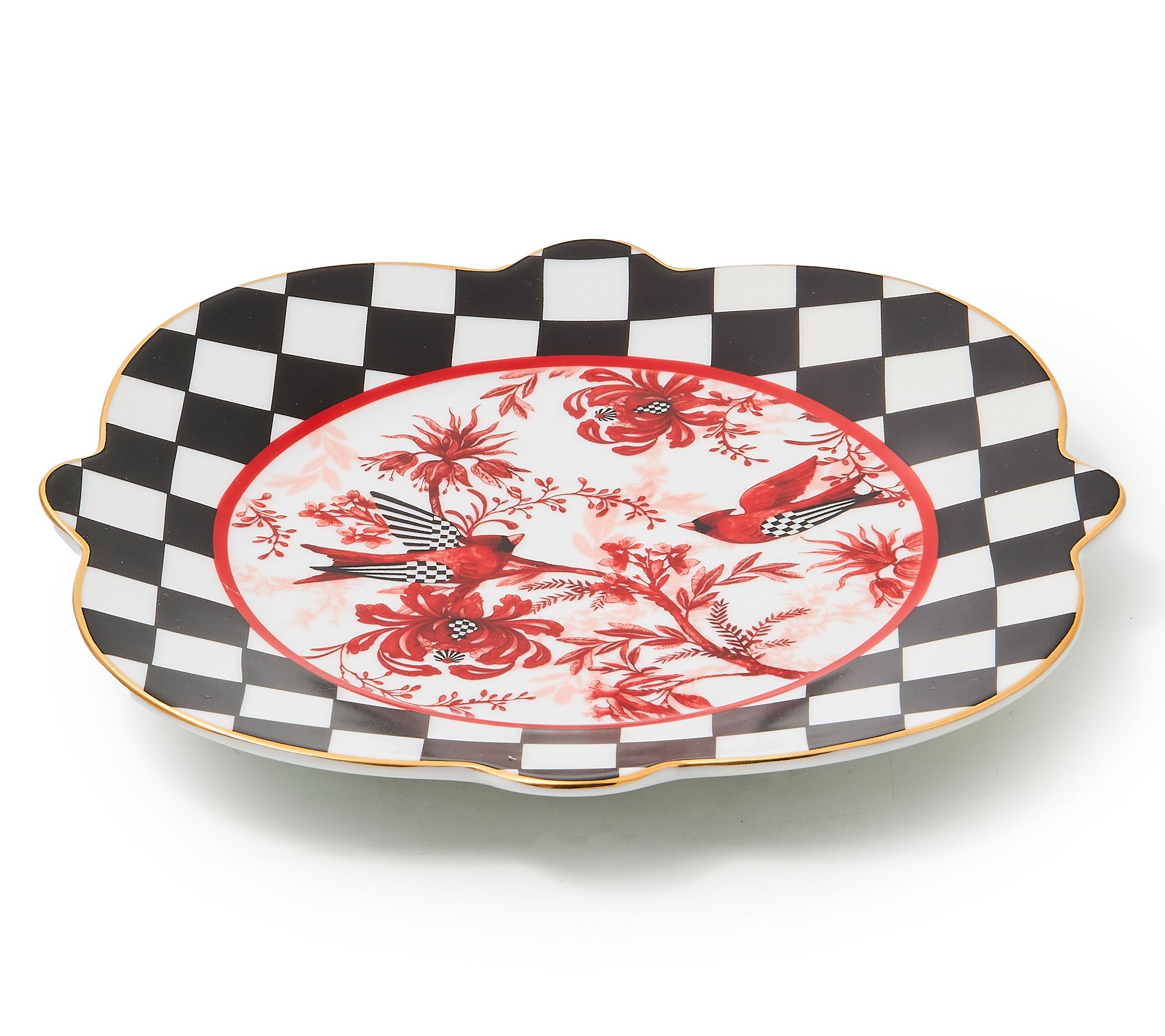 A gathering becomes even more memorable when you layer in details like this charming salad plate, adorned with a cheerful red cardinal and elegant toile accents. Surrounded by a border of classic black and white checks and finished with a hint of gold lustre, this porcelain dinnerware brings a touch of delight to both casual weekday meals and festive occasions. From MacKenzie-Childs.