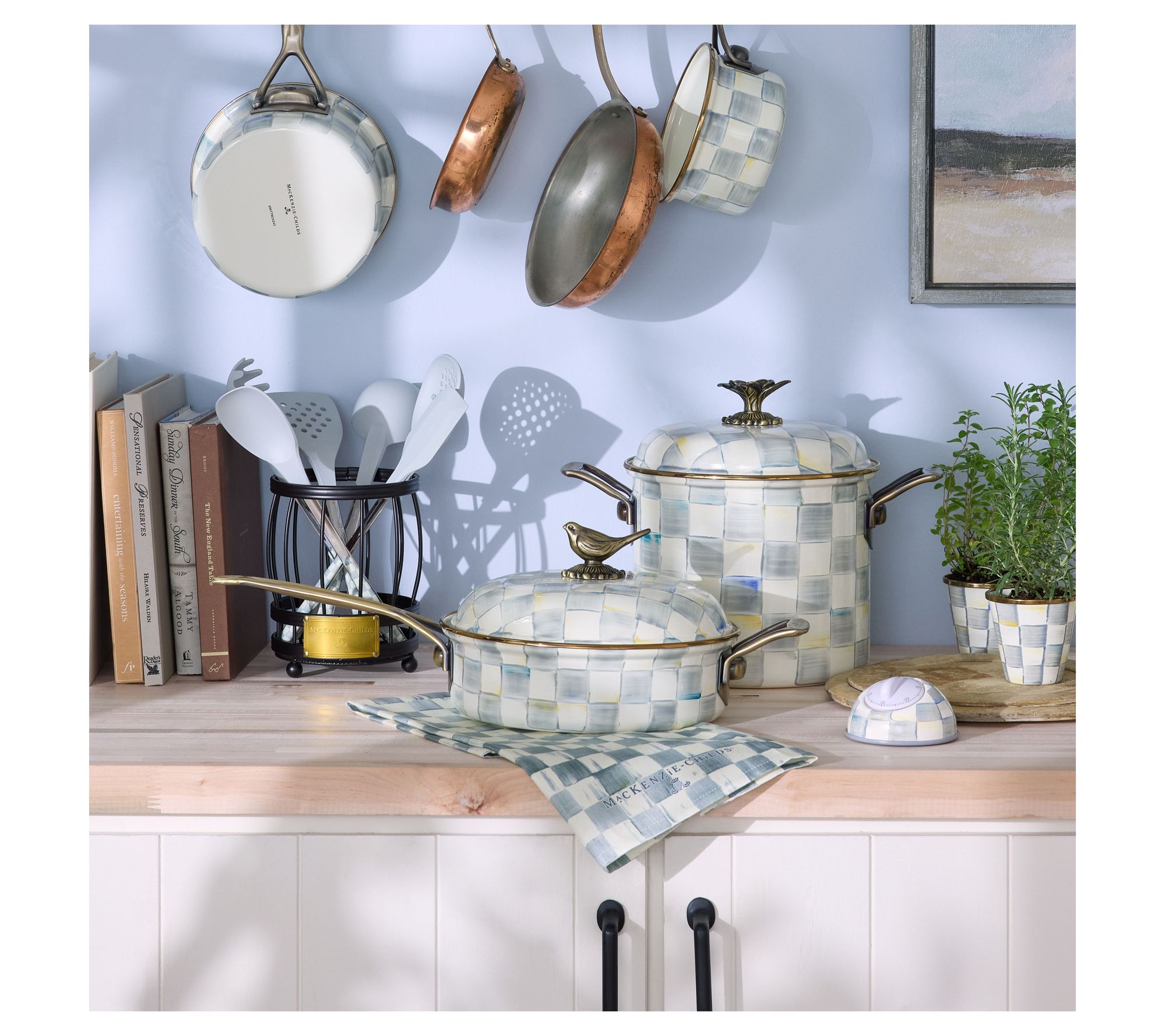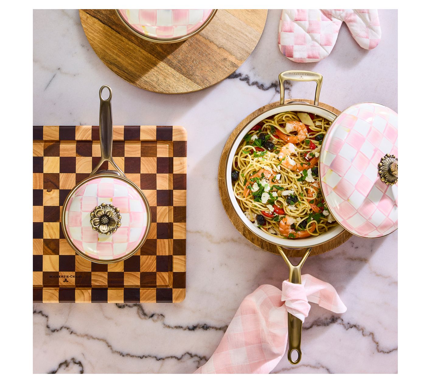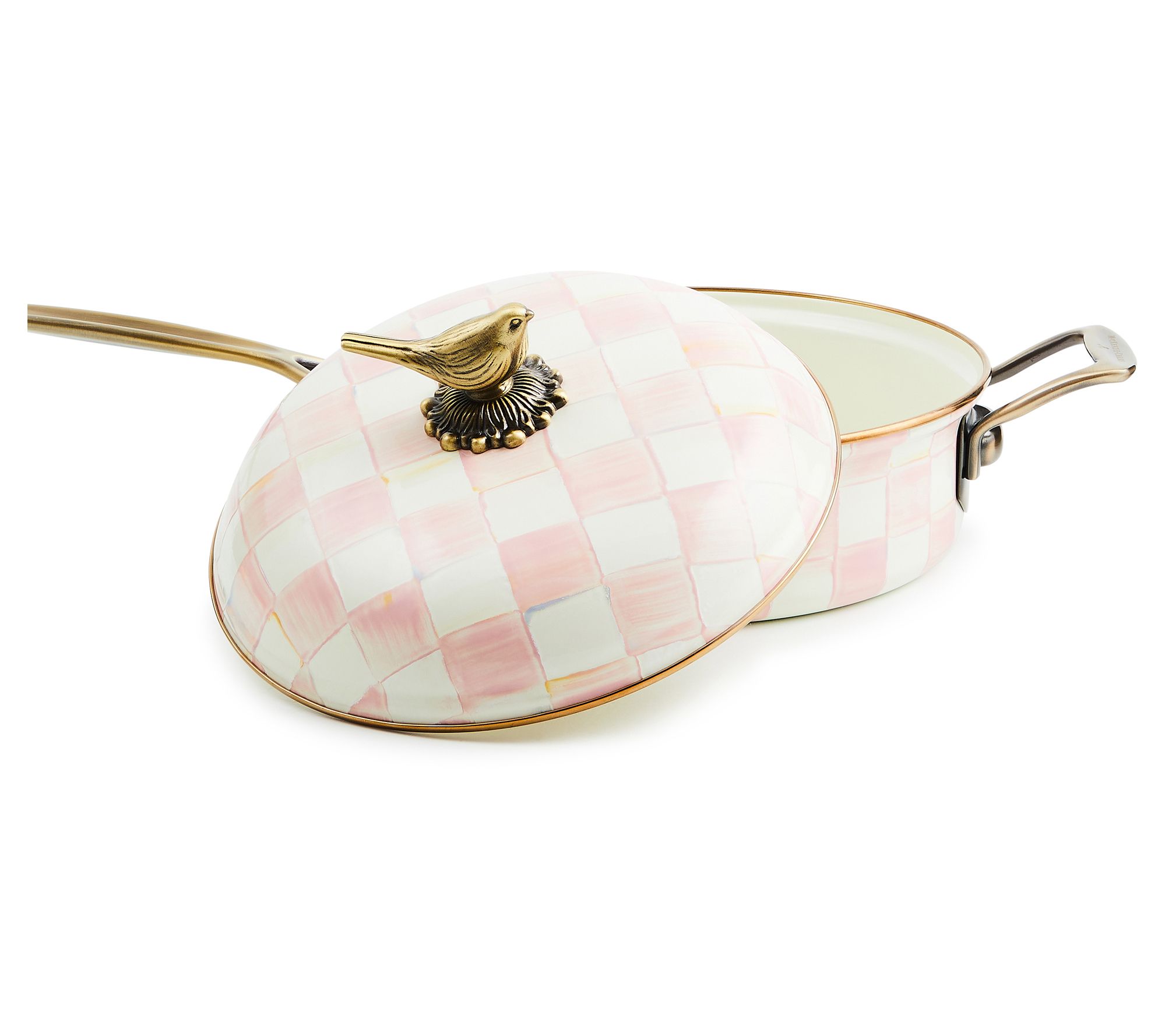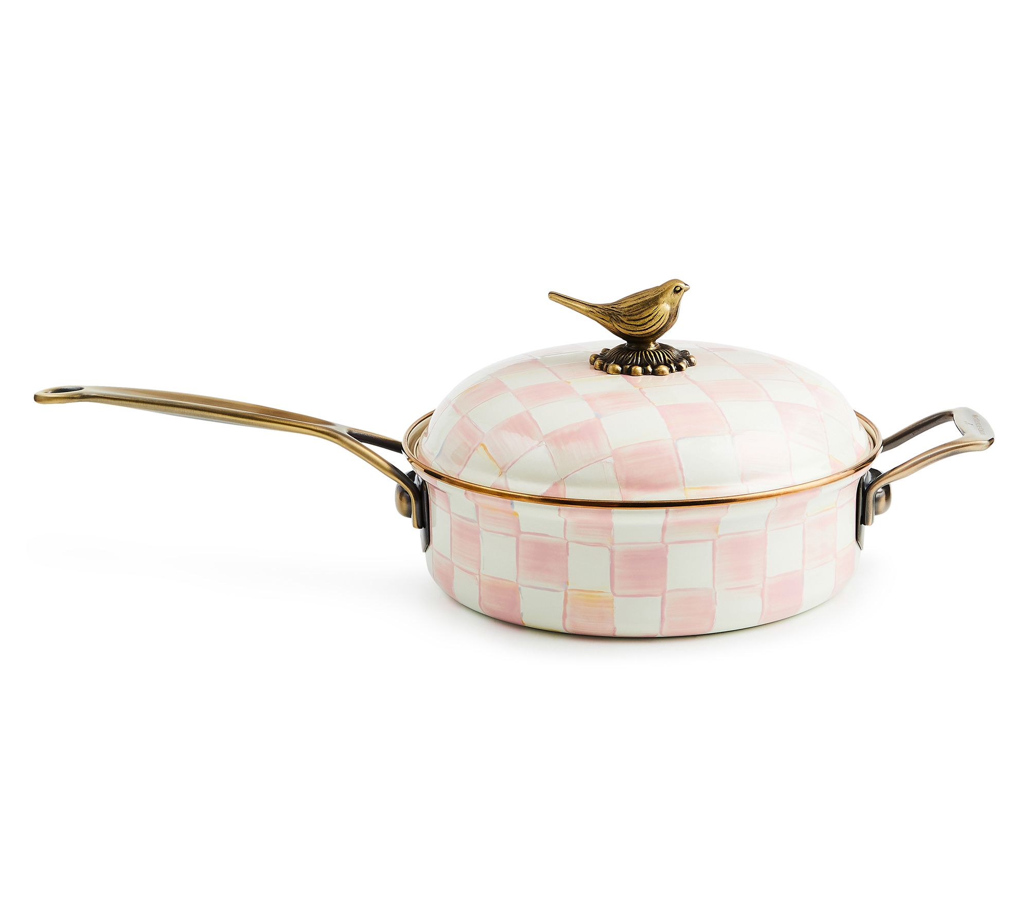 Elevate your cooking presentation with the MacKenzie-Childs Check saute pan. This charming piece seamlessly transitions from stovetop to dining table, enhancing the serving of your signature sauces with its eye-catching pink and white pattern. The delightful sparrow knob adds both style and utility, making it a conversation starter at any gathering. From MacKenzie-Childs.