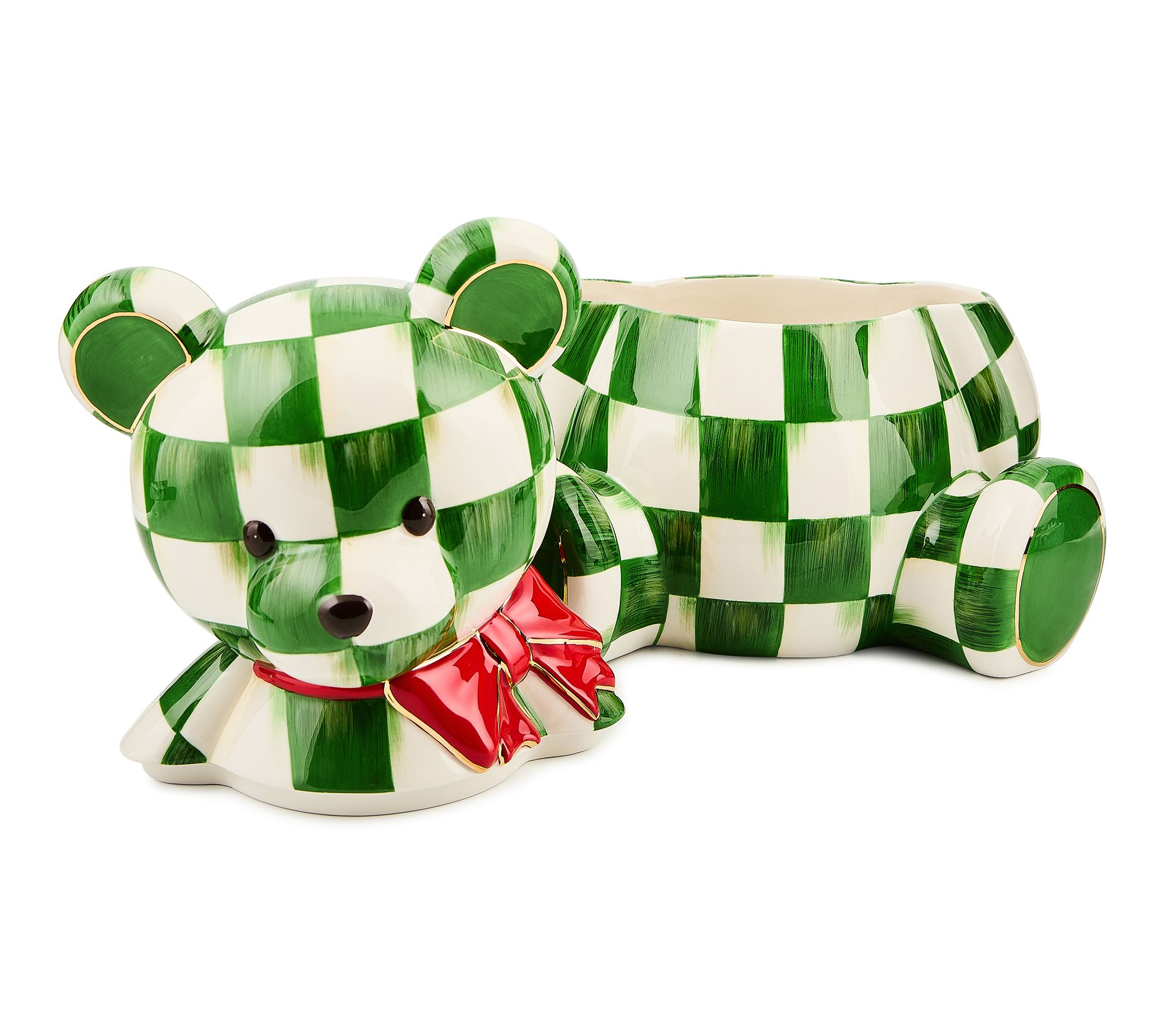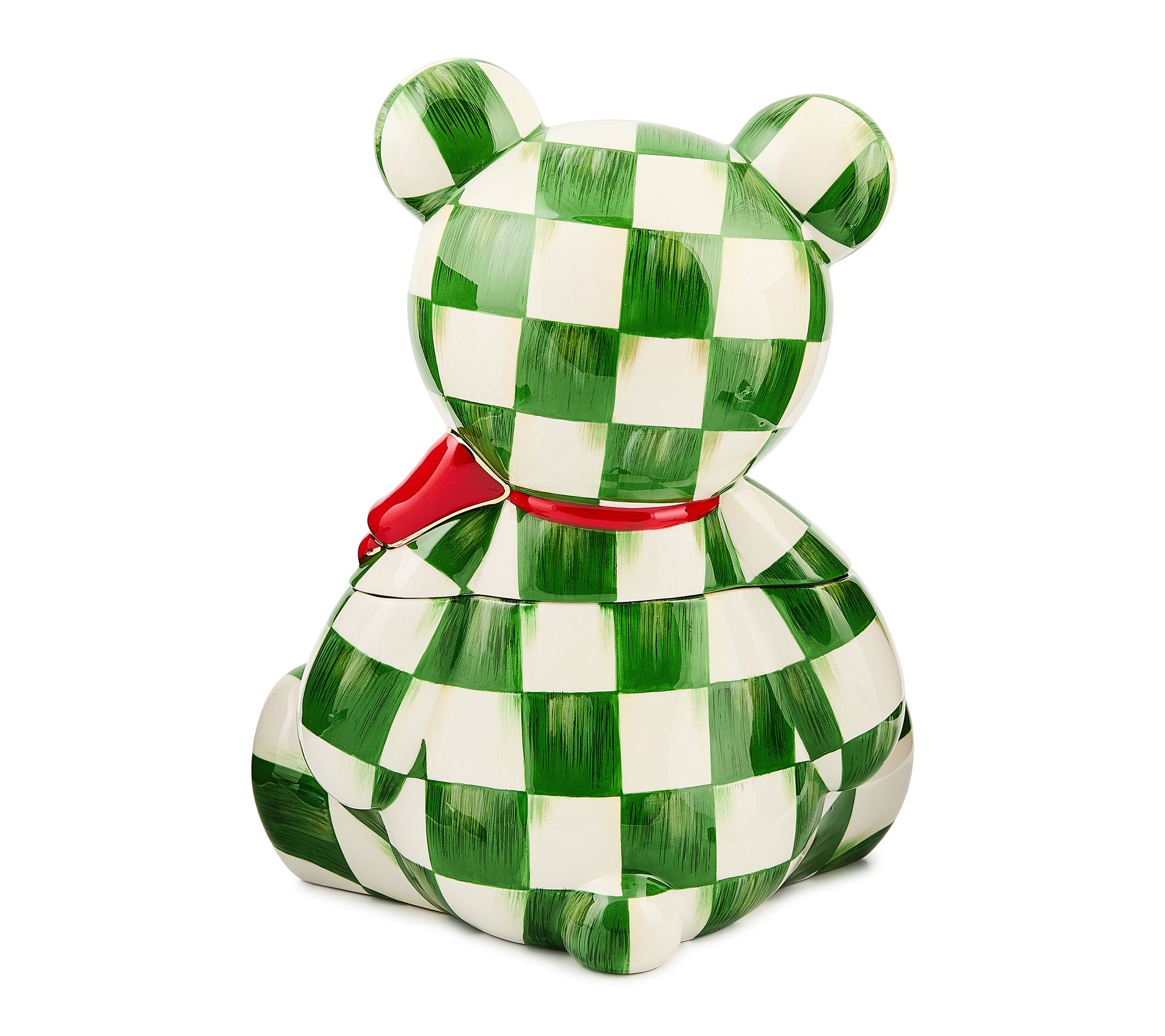 Features MacKenzie-Childs signature charm with a bow-wearing green checked bear design