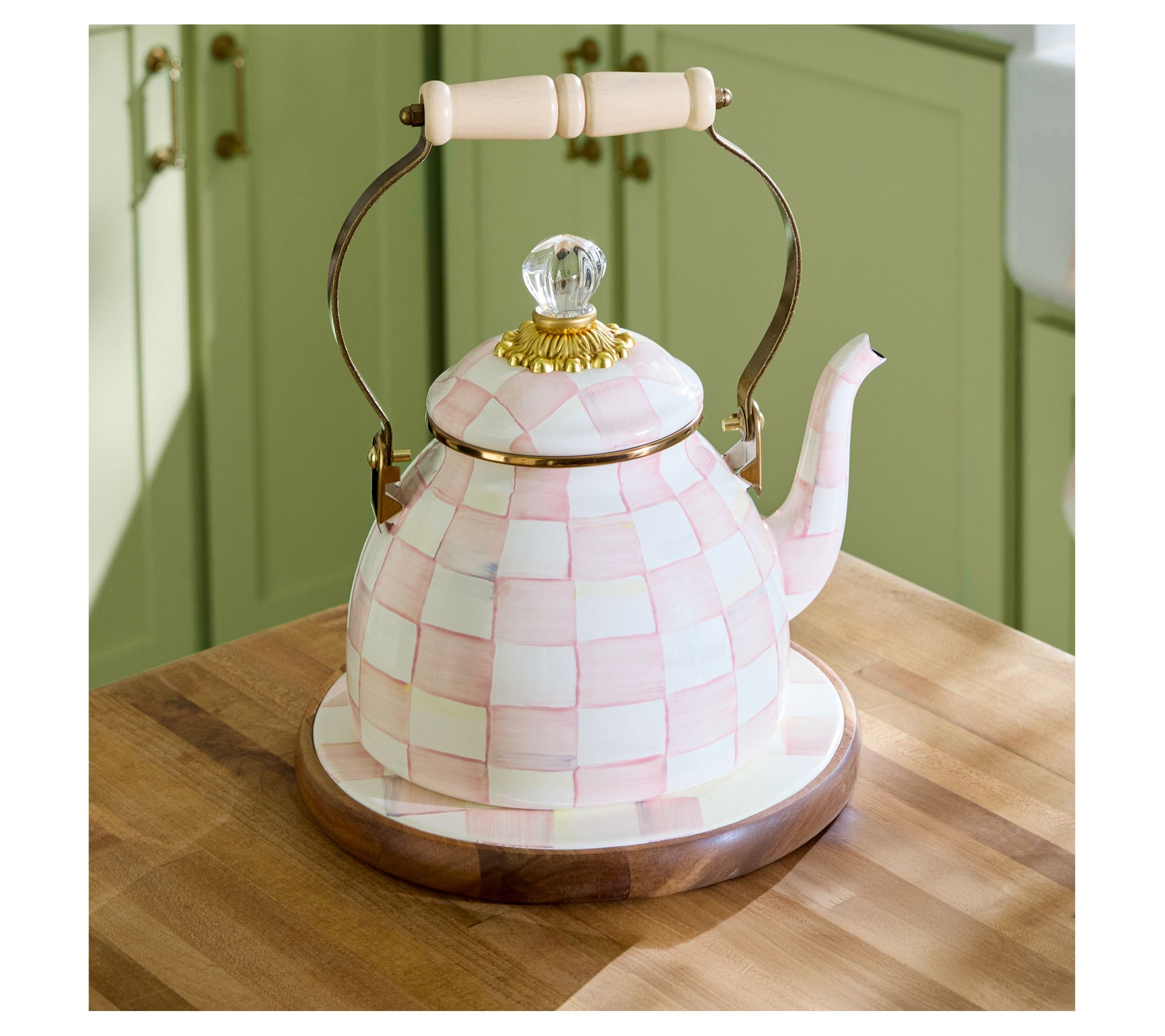 Complete your kitchen decor with an elegant touch using this large Check trivet by MacKenzie-Childs. Its striking hand-painted checks on a hand-glazed steel top make it a delightful centerpiece for any dining experience. Perfect for protecting surfaces from hot dishes, this trivet promises both functionality and style. Imagine setting a warm pie on the table, with this trivet showcasing a charming blend of hues, adding a sophisticated touch to your meal gatherings. From MacKenzie-Childs.