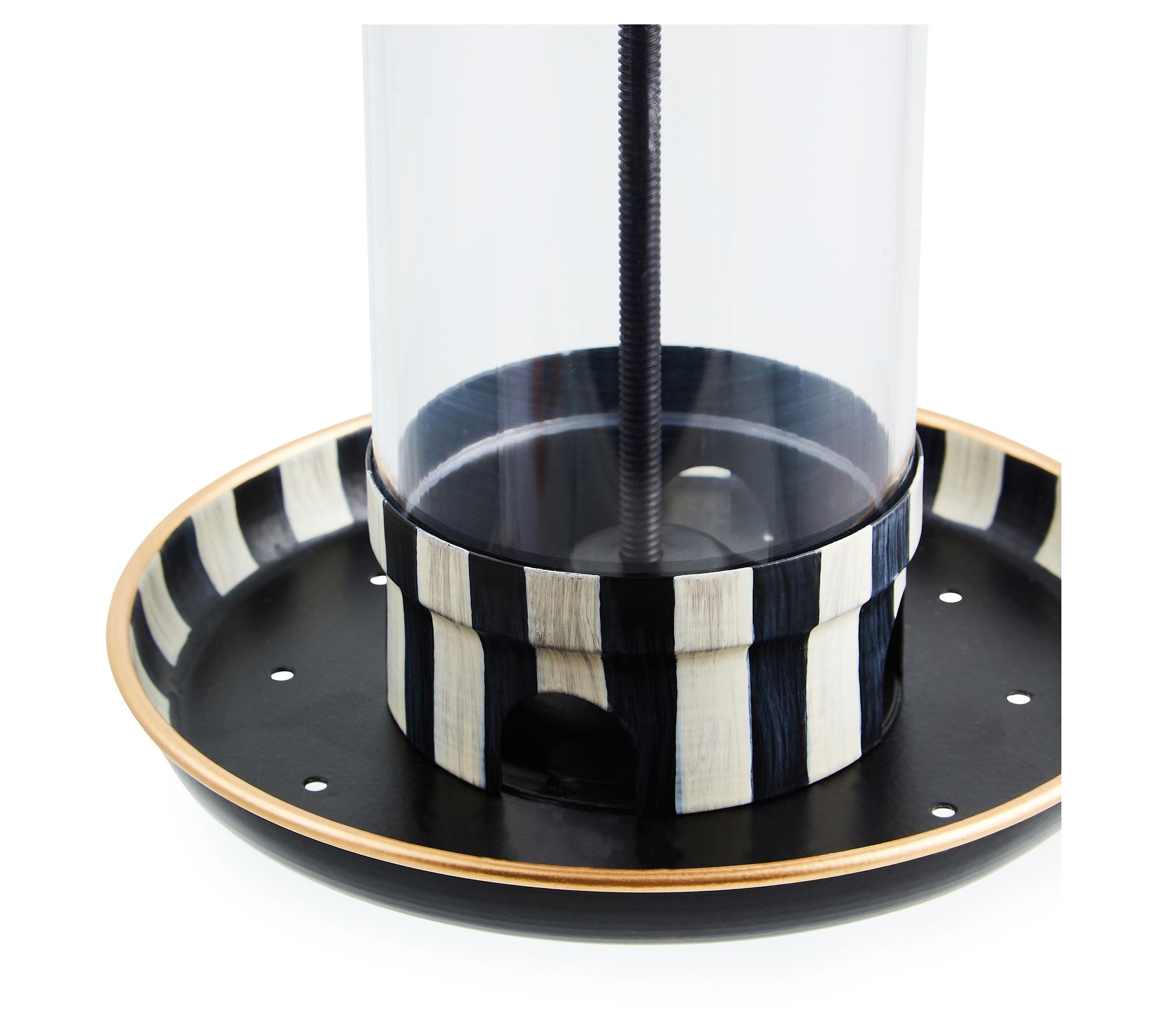 Birds of a feather are sure to flock to this MacKenzie-Childs Courtly bird feeder, featuring a metal and glass design. With a small tray on the bottom, this lovely feeder gives birds a place to perch and enjoy their meal. From MacKenzie-Childs.