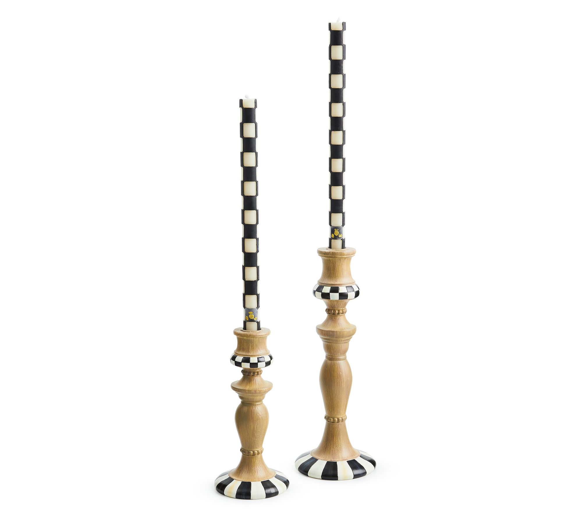 Add elegance to your table with this set of two candlesticks featuring a wood finish and hand-painted Courtly patterns. Each candlestick is designed to hold one of the signature dinner candles, bringing classic charm to any setting. From MacKenzie-Childs.