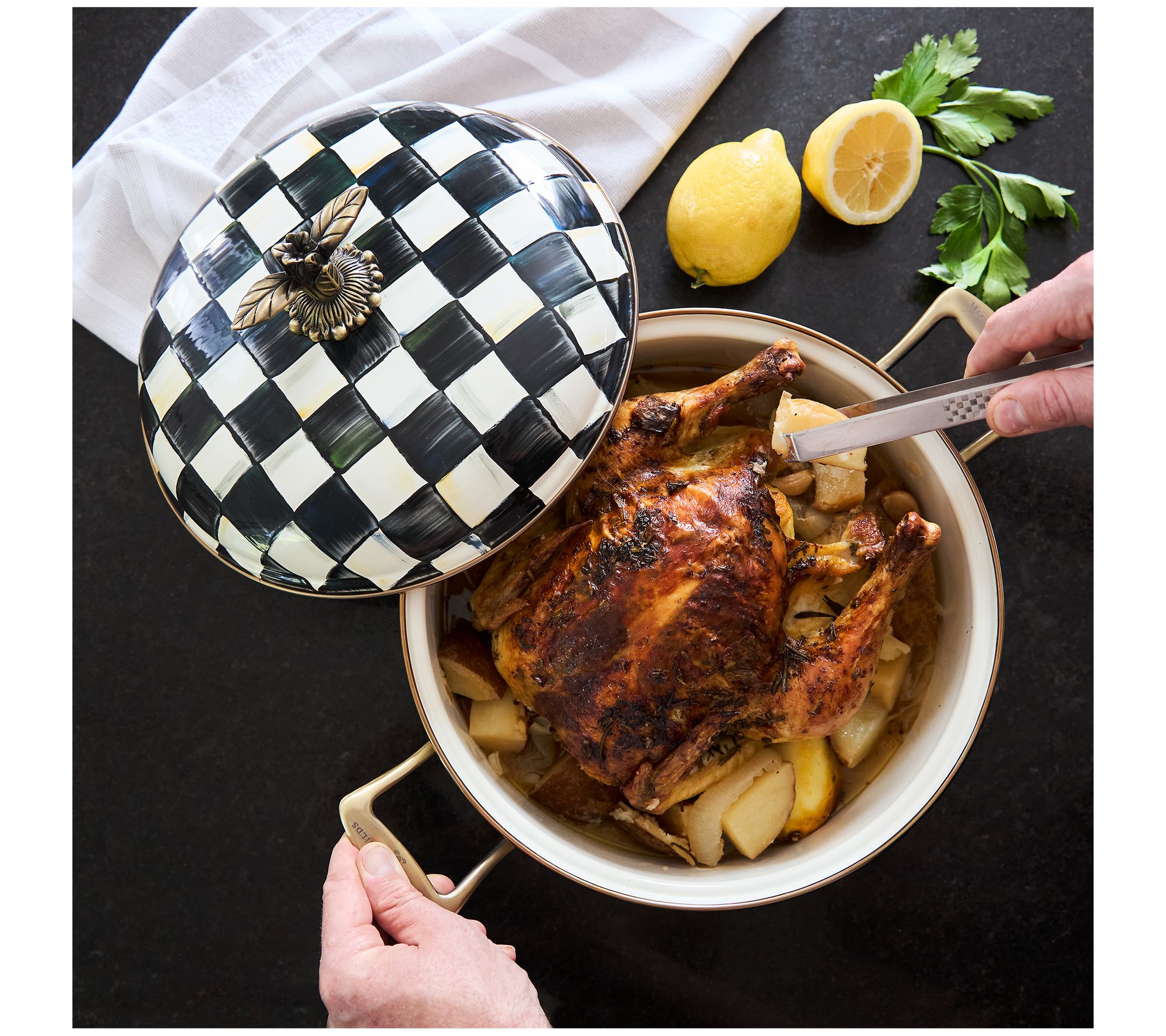 From stovetop to tableside, the MacKenzie-Childs Courtly Check 5-qt casserole transitions with more than a dash of panache. Imagine how your coveted casseroles will stand out when served up in a dish bedecked with the signature black and white pattern. And to top it all off, a blossoming bud serves as a standout and useful knob. From MacKenzie-Childs.