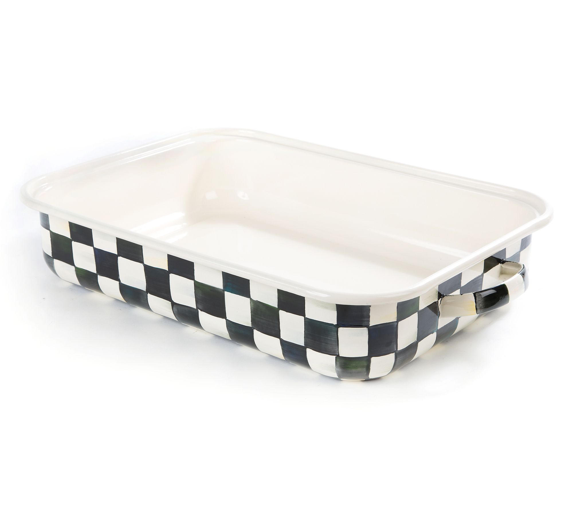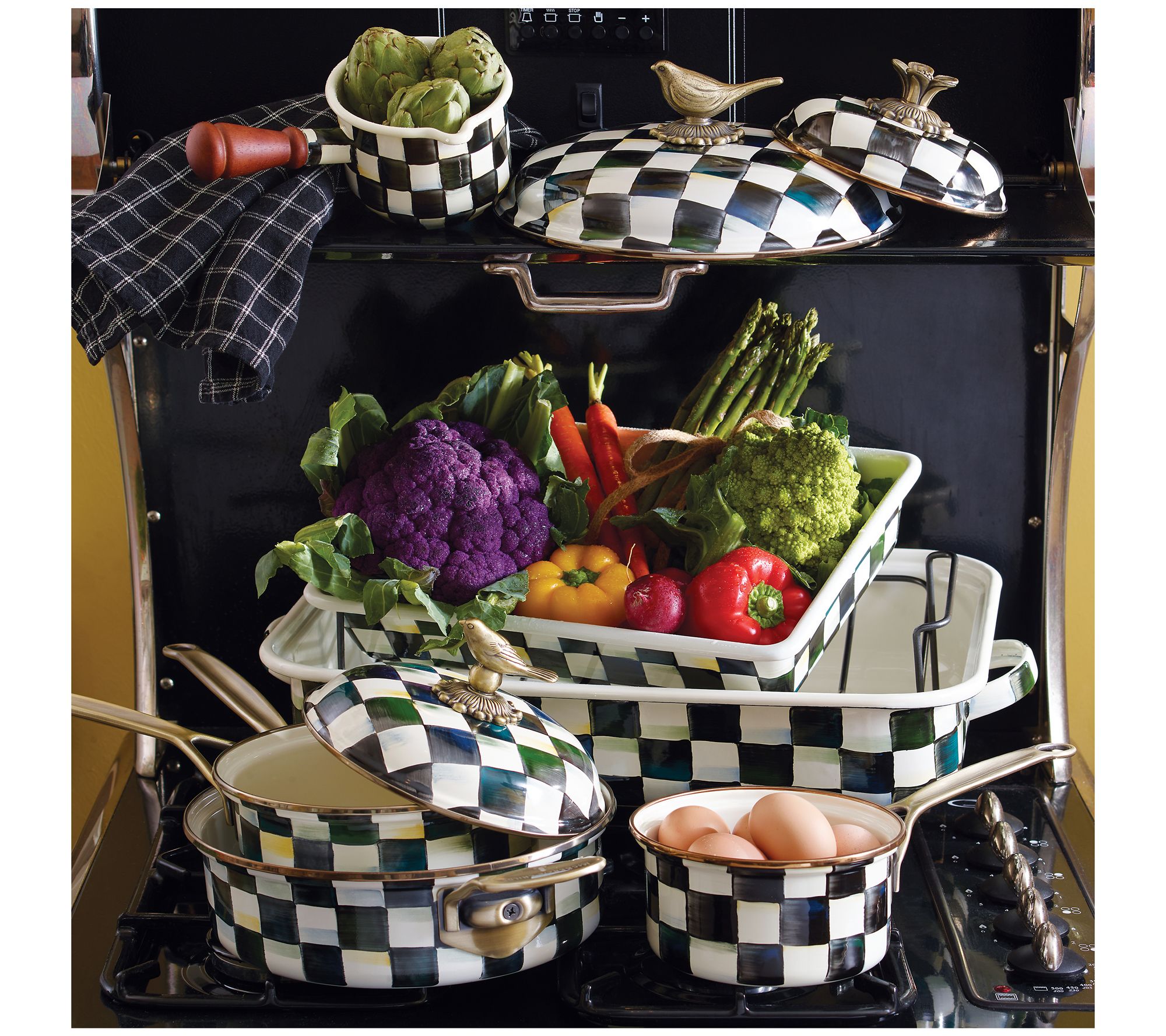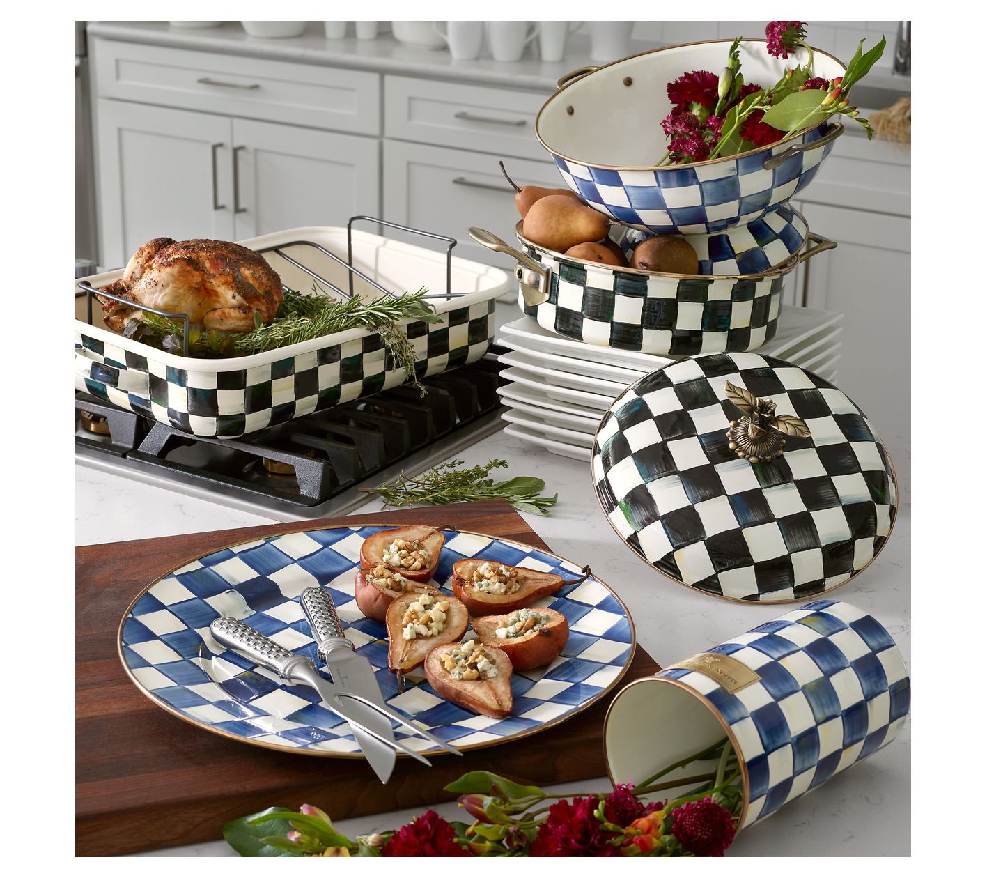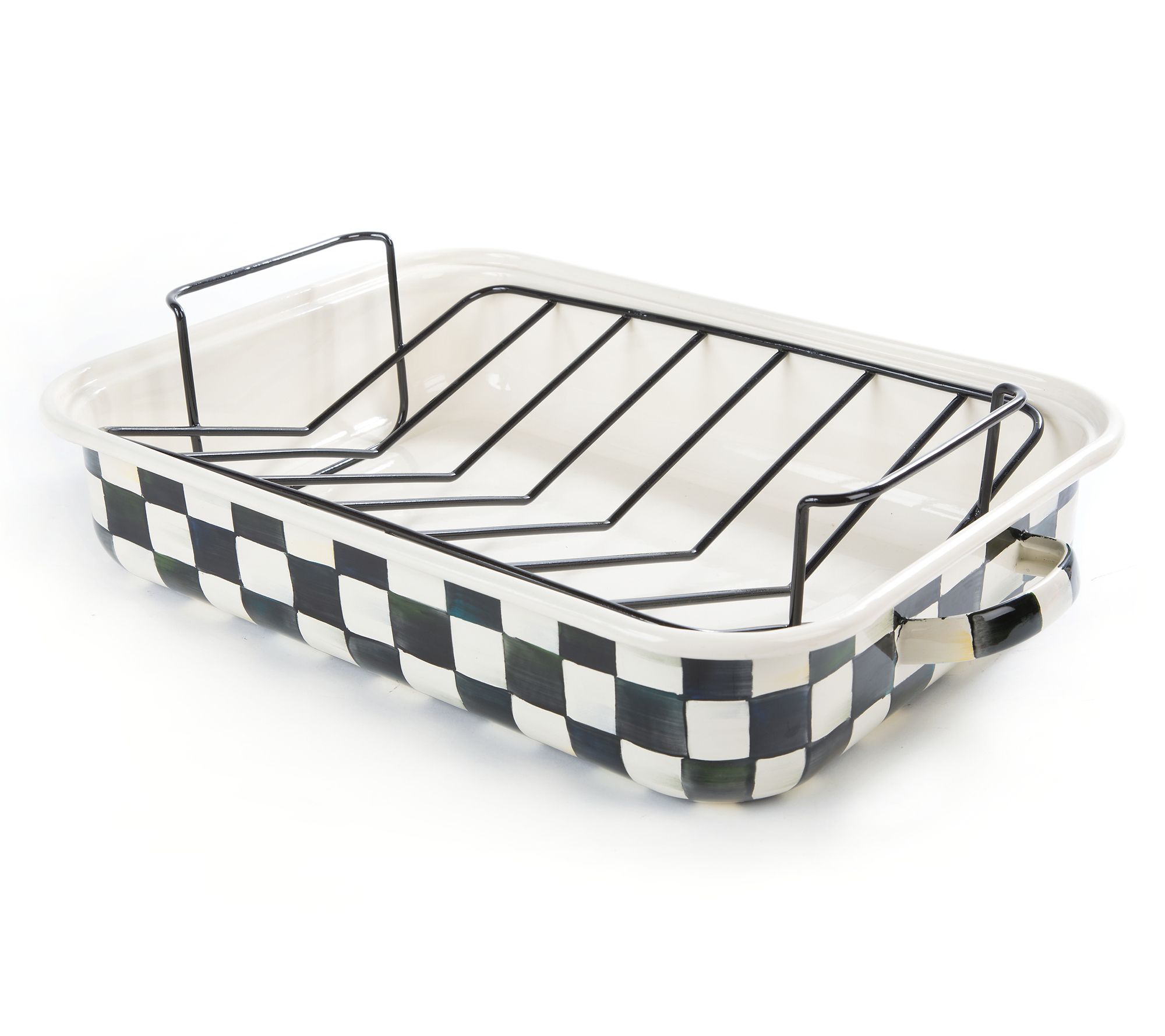 Imagine your next culinary masterpiece presented with flair in this MacKenzie-Childs Courtly Check Enamel Roasting Pan with Rack. Perfect for transitioning from the oven to the table, its signature black and white pattern adds a touch of elegance to your dinner spread. The included removable wire rack ensures preparation and presentation are equally flawless. From MacKenzie-Childs.
