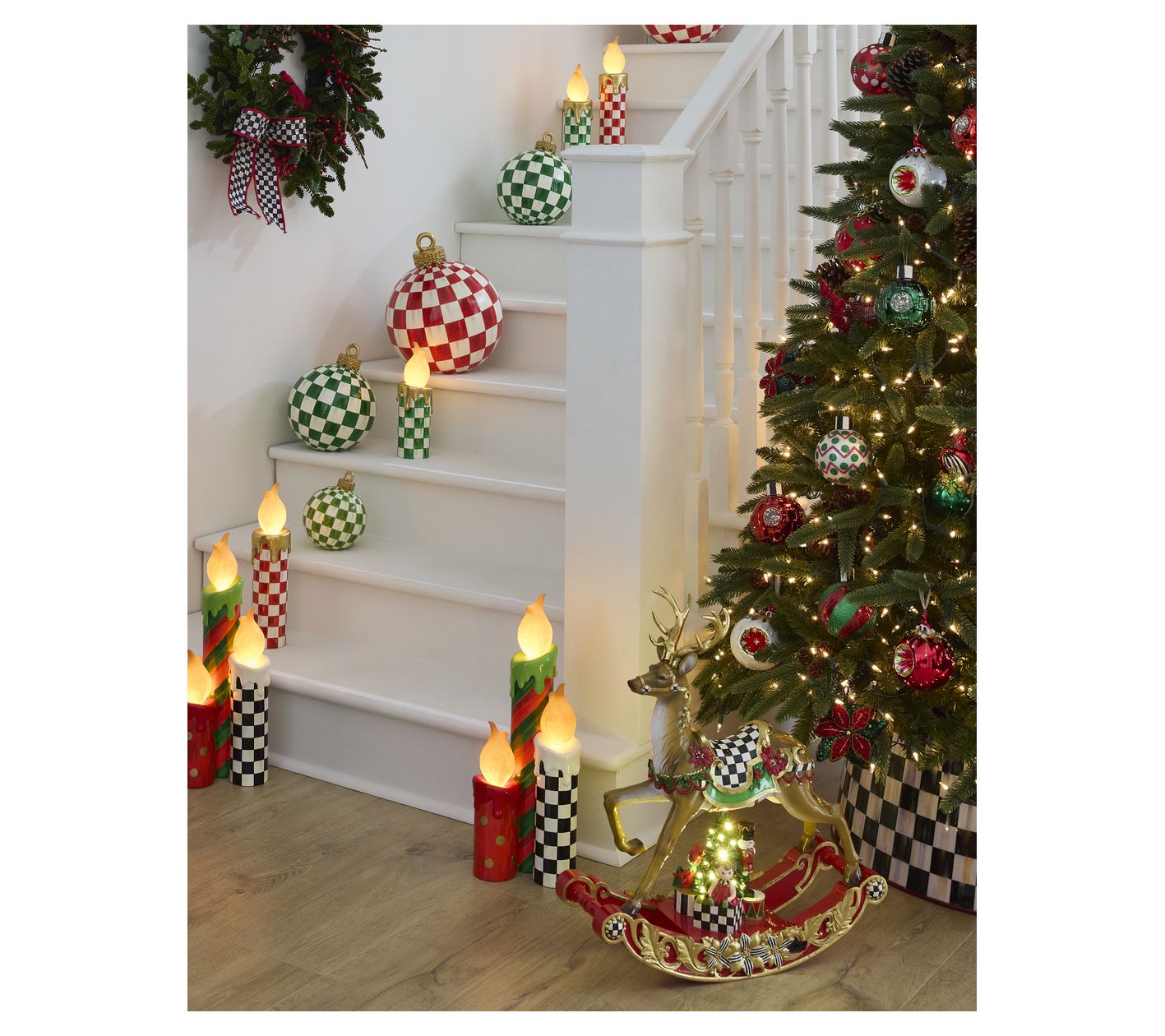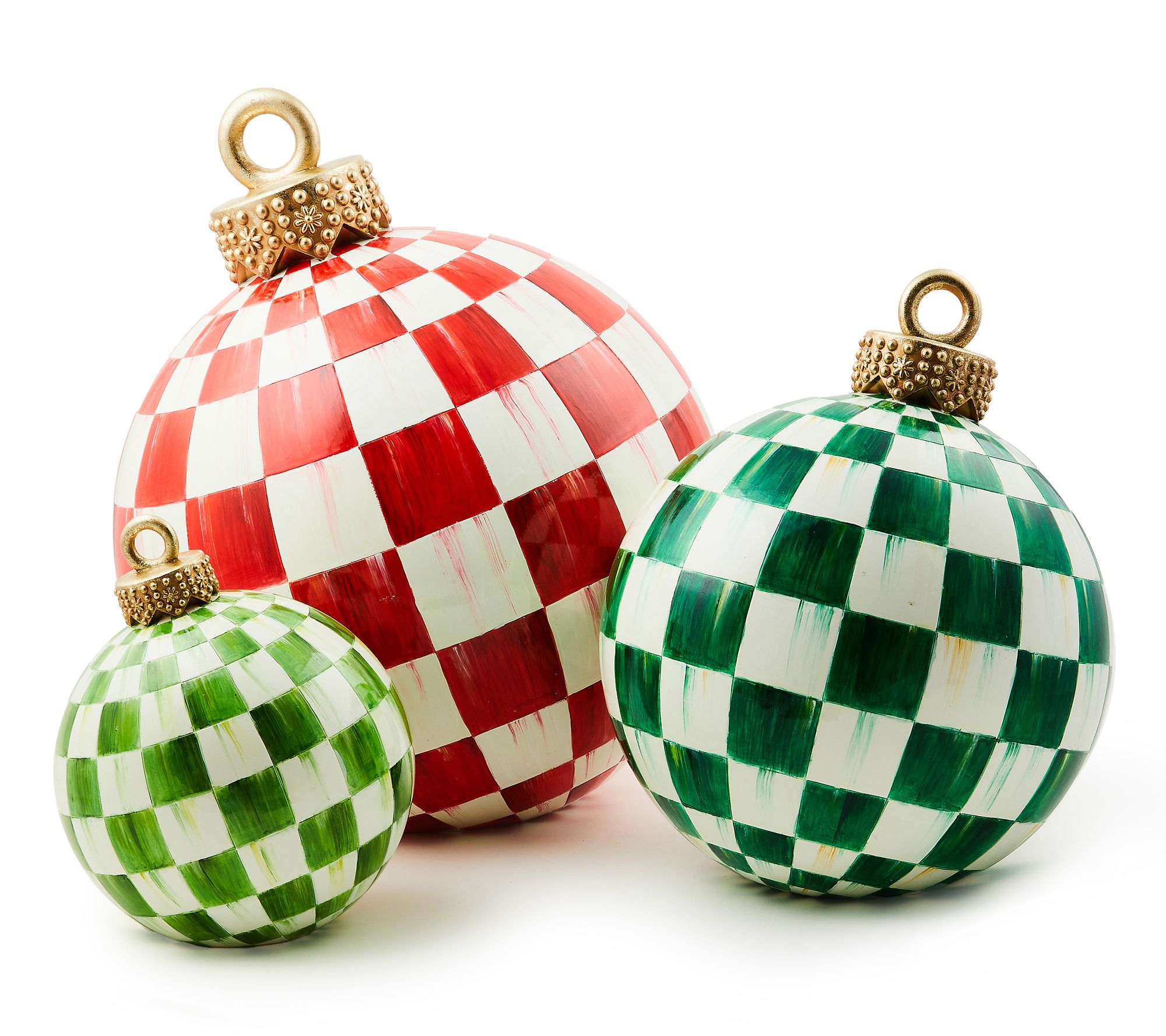 Add a touch of elegance to your holiday decor with the MacKenzie-Childs Dark Green Check Tabletop Ornament. This oversized piece features exquisite watercolor-style dark green checks and is crowned with a stunning gold foil cap, making it a standout addition to any festive setting. From MacKenzie-Childs.