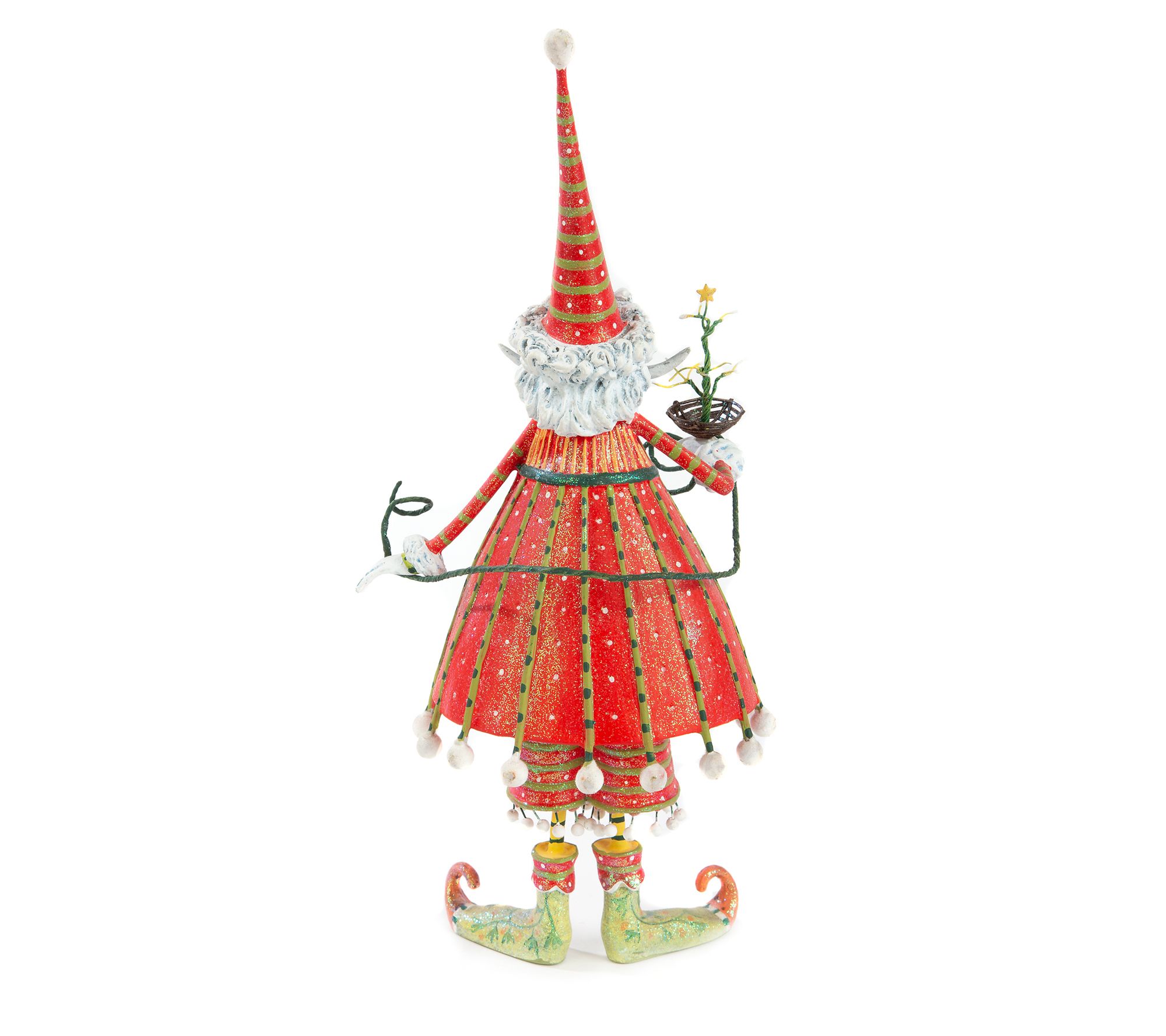 Celebrate the joy of the season with the Dash Away Dashing Santa figure, bringing the magic of 'Twas the Night Before Christmas to life. Dressed in his red suit with tiny checks, stripes, and dots, and trimmed in ball fringe, Santa keeps his pocket watch handy and carries a star-topped tree in a tiny twig nest. Perfect for adding a festive touch to your holiday decor. From MacKenzie-Childs.