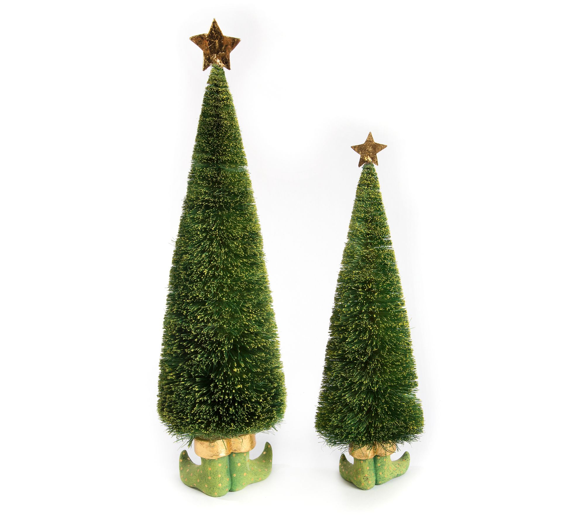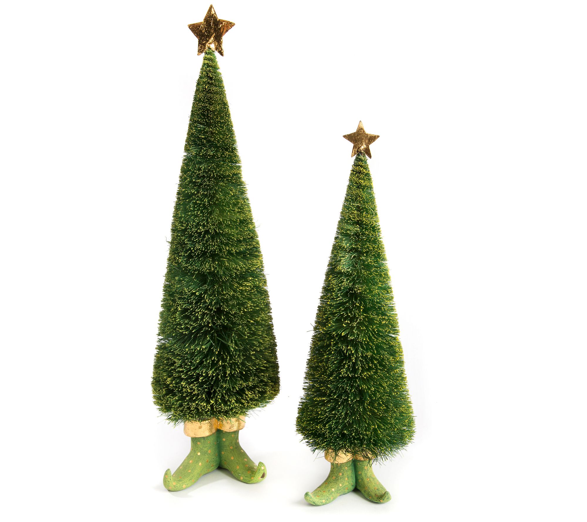 Add a touch of whimsical charm to your holiday decor with this pair of Dash Away sisal elf tree figures. Inspired by the timeless classic 'Twas the Night Before Christmas, these delightful trees feature elf boot feet with gold-leafed accents and a beautiful star on top. Perfect for enhancing any seasonal display. From MacKenzie-Childs.