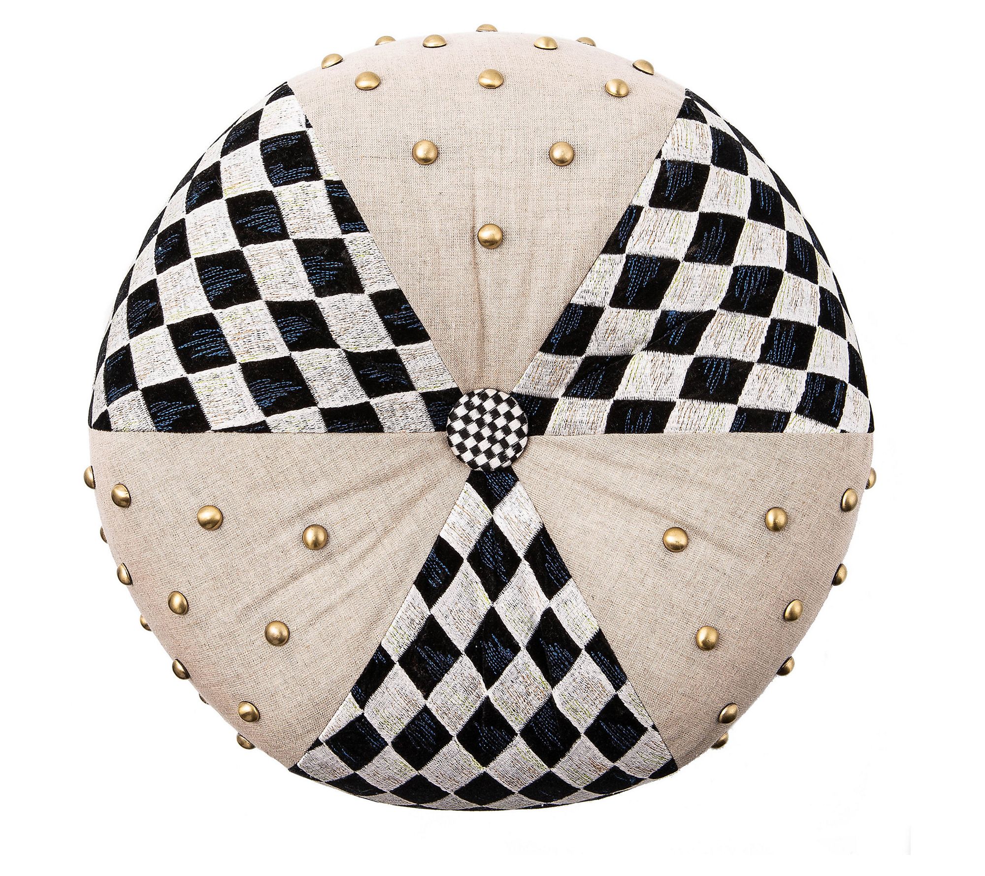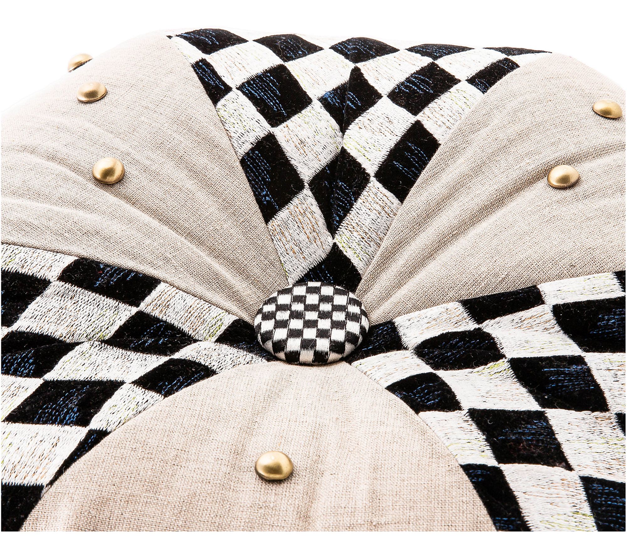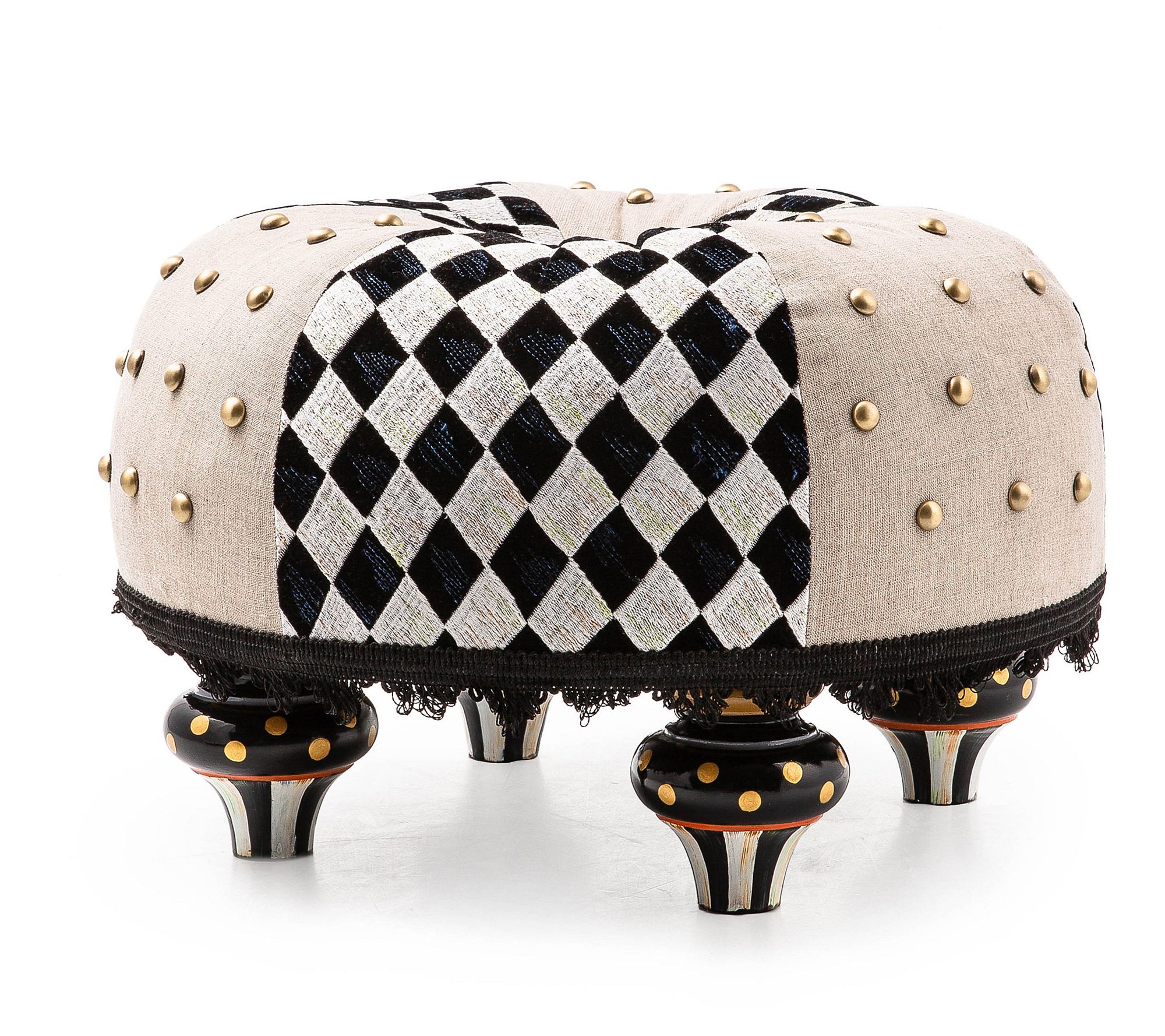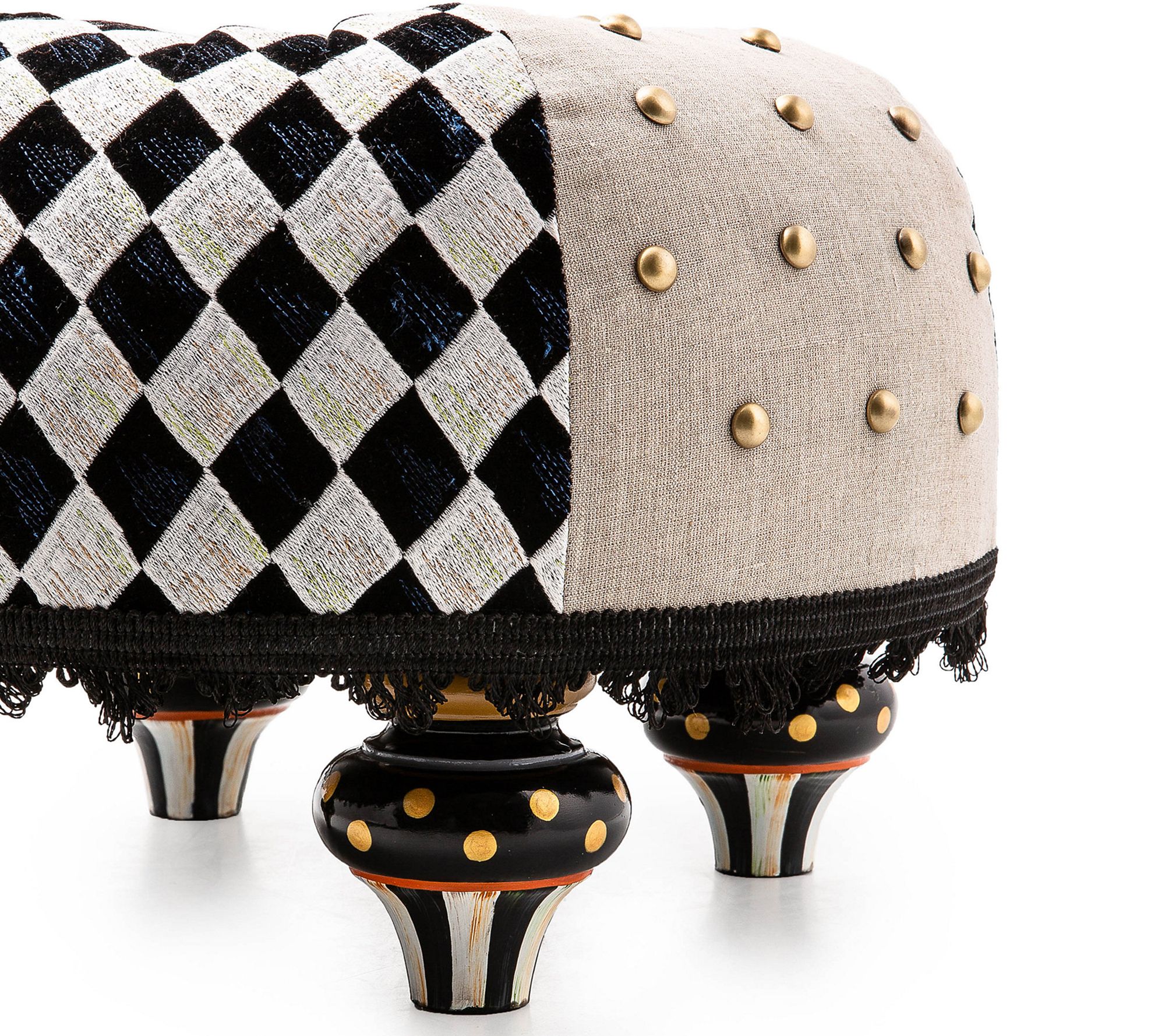 Add a touch of whimsy to your living space with this plush patterned footstool. Its charming design, featuring alternating harlequin diamonds and brass-finished beads, brings a playful yet elegant vibe to any room. From MacKenzie-Childs.