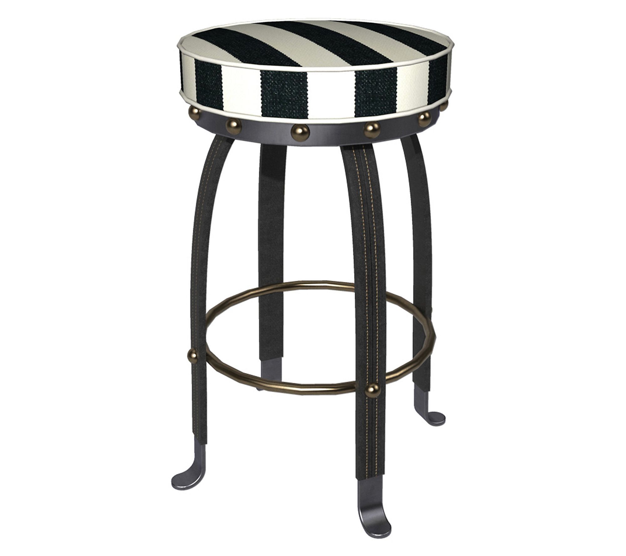 Elevate your home bar or kitchen island with this fun stool, featuring a seamless blend of functionality and artful design. This piece boasts metal legs wrapped in leather, brass button details, and a comfortably cushioned seat in chenille black stripe for a touch of elegance. From MacKenzie-Childs.