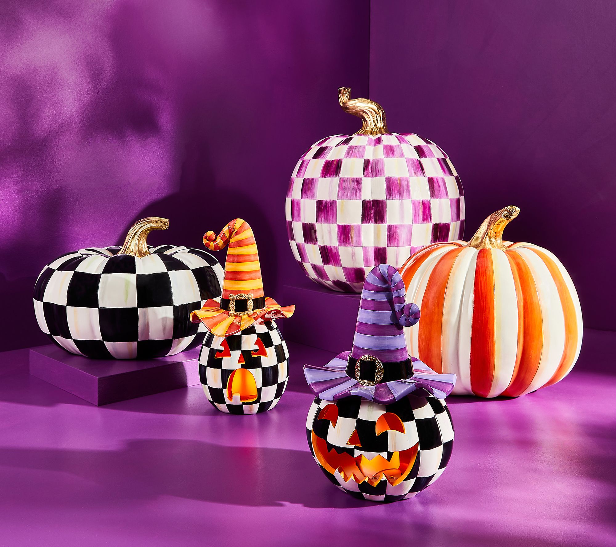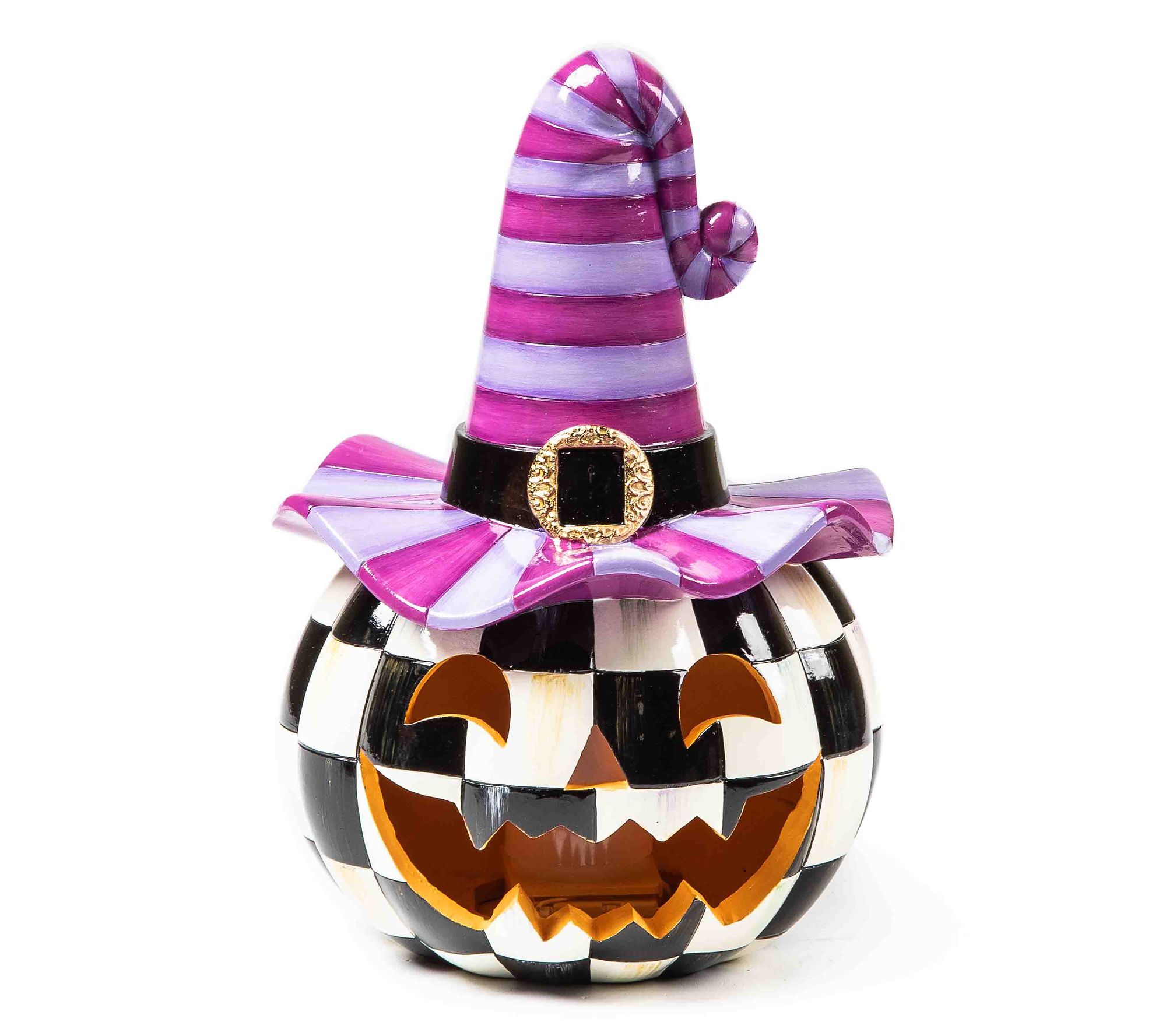 Set Halloween aglow with the MacKenzie-Childs illuminated happy jack pumpkin with a purple hat. This delightful decoration features a Courtly Check pattern and comes to life with a battery-operated LED light, adding a whimsical touch to your spooky festivities. From MacKenzie-Childs.