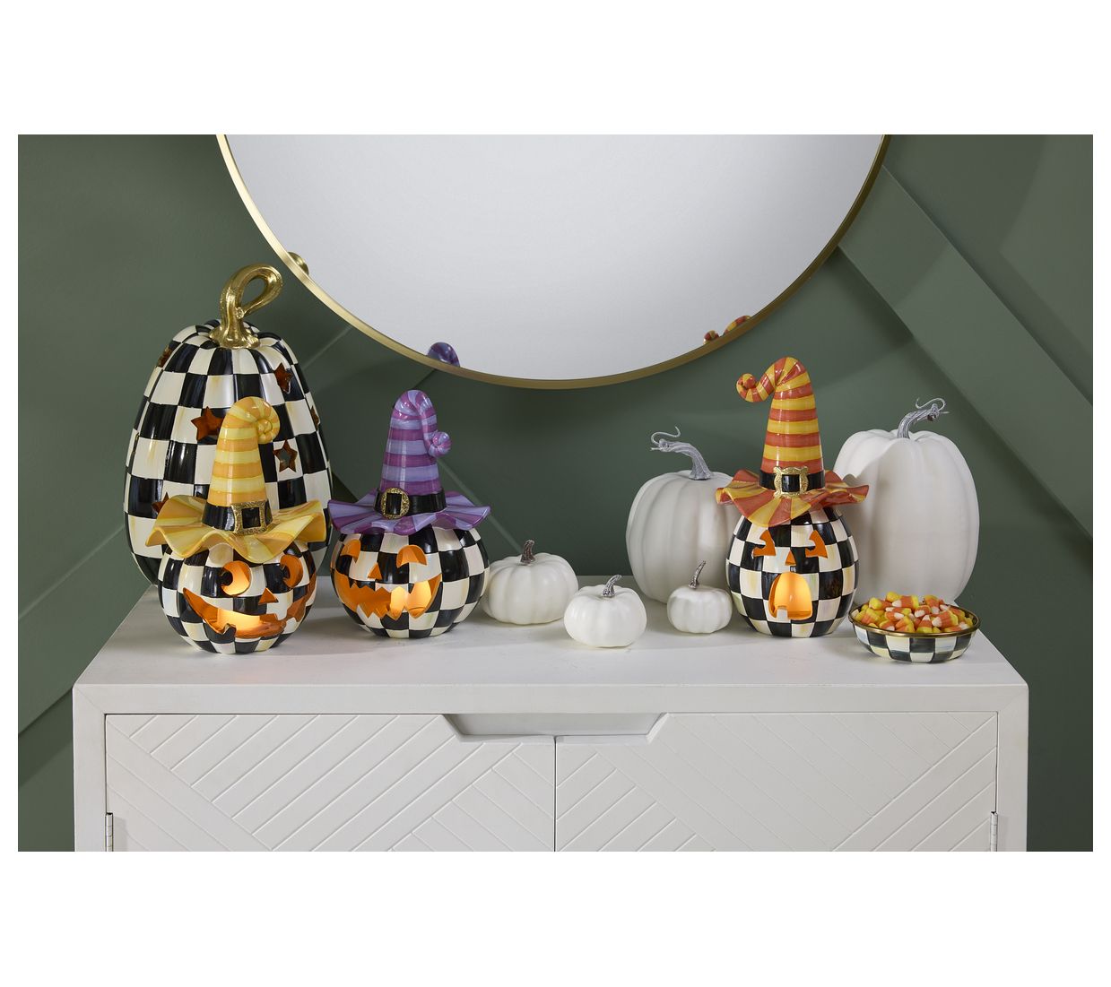 Take your pick from the most unusual pumpkin patch with the MacKenzie-Childs illuminated happy jack pumpkin. Featuring a cheerful face topped with a striped witch's hat, this piece is illuminated by a battery-operated light to bring a whimsical glow to your decor. From MacKenzie-Childs.