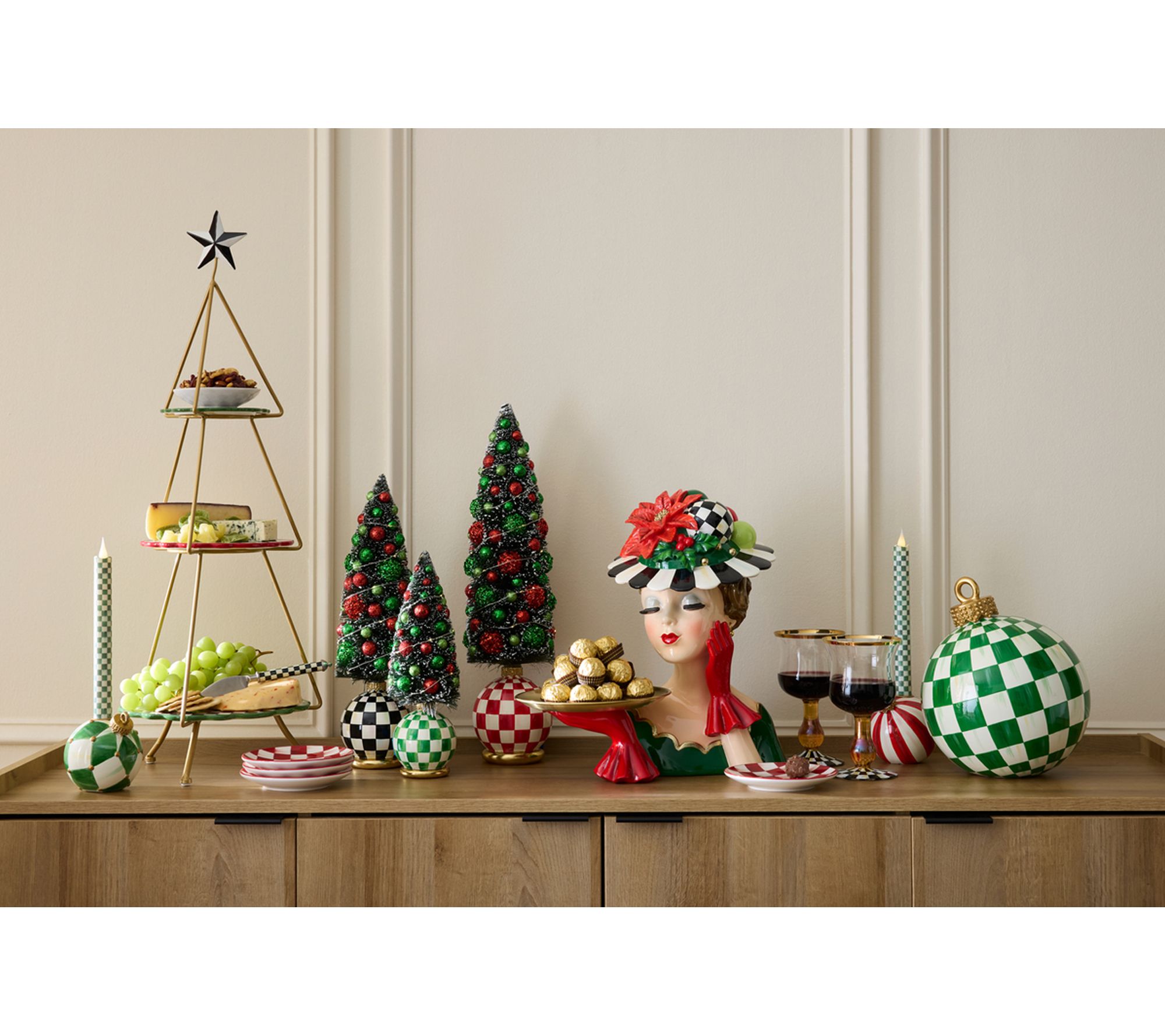 Brighten up your holiday gatherings with this illuminated bottle brush tree, designed to bring MacKenzie-Childs signature style to your seasonal decor. Frosted branches topped with festive baubles shimmer with LED light, while its iconic red checked ornament base adds a cheerful touch to any mantel or tabletop display. From MacKenzie-Childs.