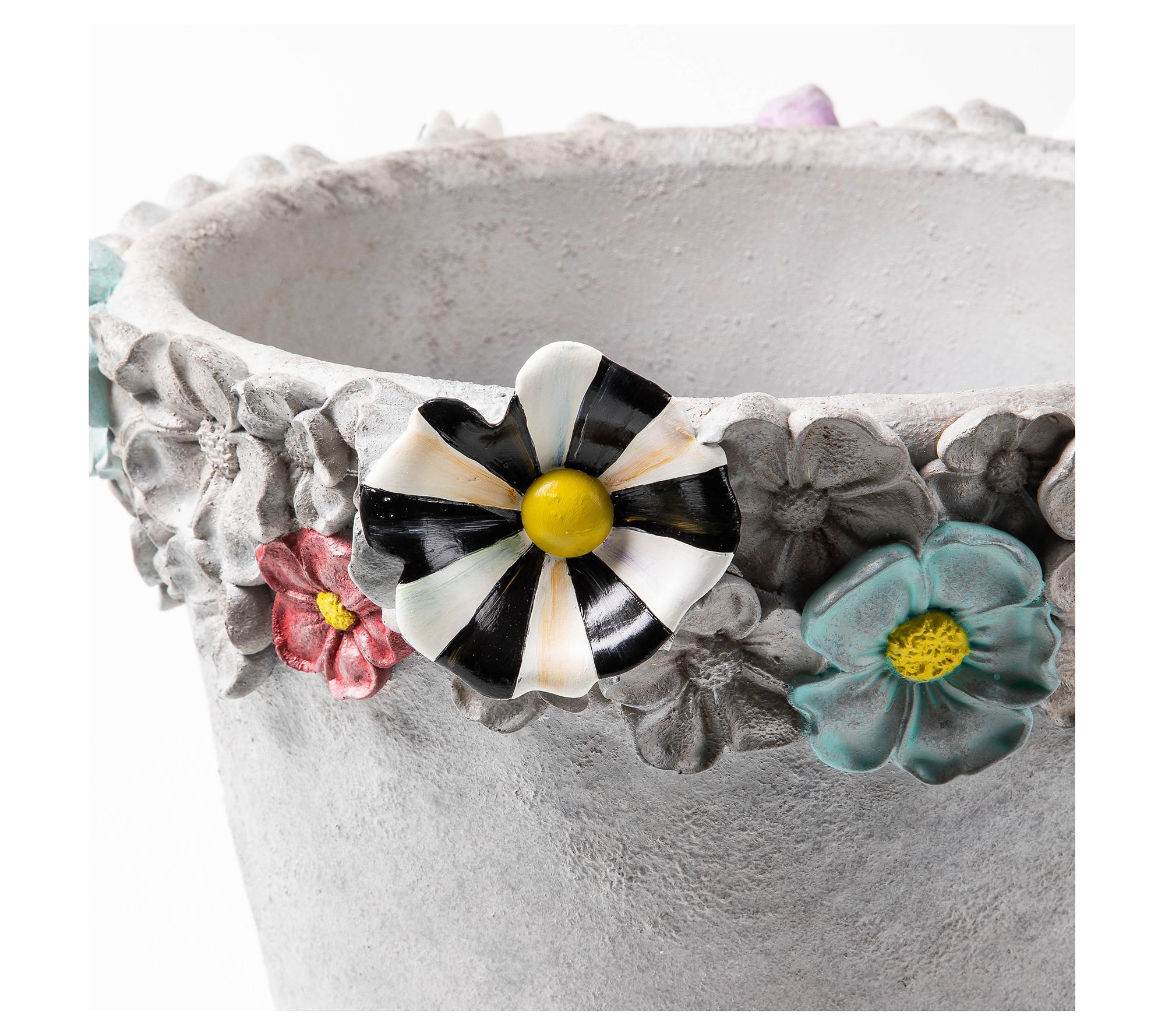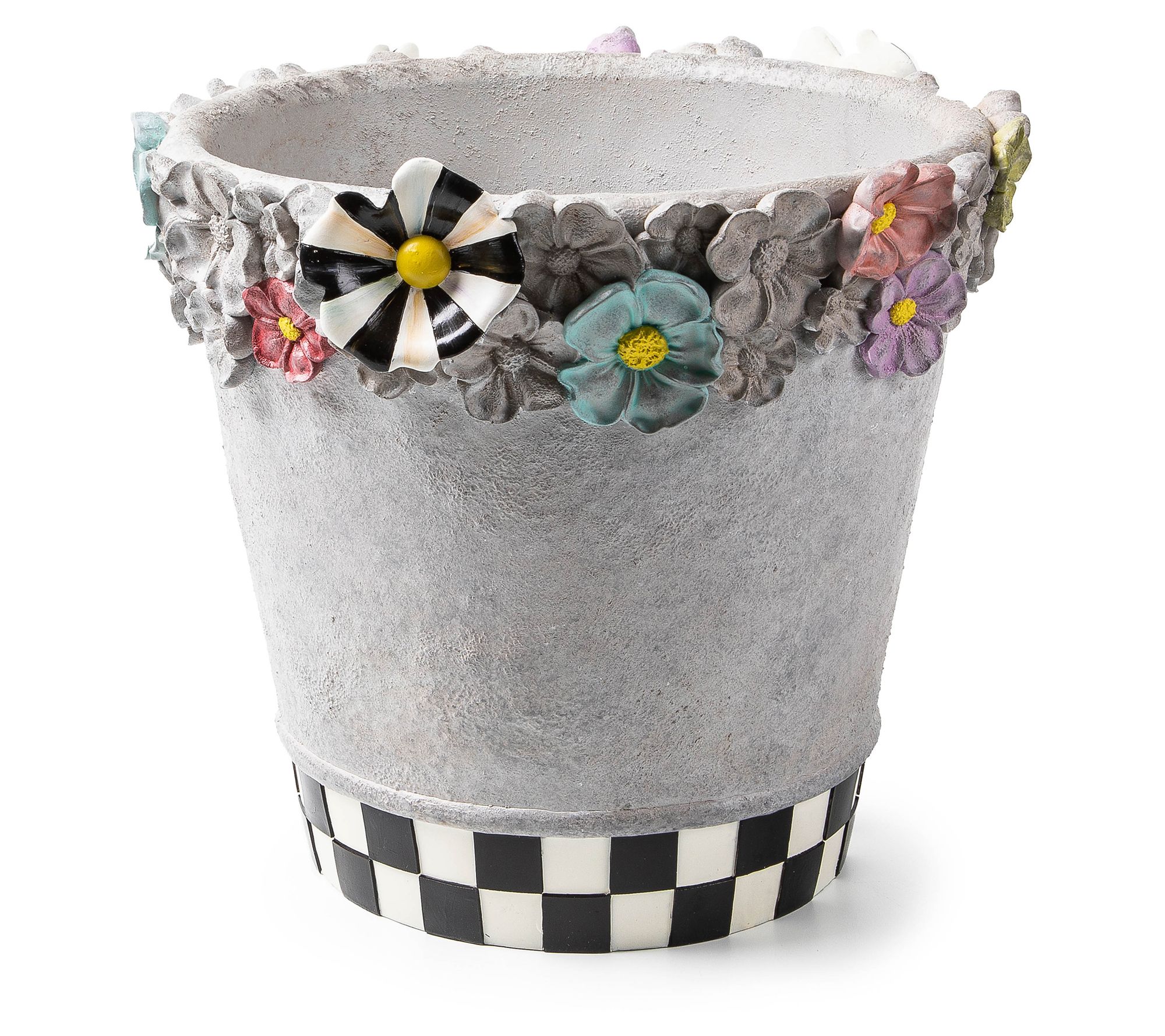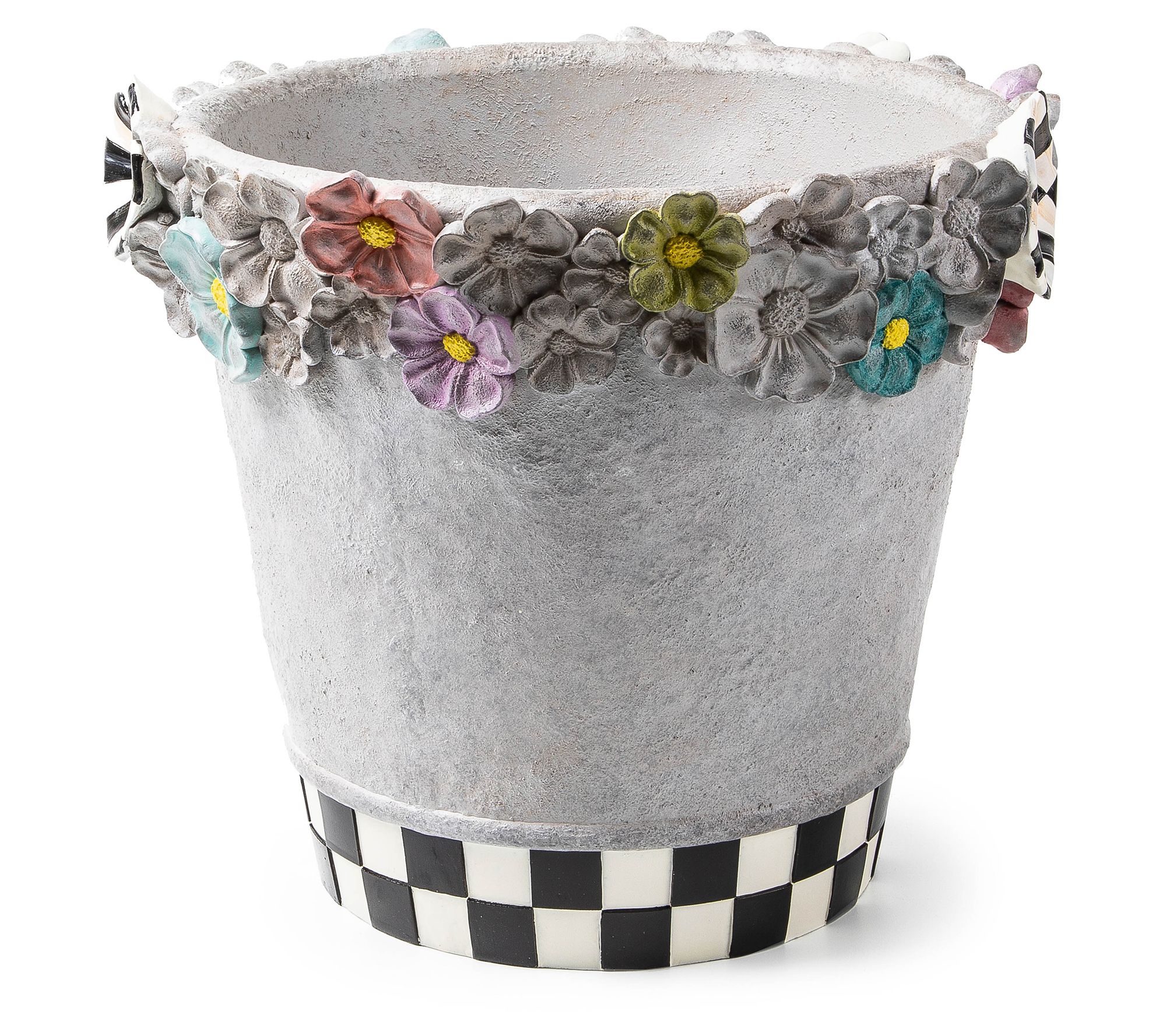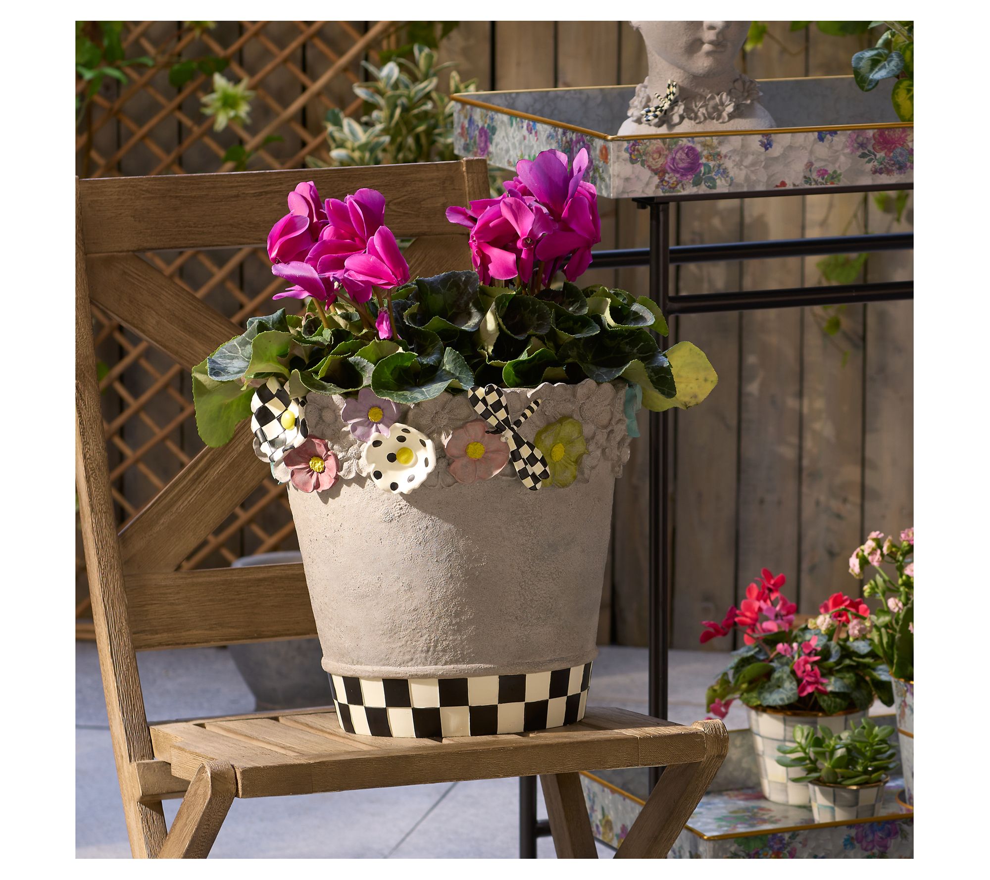 Transform your garden or patio into a whimsical retreat with the Maia large pot. Crafted from durable resin with a concrete finish, this planter showcases dimensional, painted florals and a Courtly Check and Stripe dragonfly, making it a standout piece for displaying your favorite container plants, real or faux. From MacKenzie-Childs.