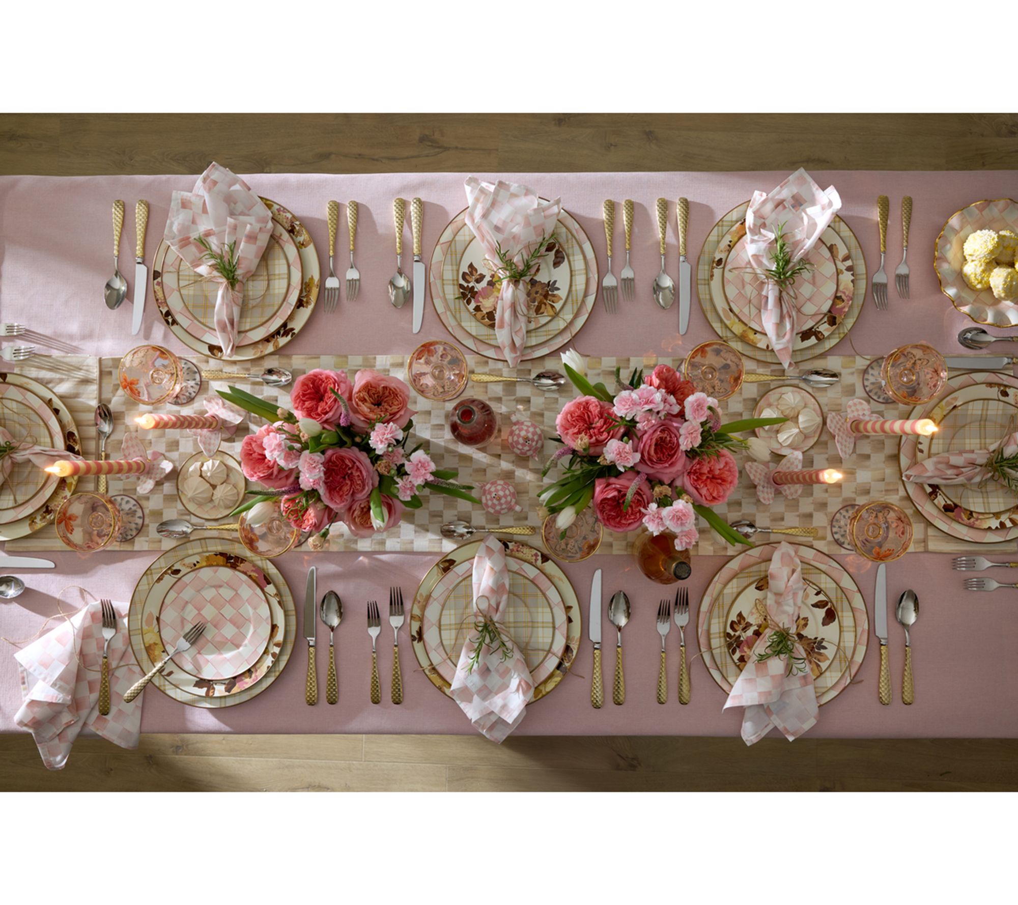 Cozy up your dining room or sideboard with the MacKenzie-Childs Mocha Check table runner. The coffee-colored check pattern, complemented by a mocha stripe border, adds a warm and inviting touch to any setting. It reverses to solid mocha for a versatile look. From MacKenzie-Childs.