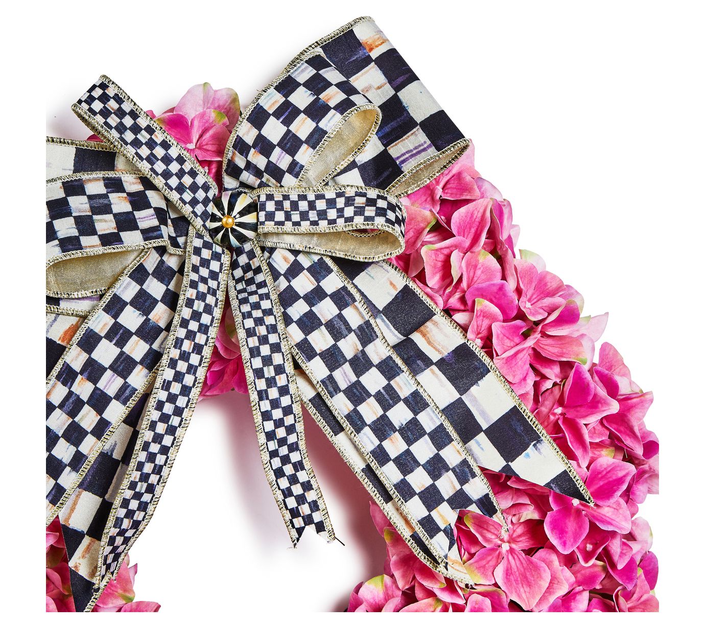 Welcome guests with the timeless charm of this lifelike pink hydrangea wreath by MacKenzie-Childs. Trimmed with Courtly Check ribbon and crowned with a Courtly Stripe button, this beautiful wreath delivers a warm, inviting aesthetic to any entryway. From MacKenzie-Childs.