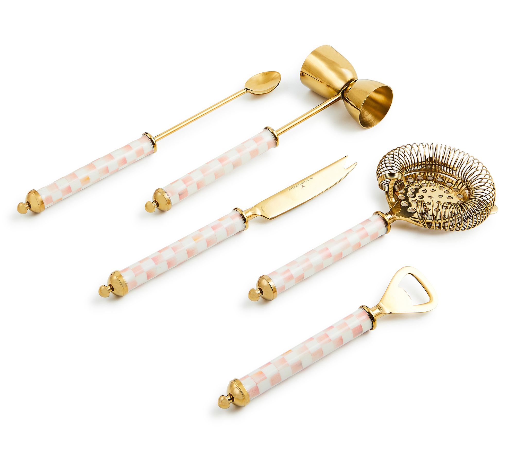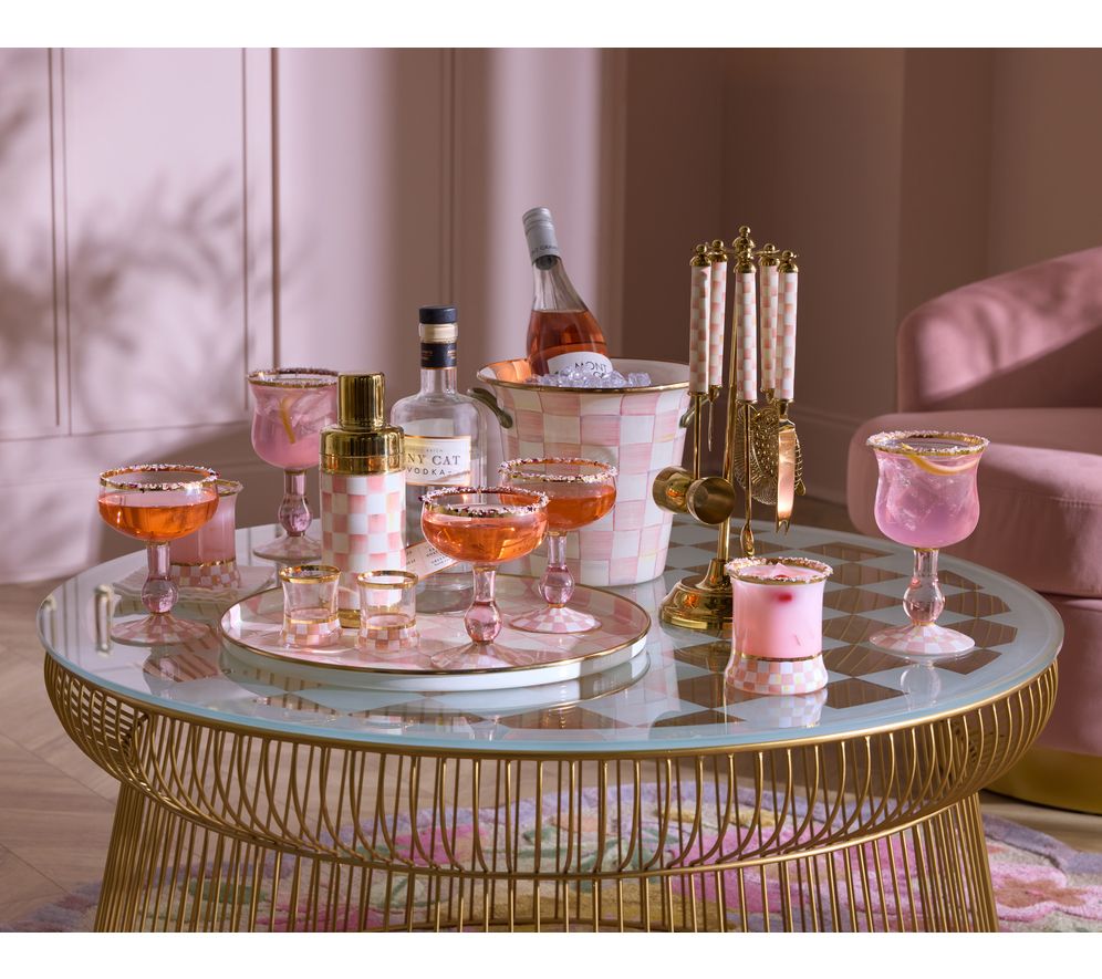 Transform your home bar experience with the MacKenzie-Childs Rosy Check 3260 Gold Bar Tool Set. This elegant ensemble will have you mixing perfect drinks, from Moscow mules to martinis, with a touch of sophistication and style. Each piece features the signature Rosy Check design and fits neatly on the included stand, adding a chic statement to your bar area. From MacKenzie-Childs.