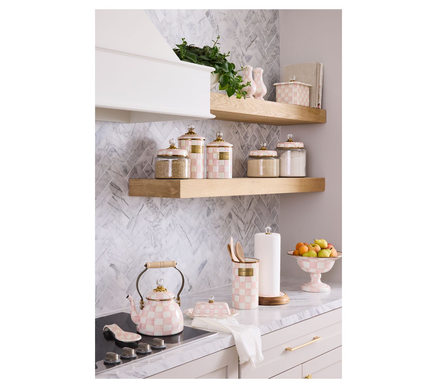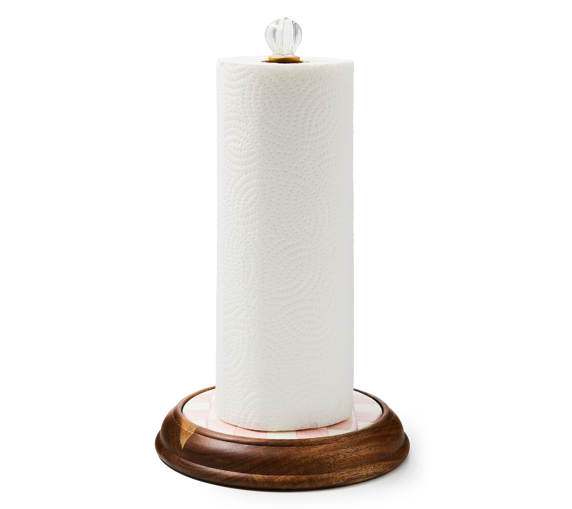 Add a dash of elegance to your kitchen with the MacKenzie-Childs rosy check wood paper towel holder. This stylish piece features hand-painted rosy hues on a charming enamel plate, beautifully complemented by an acacia wood base. The stainless steel center post and clear glass finial not only add sophistication but also ensure durability. From MacKenzie-Childs.