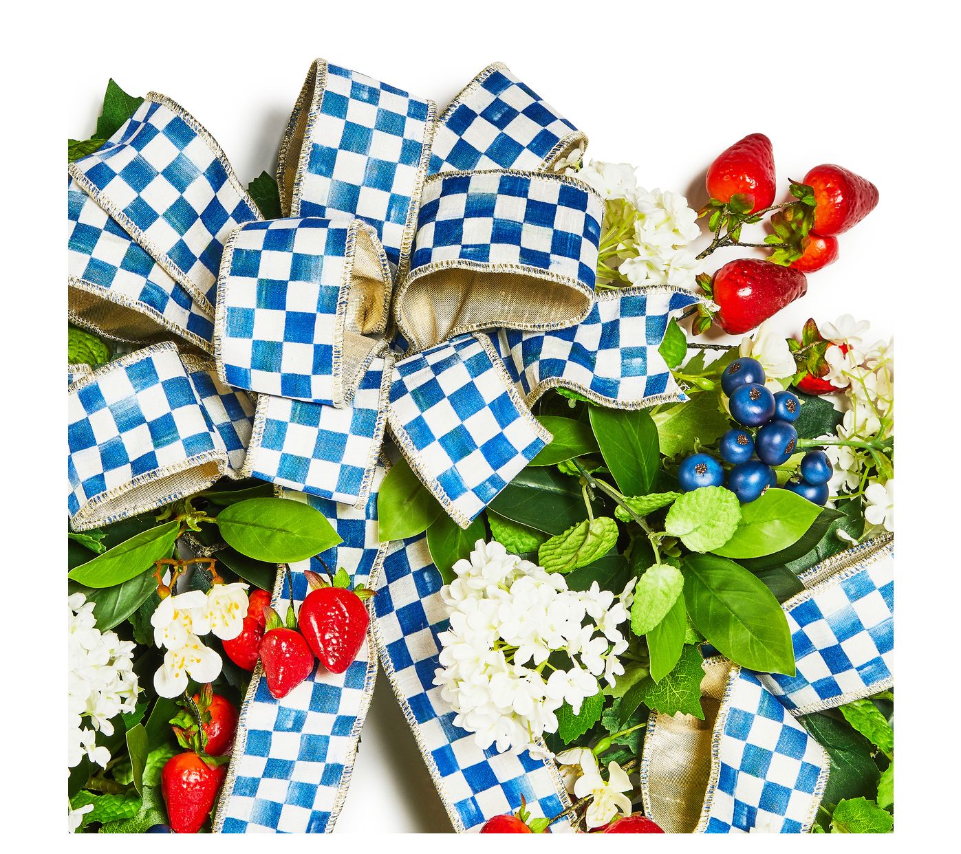 Extend a warm welcome with this charming wreath, featuring a mix of everlasting strawberries and blueberries, elegantly trimmed with Royal Check ribbon. This festive accent brightens up any entryway or indoor space with its vibrant colors and lifelike details. From MacKenzie-Childs.
