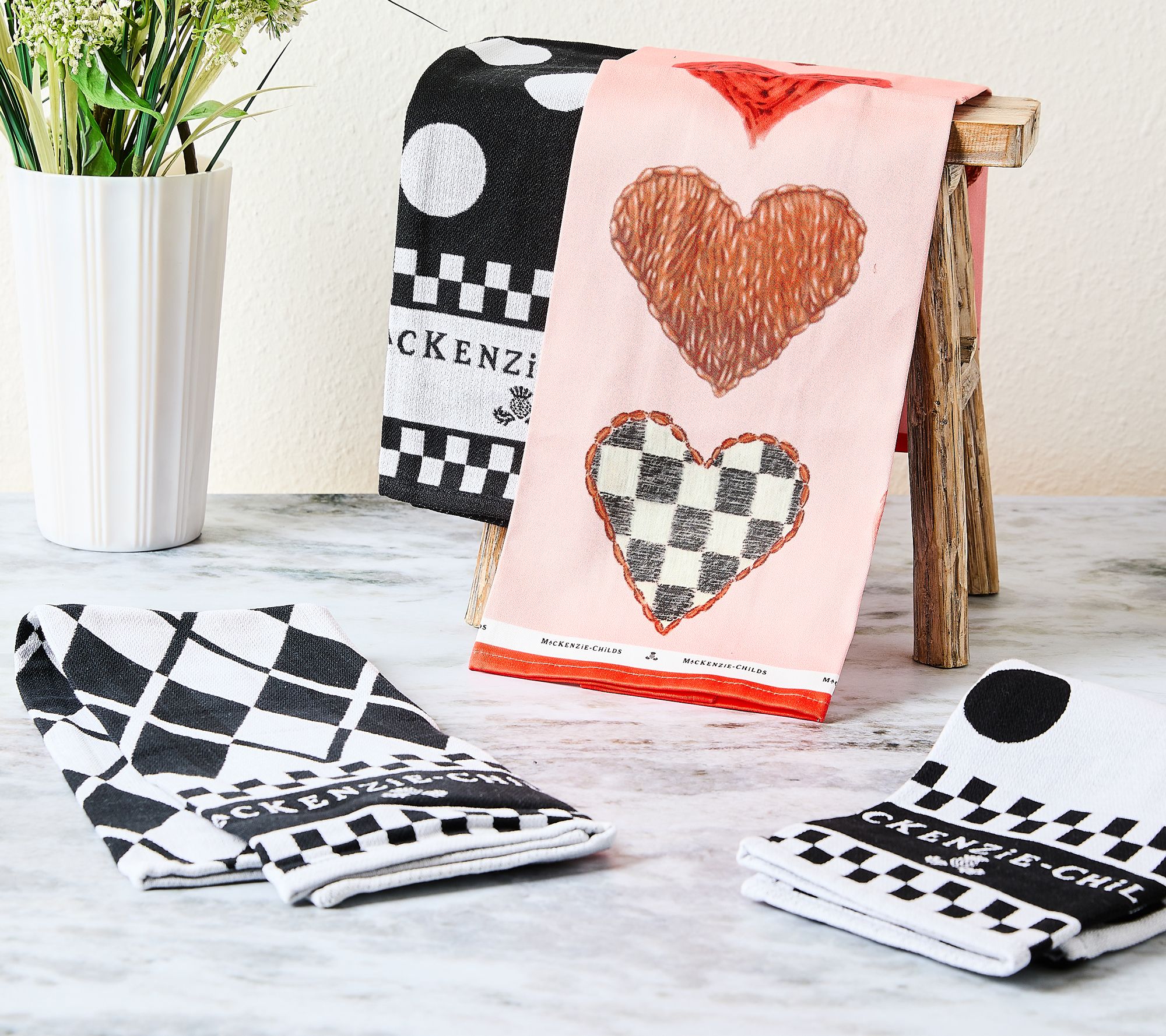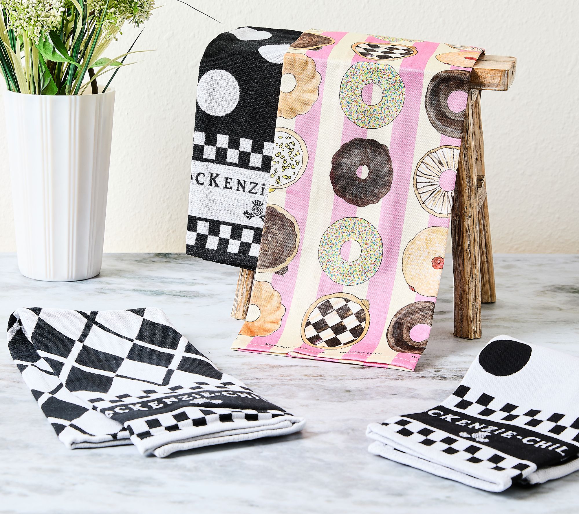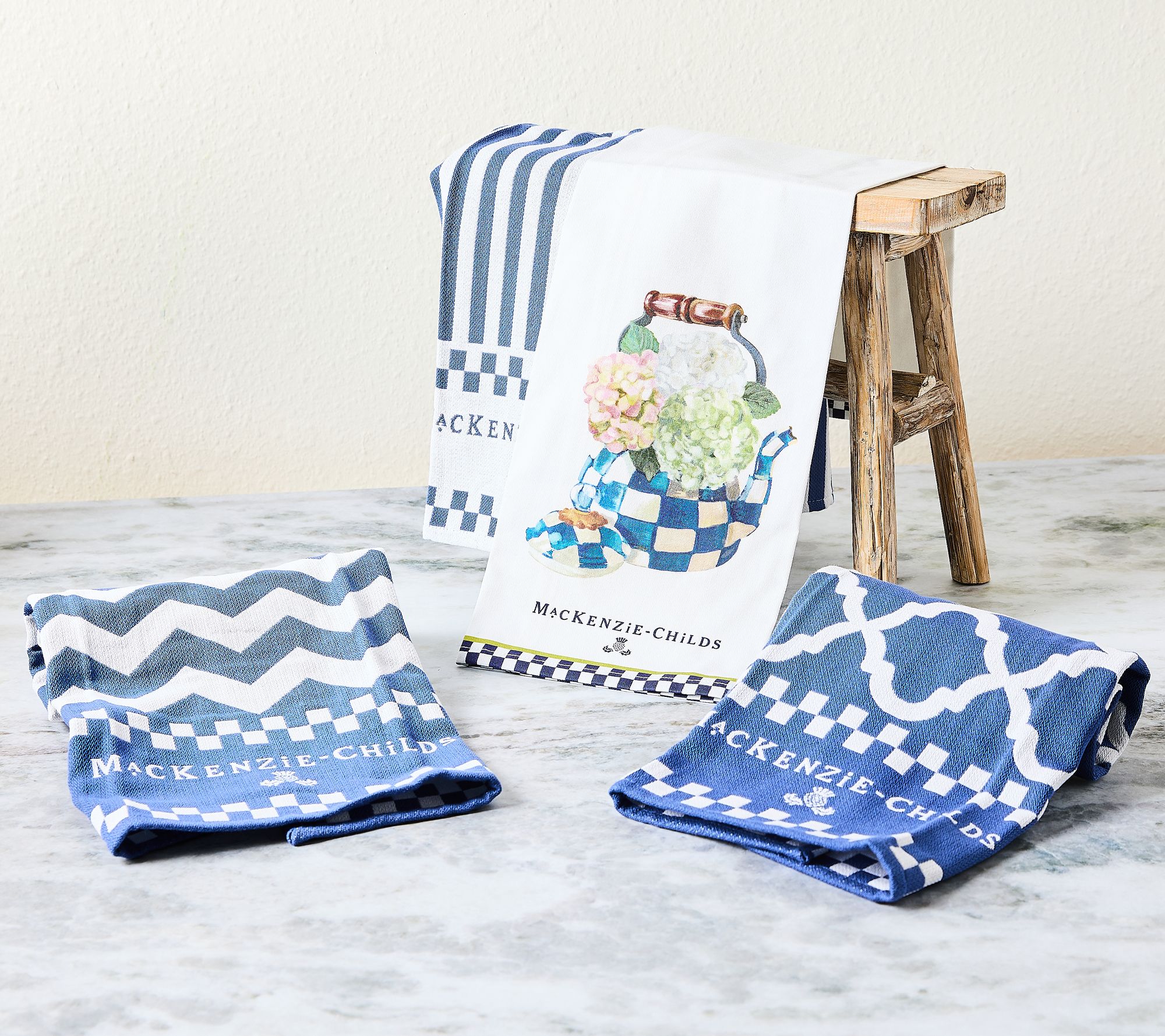 Add whimsy to your kitchen with this delightful set of four dish towels from MacKenzie-Childs. Perfect for drying dishes or adding decorative flair to your space, these towels feature fun woven patterns and the MacKenzie-Childs logo. Make everyday tasks a bit more cheerful and stylish. From MacKenzie-Childs.