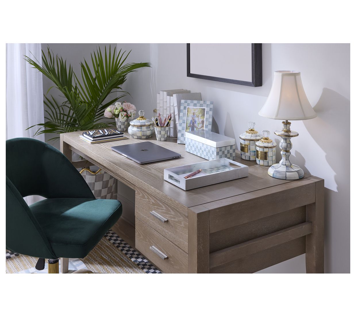 Personalize any space with the timeless elegance of the MacKenzie-Childs Sterling Check Lacquer Frame. Perfect for displaying your cherished 4" x 6" photos, its printed Sterling Check surface, layered with lacquer and accented with silver leaf, adds a touch of sophistication to your decor. From MacKenzie-Childs.