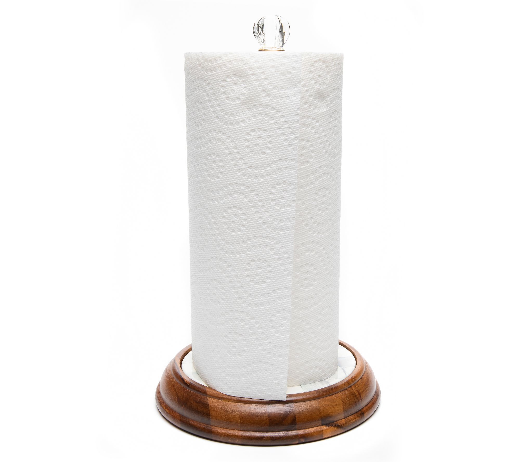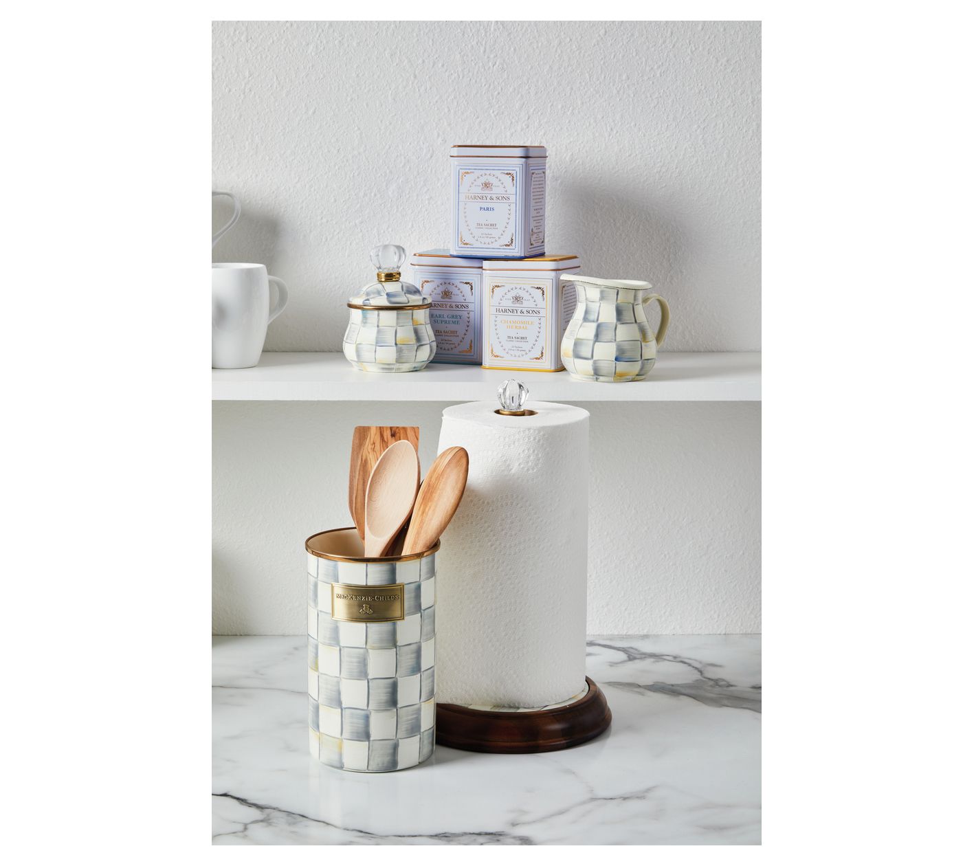 Make your kitchen a little brighter with the MacKenzie-Childs Sterling Check wood paper towel holder. The beautiful hand-painted checks in grey hues on the enamel plate, complemented by a wooden base and stainless steel post, make everyday cleanups a bit more stylish. From MacKenzie-Childs.