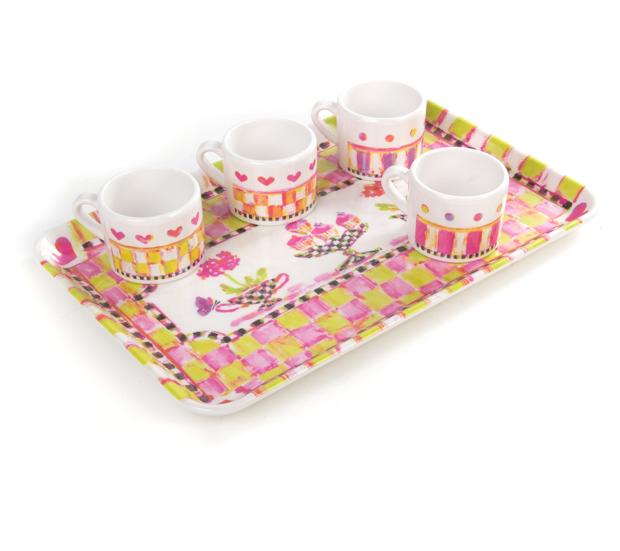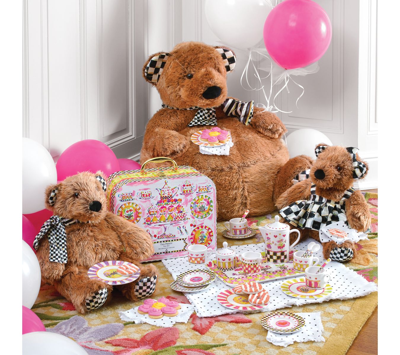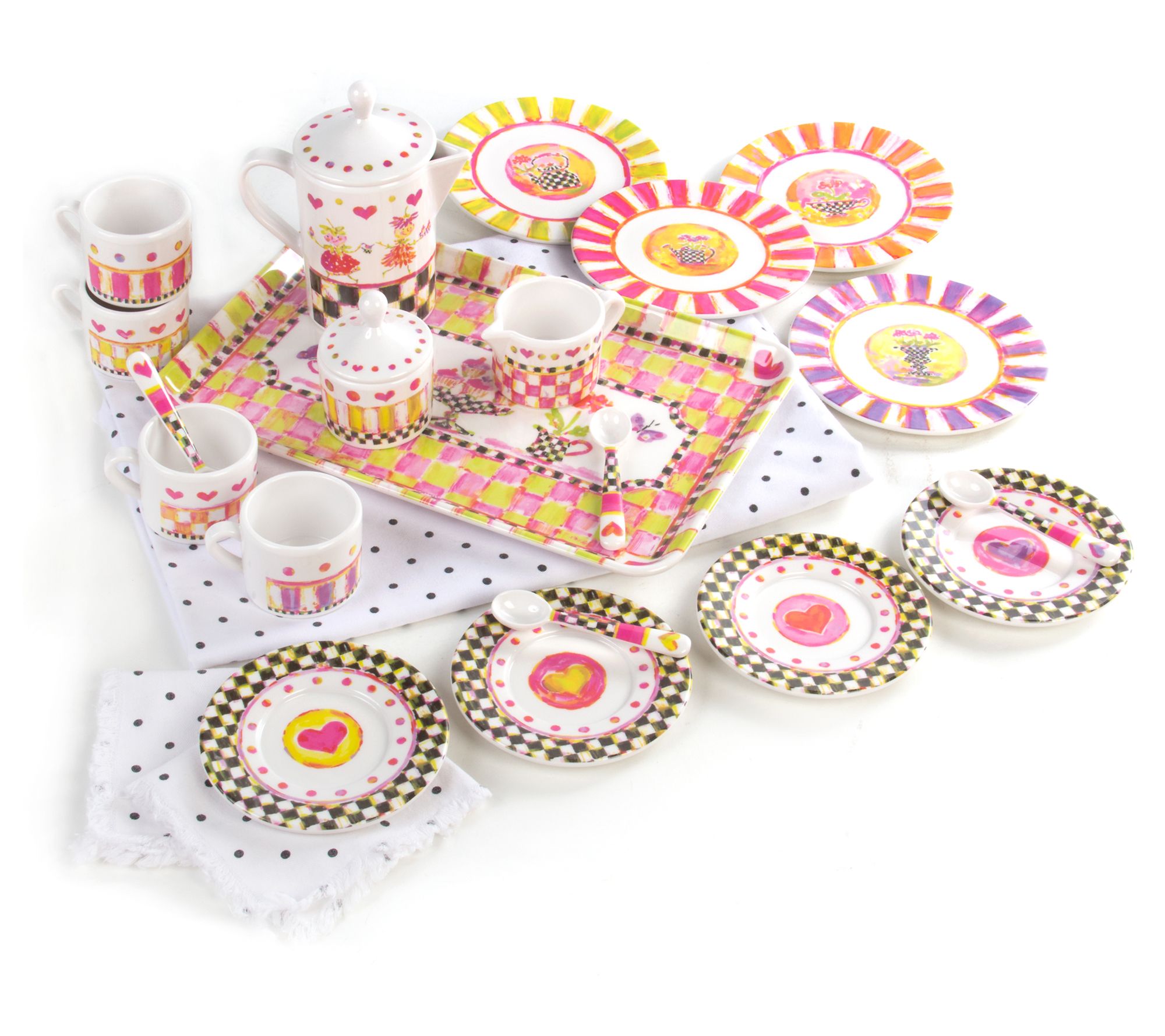 Elevate playtime with the MacKenzie-Childs tea party tea set, festooned with cheery interpretations of classic patterns. This set brings full-service whimsy to any playroom, making every pretend tea party a stylish affair. From tablecloth to teaspoon, it's never too early to start a collection. From MacKenzie-Childs.