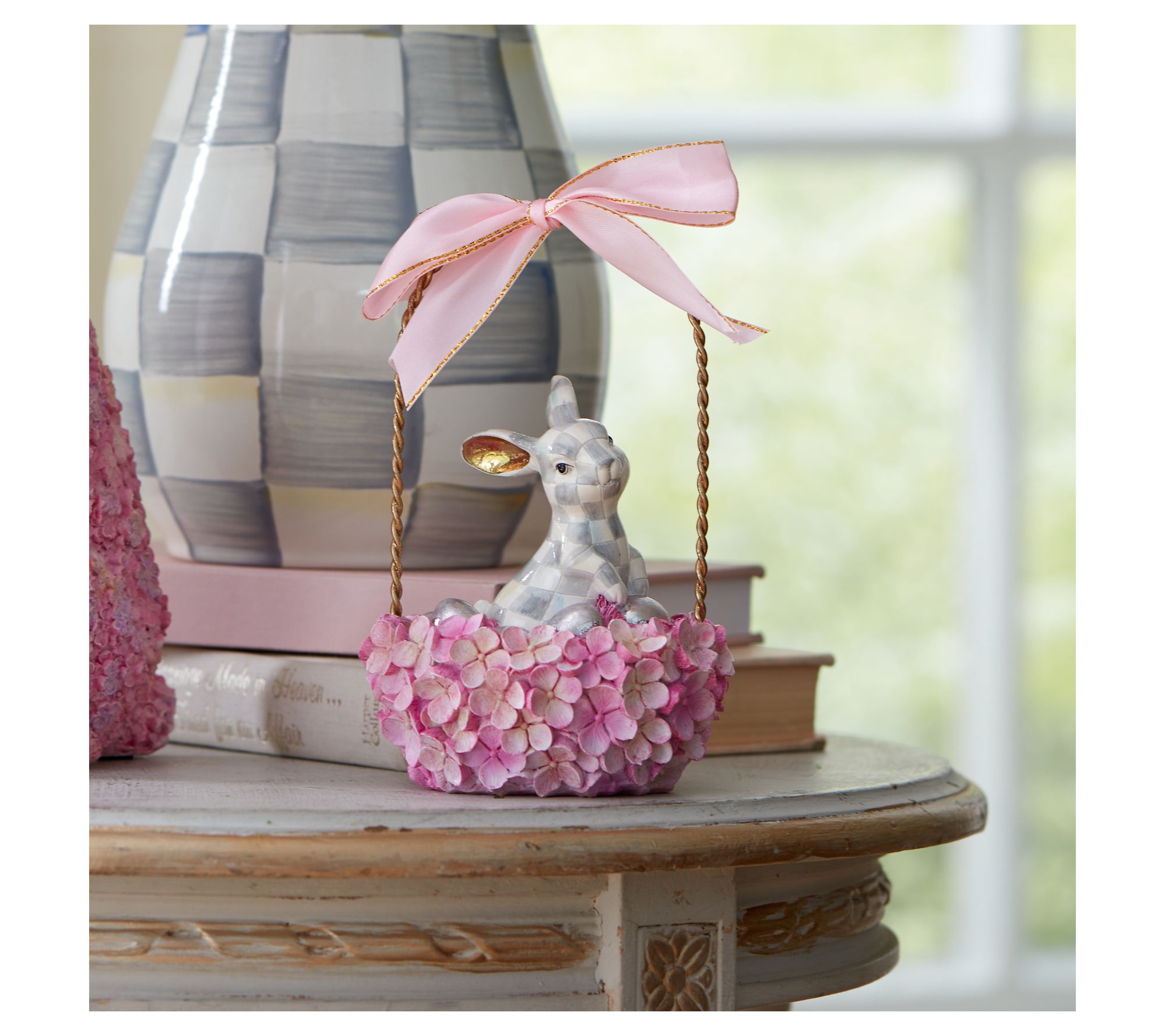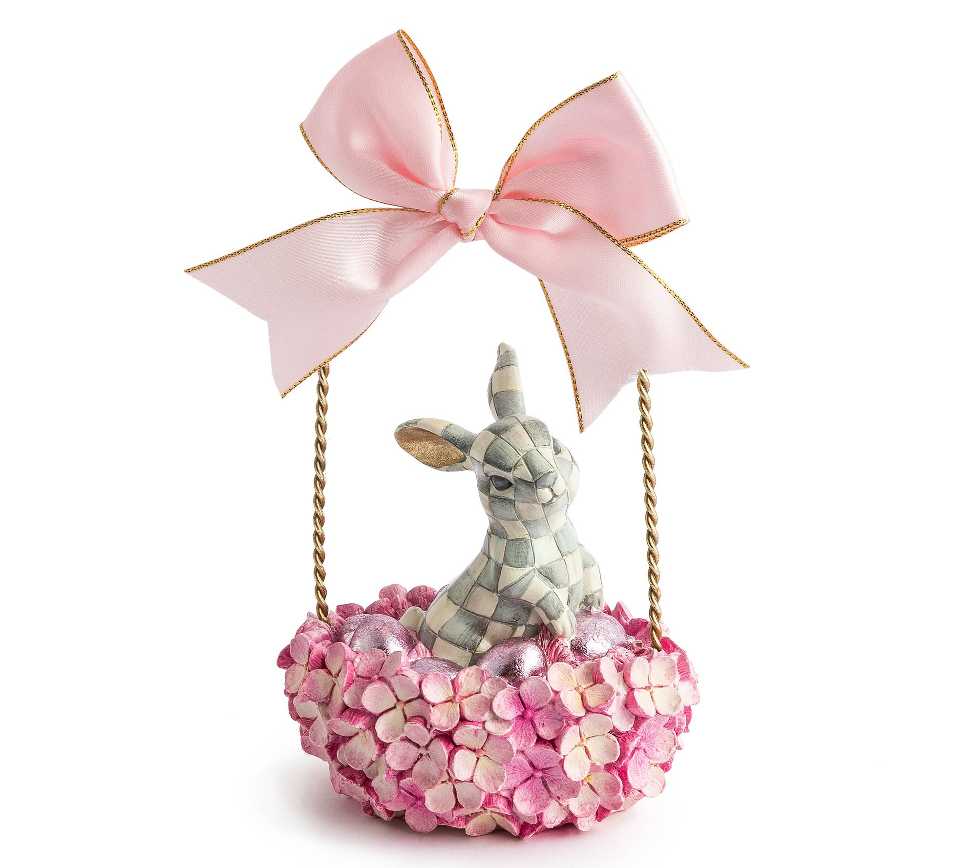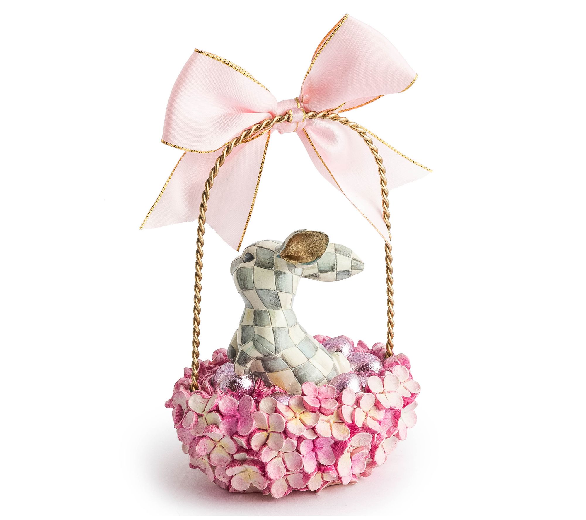 Bring a charming touch to your decor with this adorable bunny basket from MacKenzie-Childs. Delicately hand-painted with Sterling Check and goldleaf ears, resting in a basket adorned with pink faux hydrangeas and topped with a satin pink bow, this piece will surely find its way into your heart and home. Perfect for indoor use, it adds a delightful accent to any room. From MacKenzie-Childs.