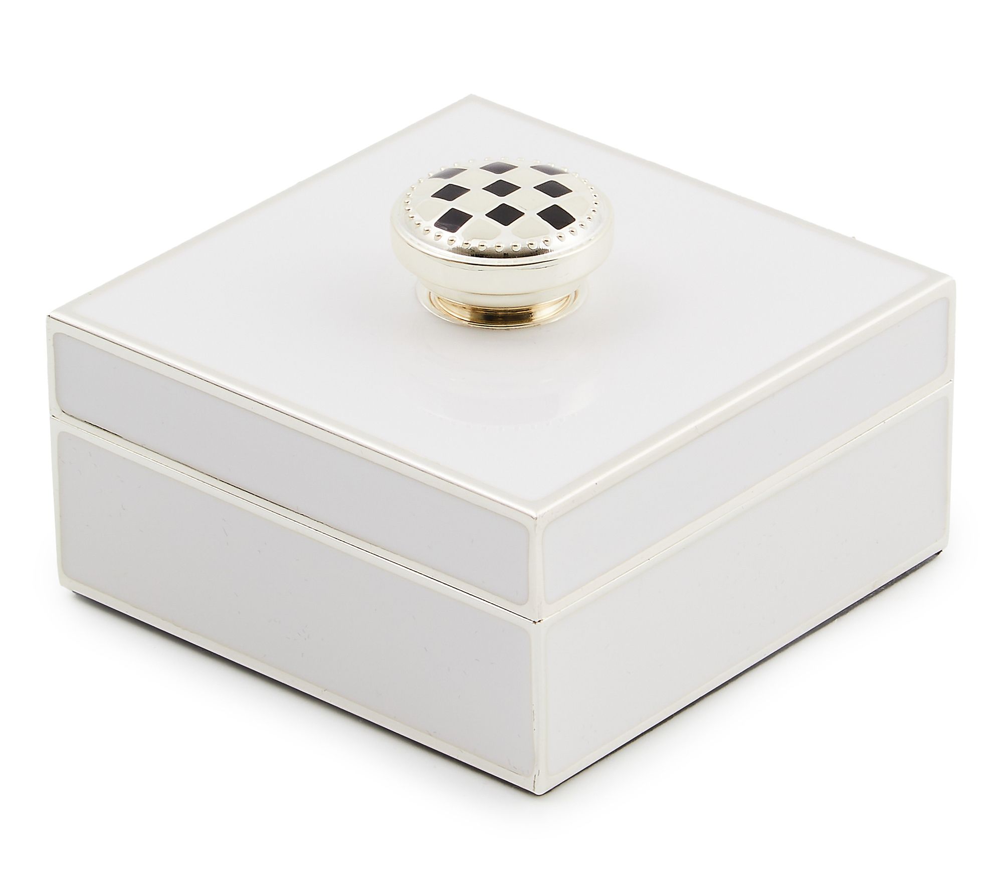 Perfect for safekeeping your cherished keepsakes, this trinket box from MacKenzie-Childs features an elegant enameled white coating on silvertone plate and a charming check knob. Whether it's for yourself or as a thoughtful gift, this little box with its velvet-lined interior offers the ideal spot to store your treasures. From MacKenzie-Childs.