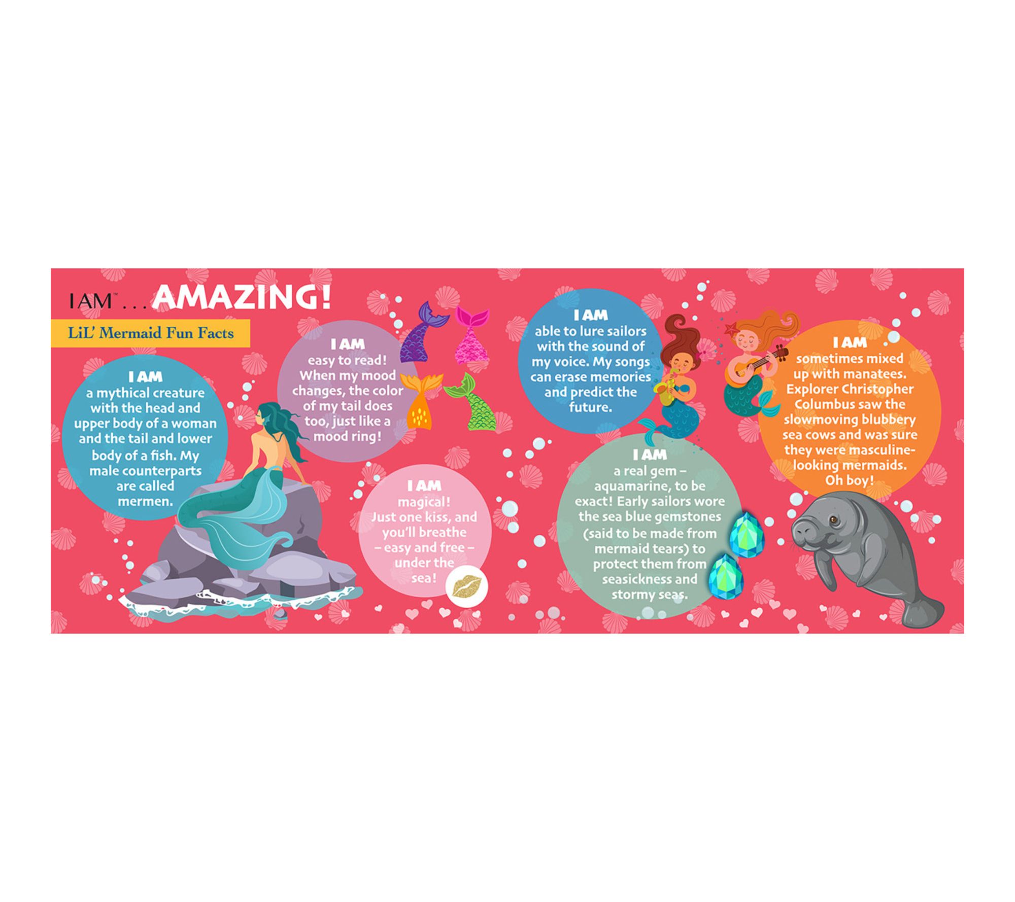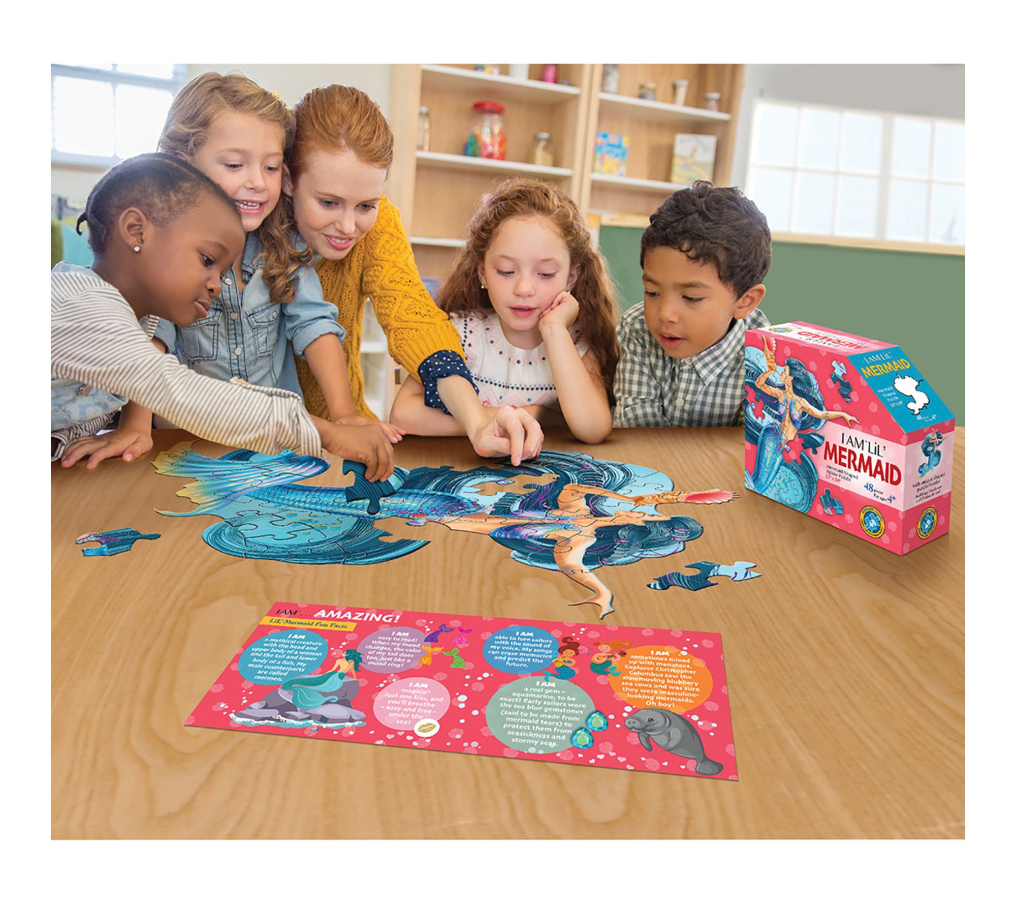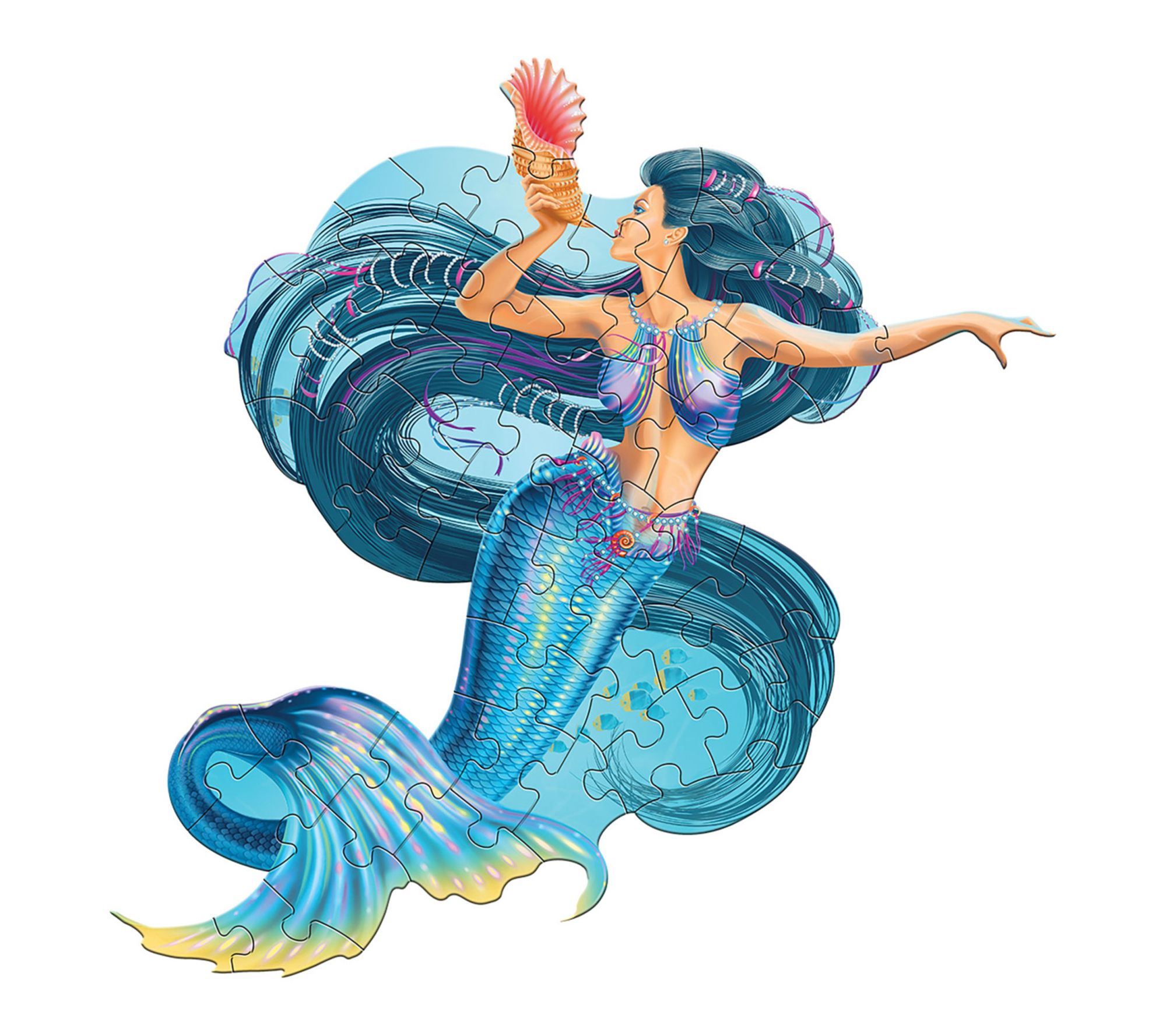 • Poster-sized, mermaid-shaped jigsaw puzzle; semi-gloss image; random cut, interlocking pieces on chipboard