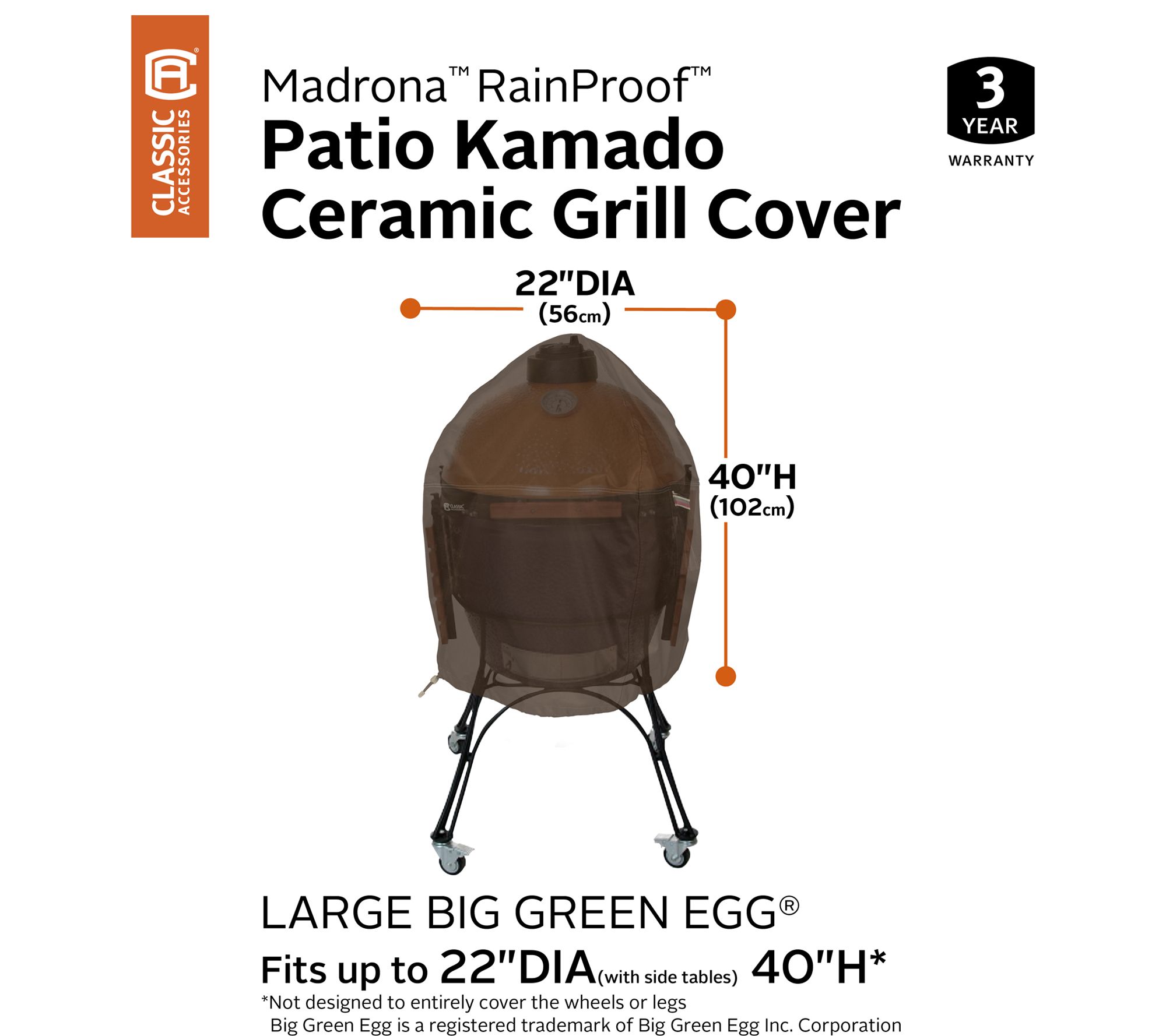 Protect your kamado ceramic grill when it's not in use with this Madrona cover. The durable RainProof fabric and taped seam construction keeps the elements away, while the buckle closure and adjustable webbing keep it securely fastened. From Classic Accessories.