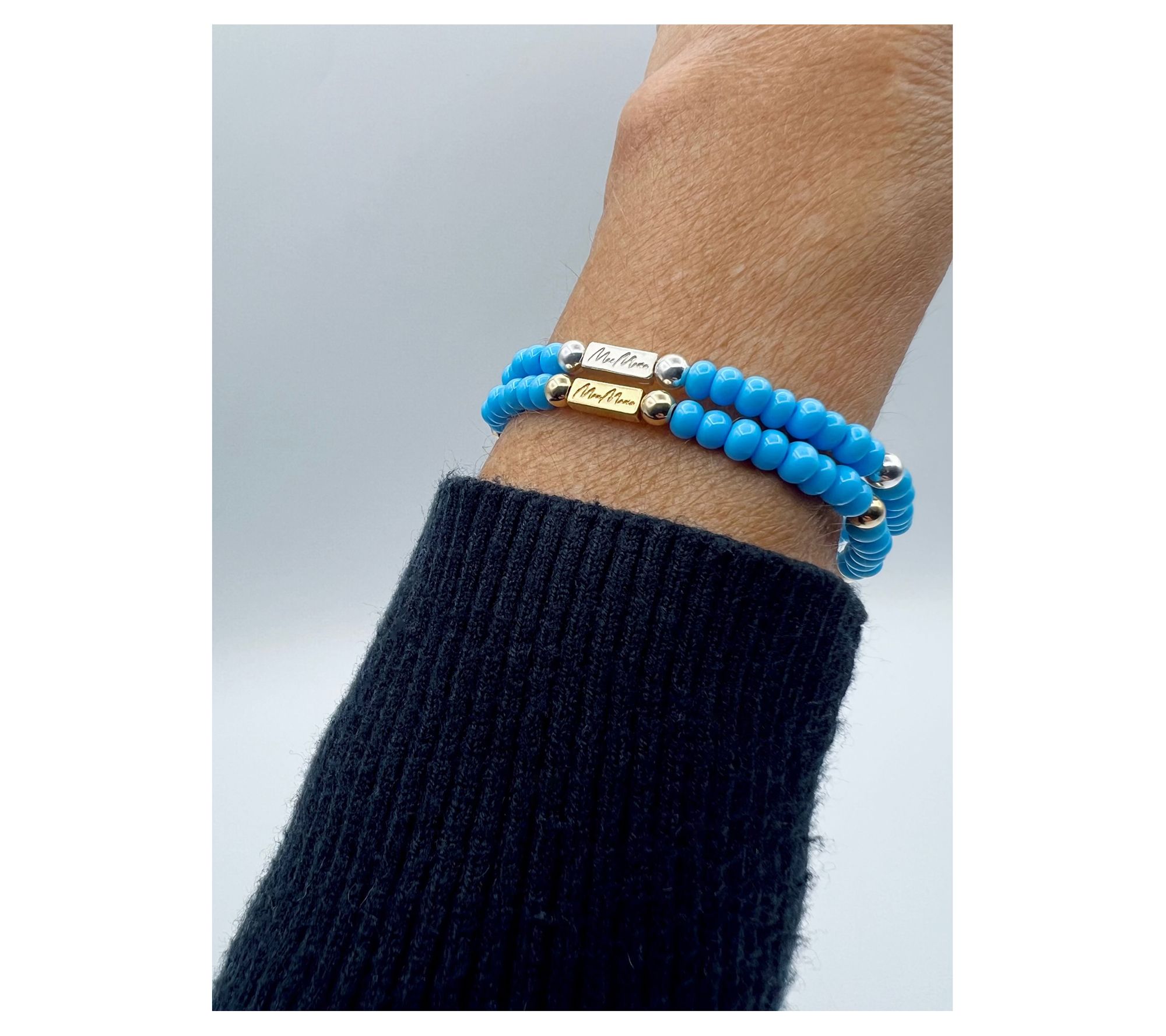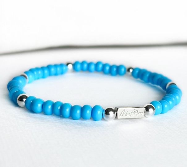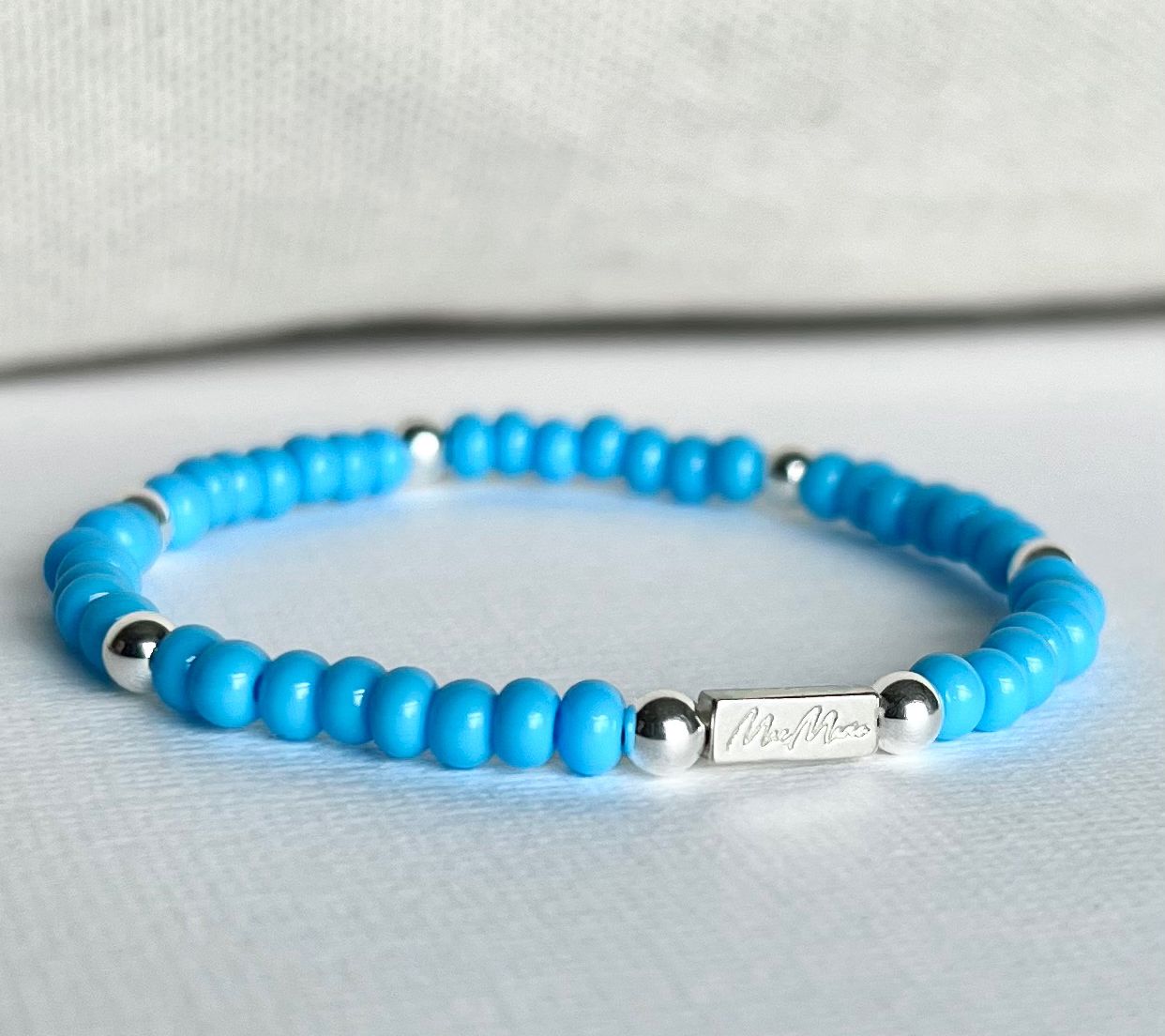• Beaded, tied, glued, and crimped by the MaeMarie team; strong elastic; sterling silver and European glass beads
