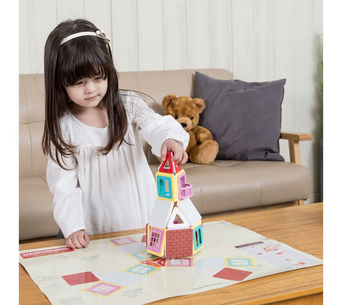 Unleash your child's inner architect with the Magformers Build Up Set. It includes a variety of geometric shapes, along with balconies, windows, and bricks, to create skyscrapers, apartment buildings, and cabins in assorted bright colors. From Magformers.