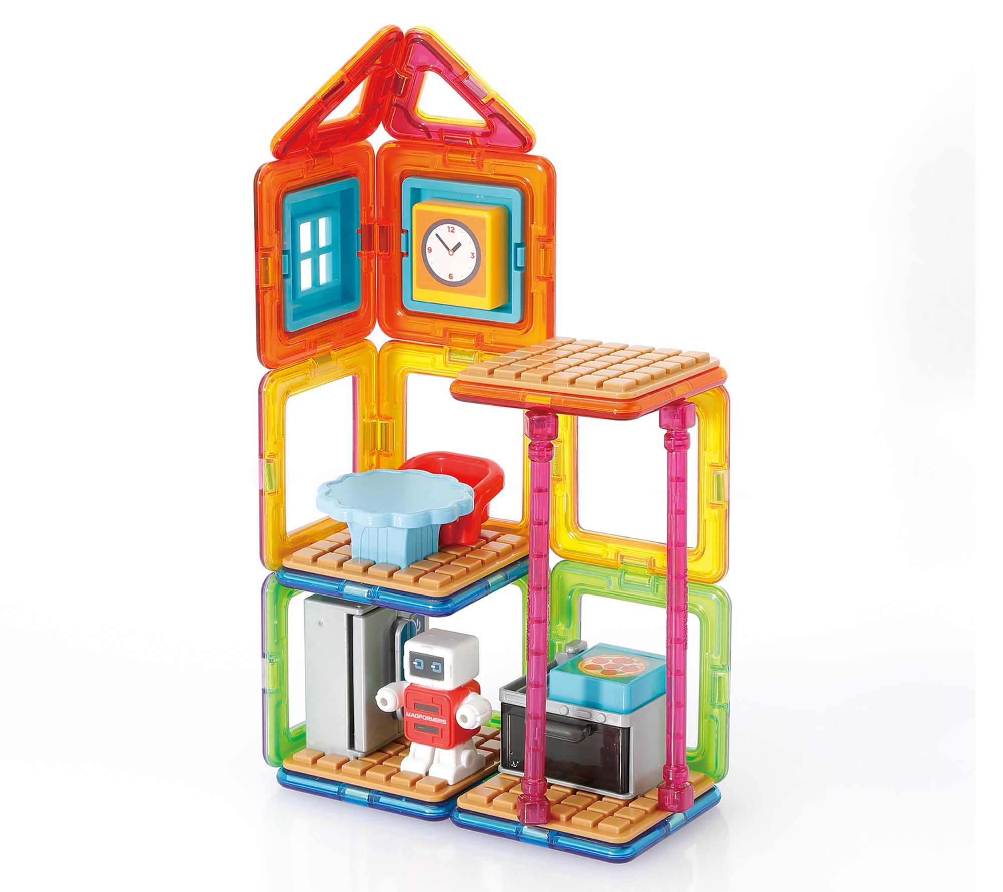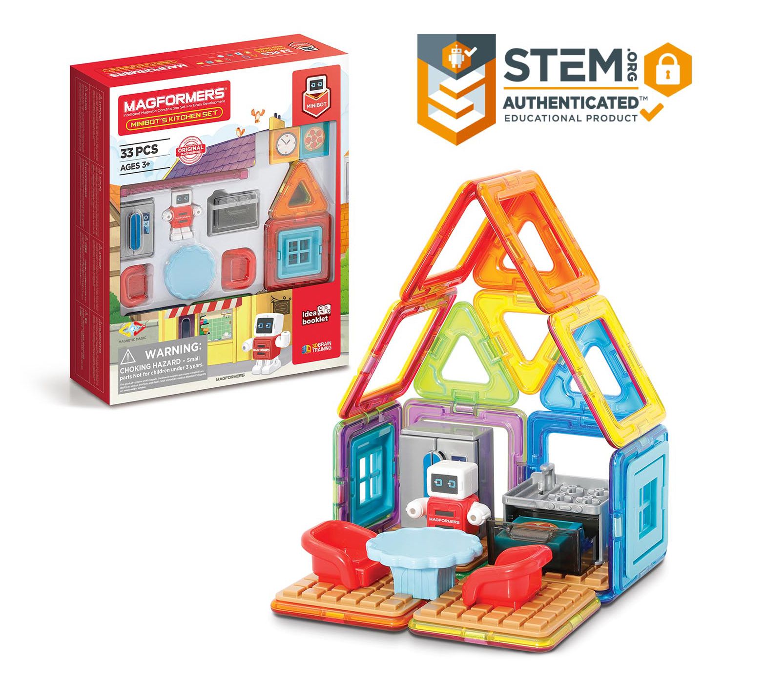 Click, connect, and create with this Magformers Minibot Kitchen Set, packed with a variety of geometric shapes that stick together with magnets to make ideas come to life. And when playtime is over, use the magnetic power to simply stack and store. From Magformers.