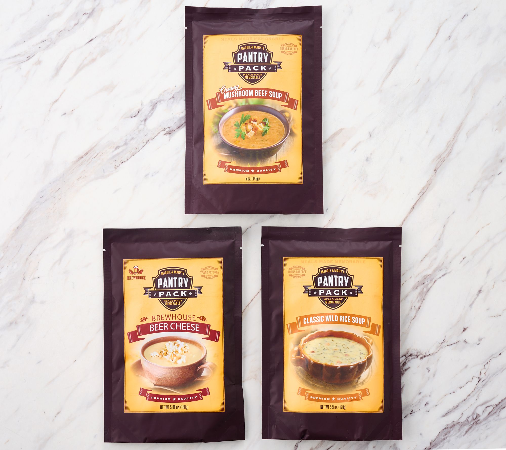 Craving comfort food? Maggie & Mary have you covered with this three-pack of homestyle classic pantry soups. Just add water and your choice of protein (if you desire) to create a comforting meal in minutes. Keep them on hand for a quick dinner on chilly nights or when you want a hearty lunch -- these soups offer a satisfying solution for any meal. From Maggie & Mary.