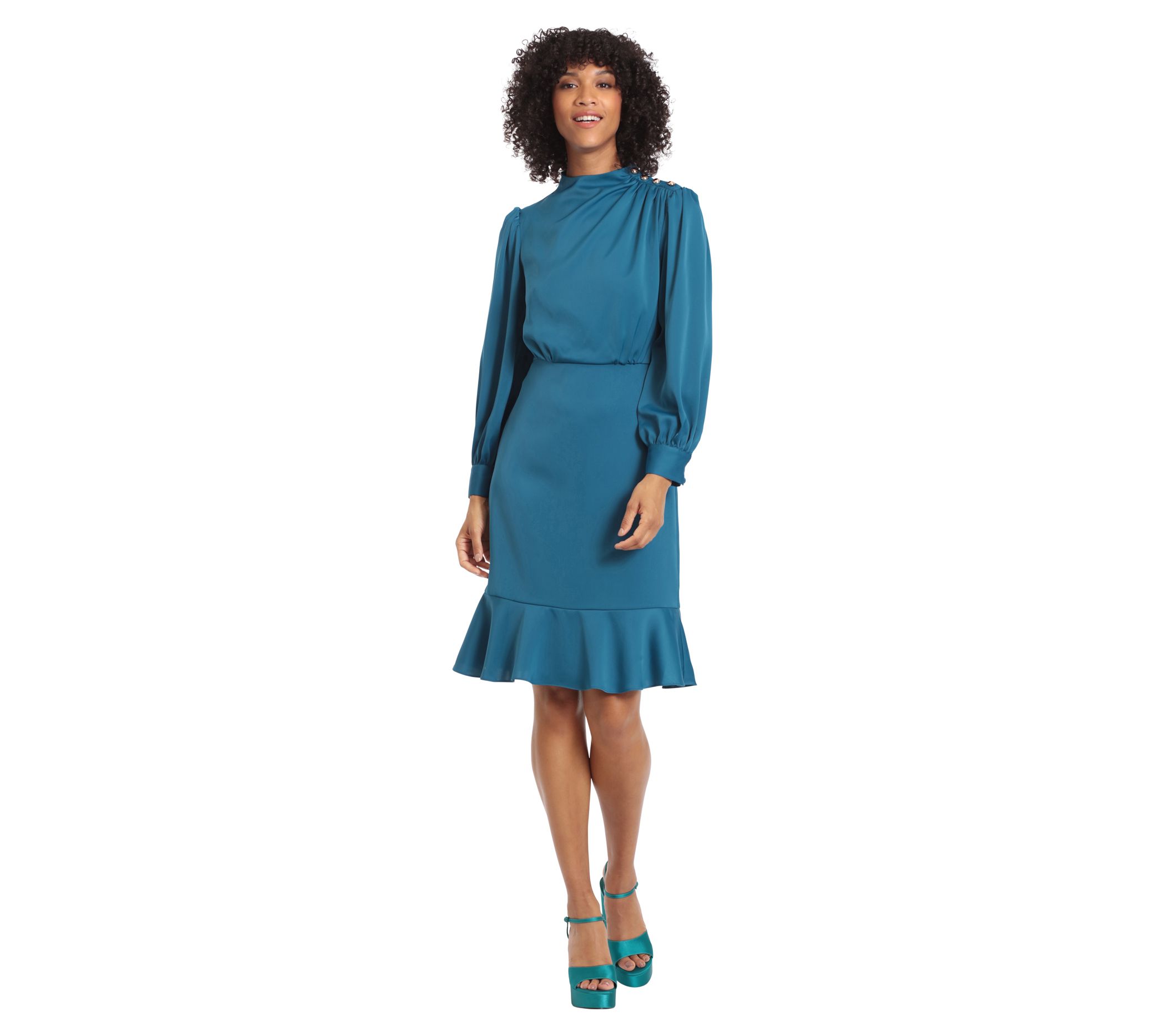 • Features: mock neck, long sleeves, flounce hem, shirring at neckline, buttons on shoulder