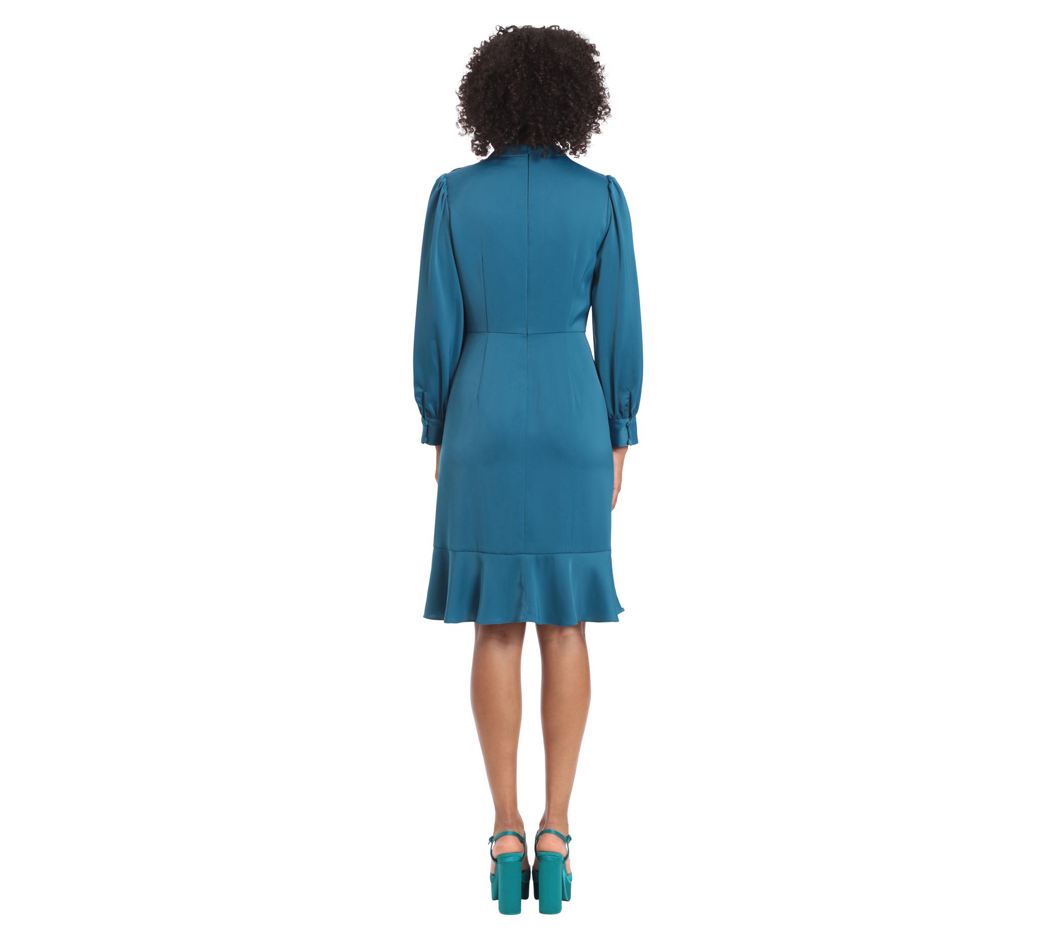 Look polished and poised in this long-sleeve dress. A flouncy hem and shirring detail are stylish details that glam up the look. From Maggy London.