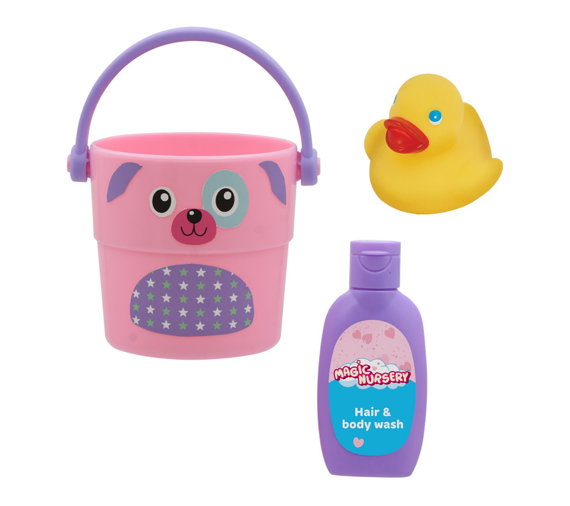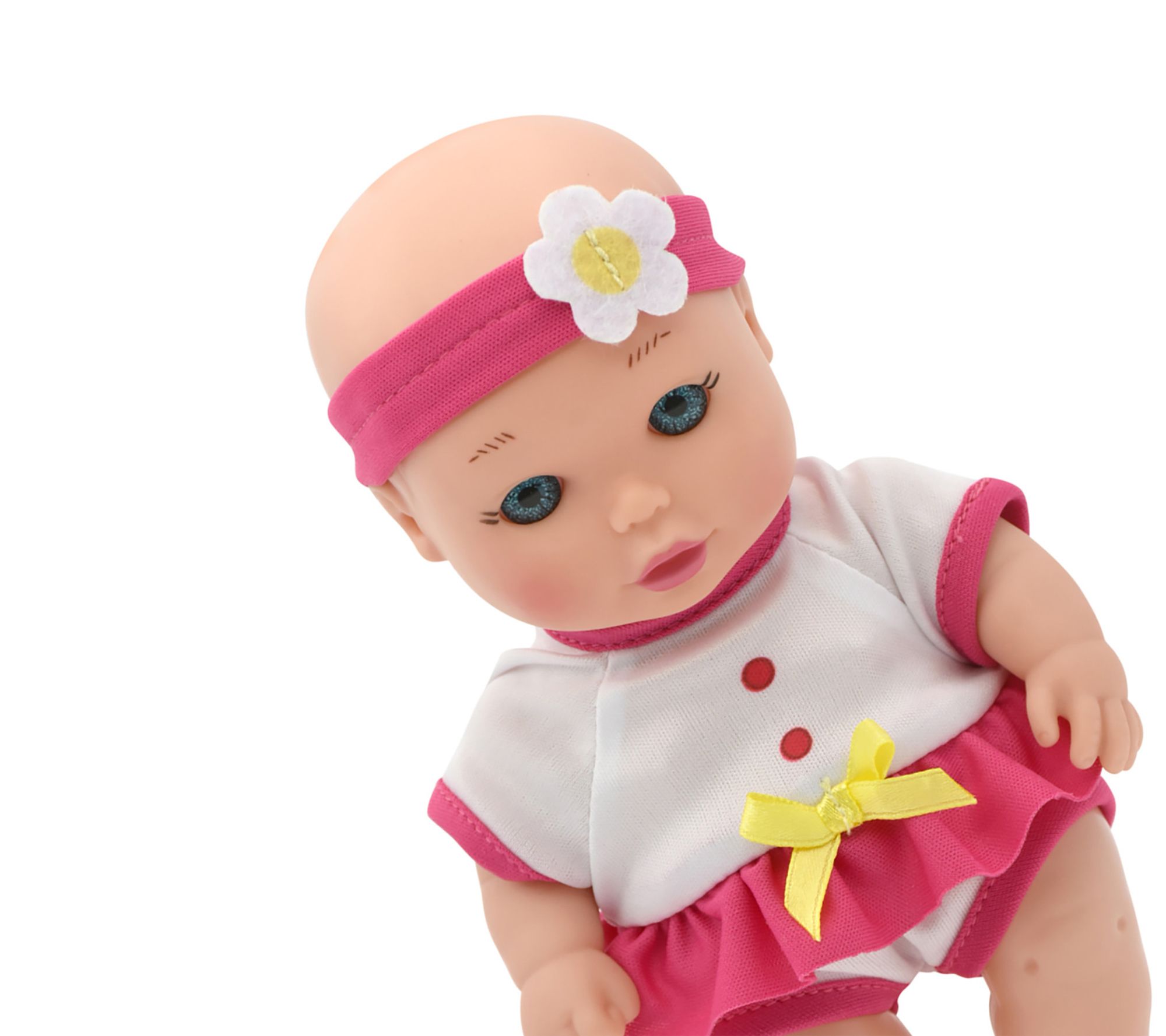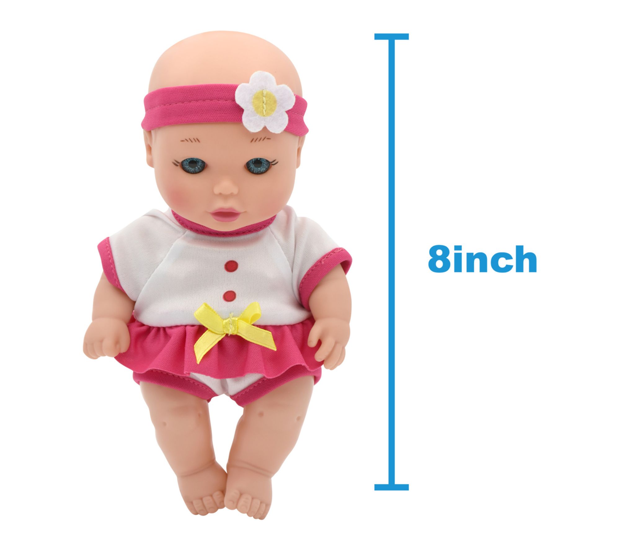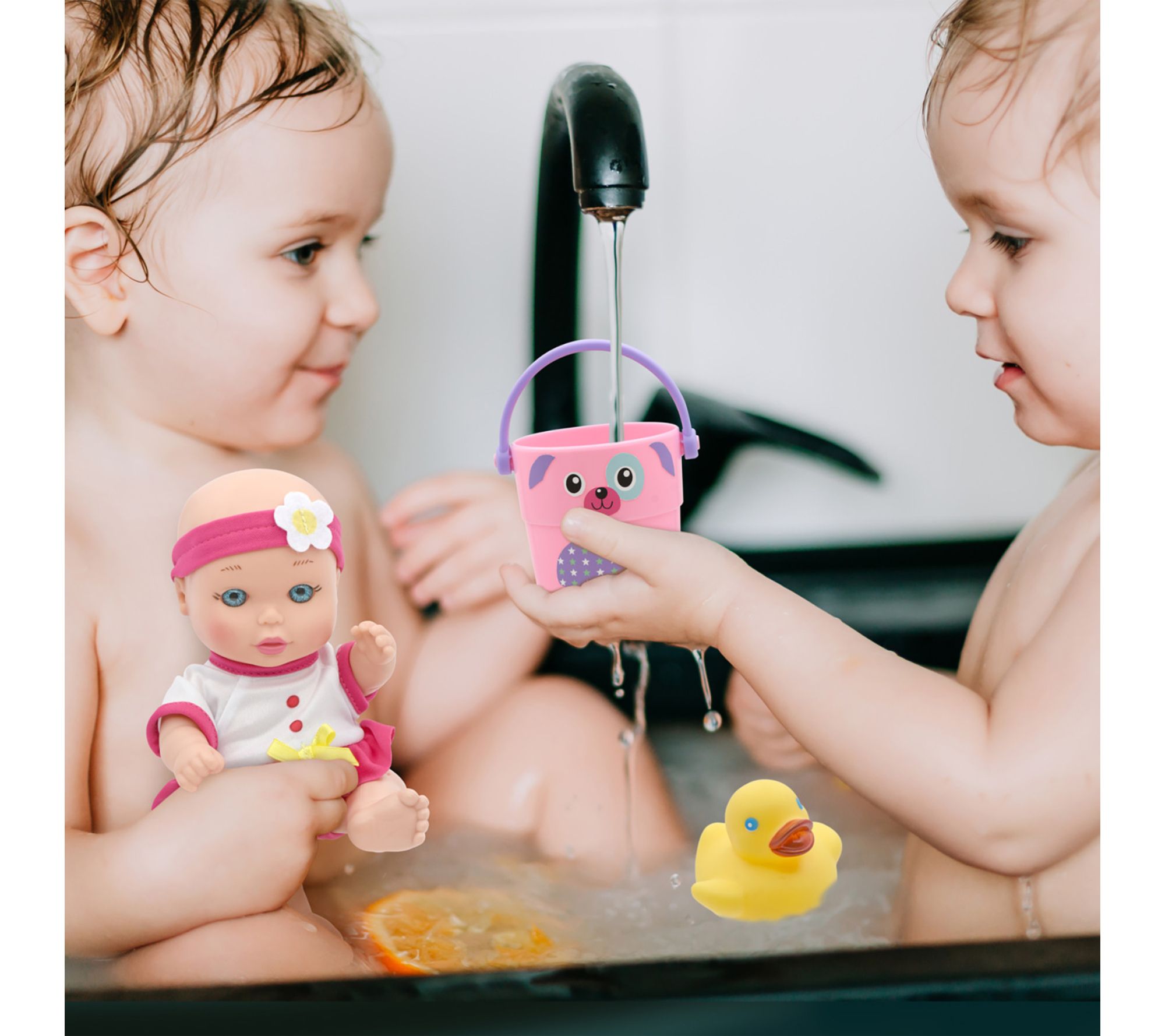 • Includes 8" doll with outfit, bucket, play hair and body wash bottle, and rubber ducky