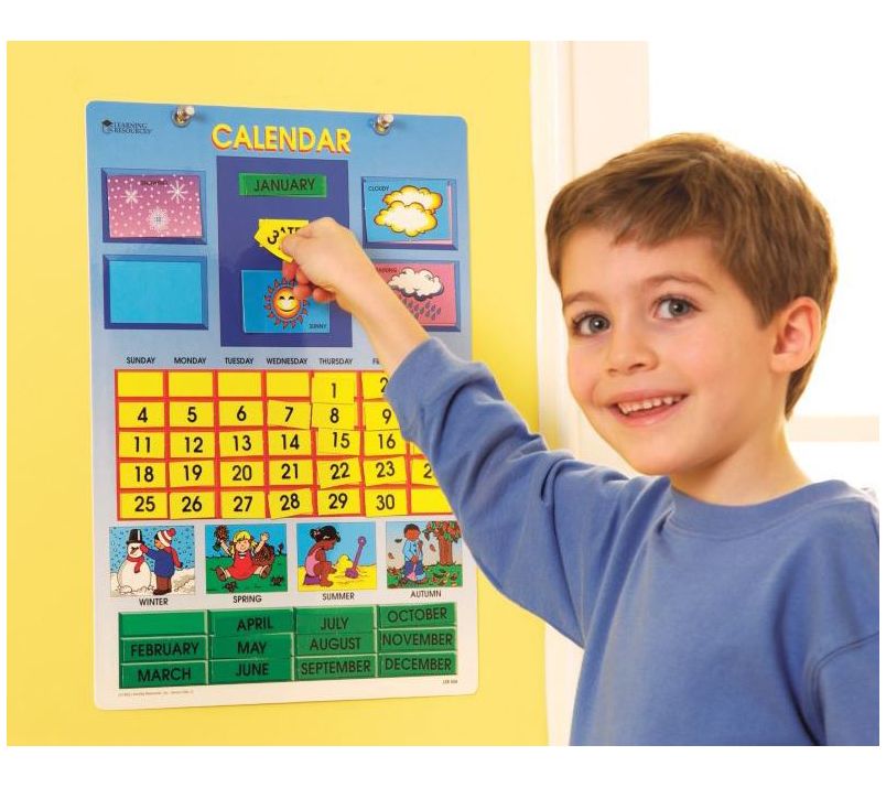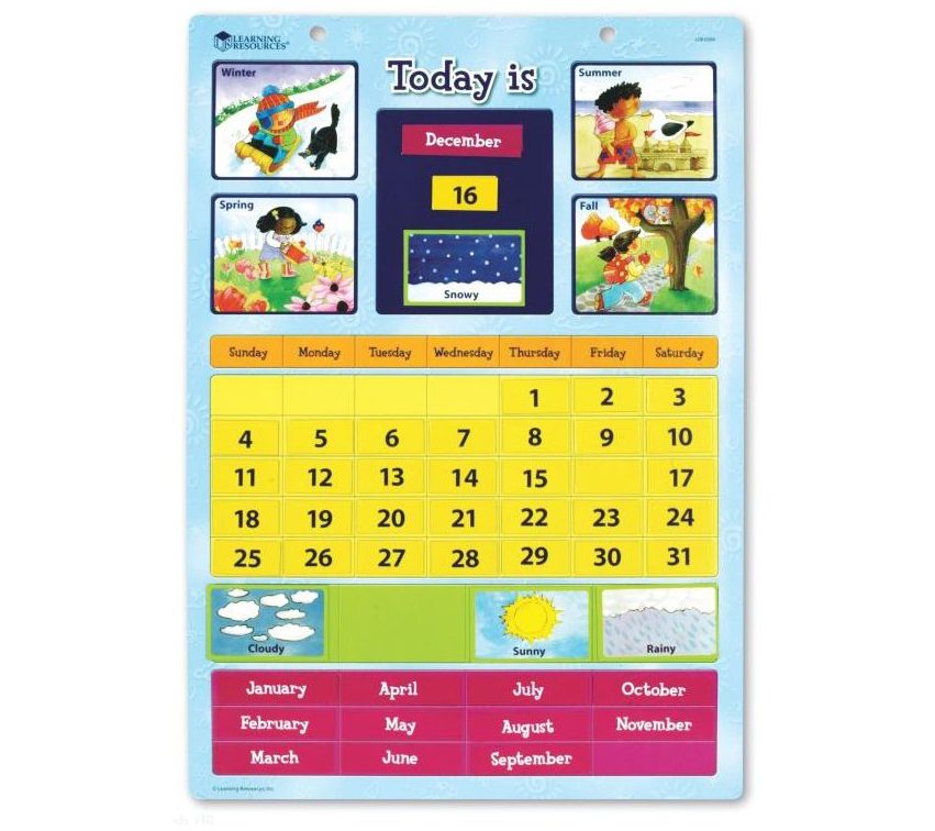 The Learning Resources Magnetic Learning Calendar helps kids learn to track days, weeks, months, and weather. This colorful magnetic calendar features a write and wipe surface and grommets for hanging on the wall. From Learning Resources.