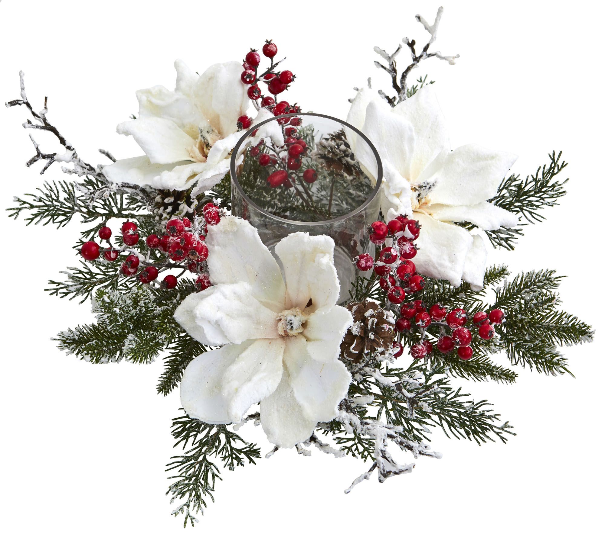 • Lifelike magnolia blooms, pine branches, and red berries as a candelabrum with frosted faux snow finish
