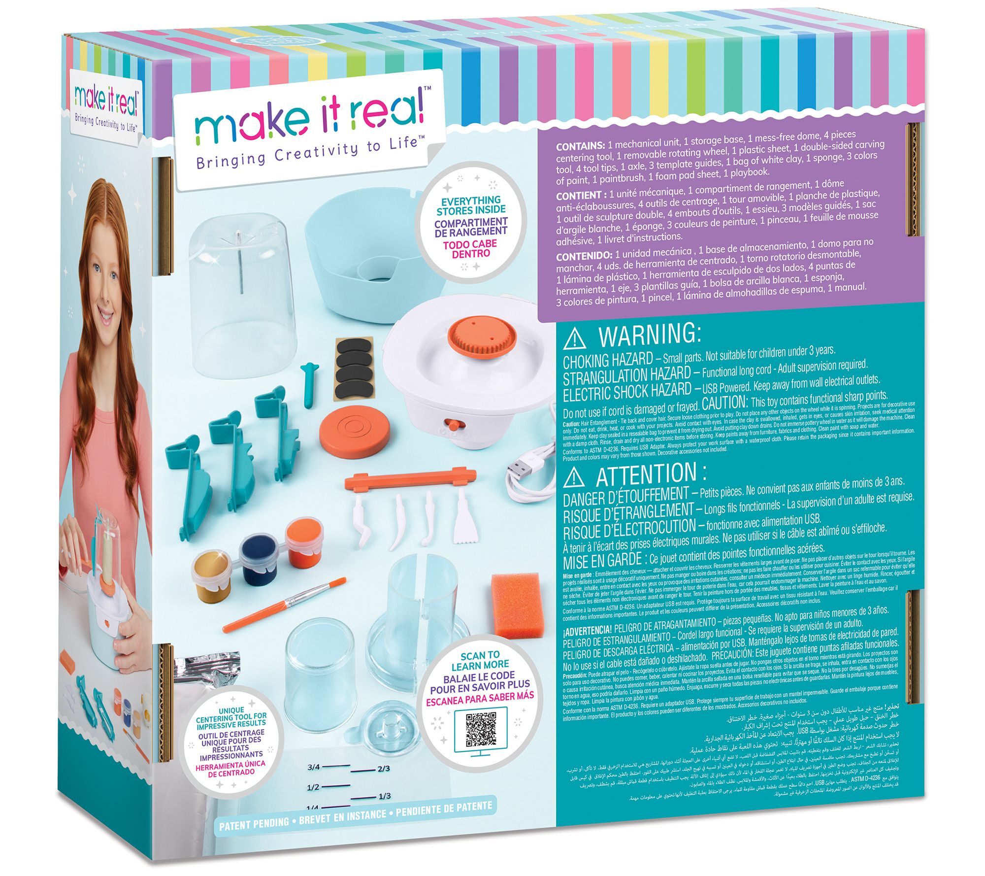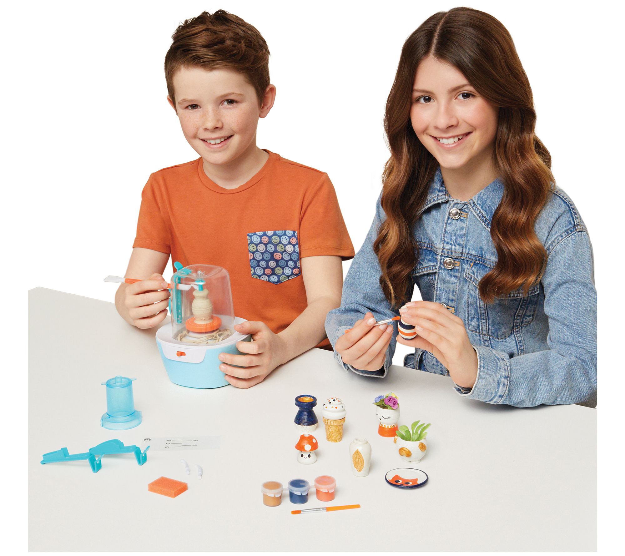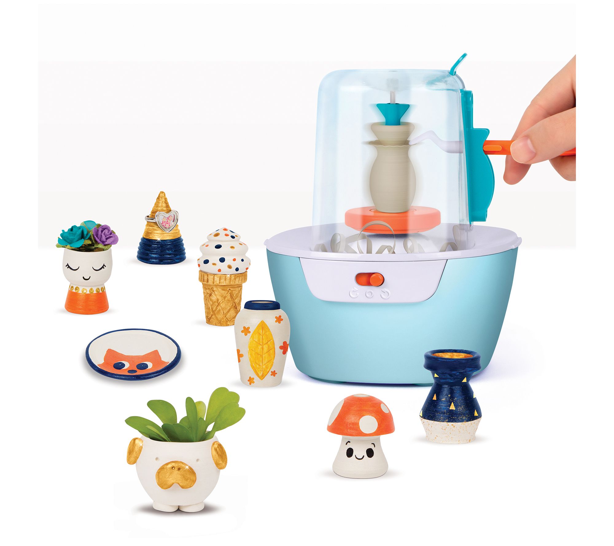 • Includes mini pottery wheel, storage base, dome, four centering tools, removable rotating wheel, plastic sheet, double-sided carving tool, four tool tips, axle, three template guides, bag of white clay, playbook, sponge, three paints, paintbrush, foam pad sheet