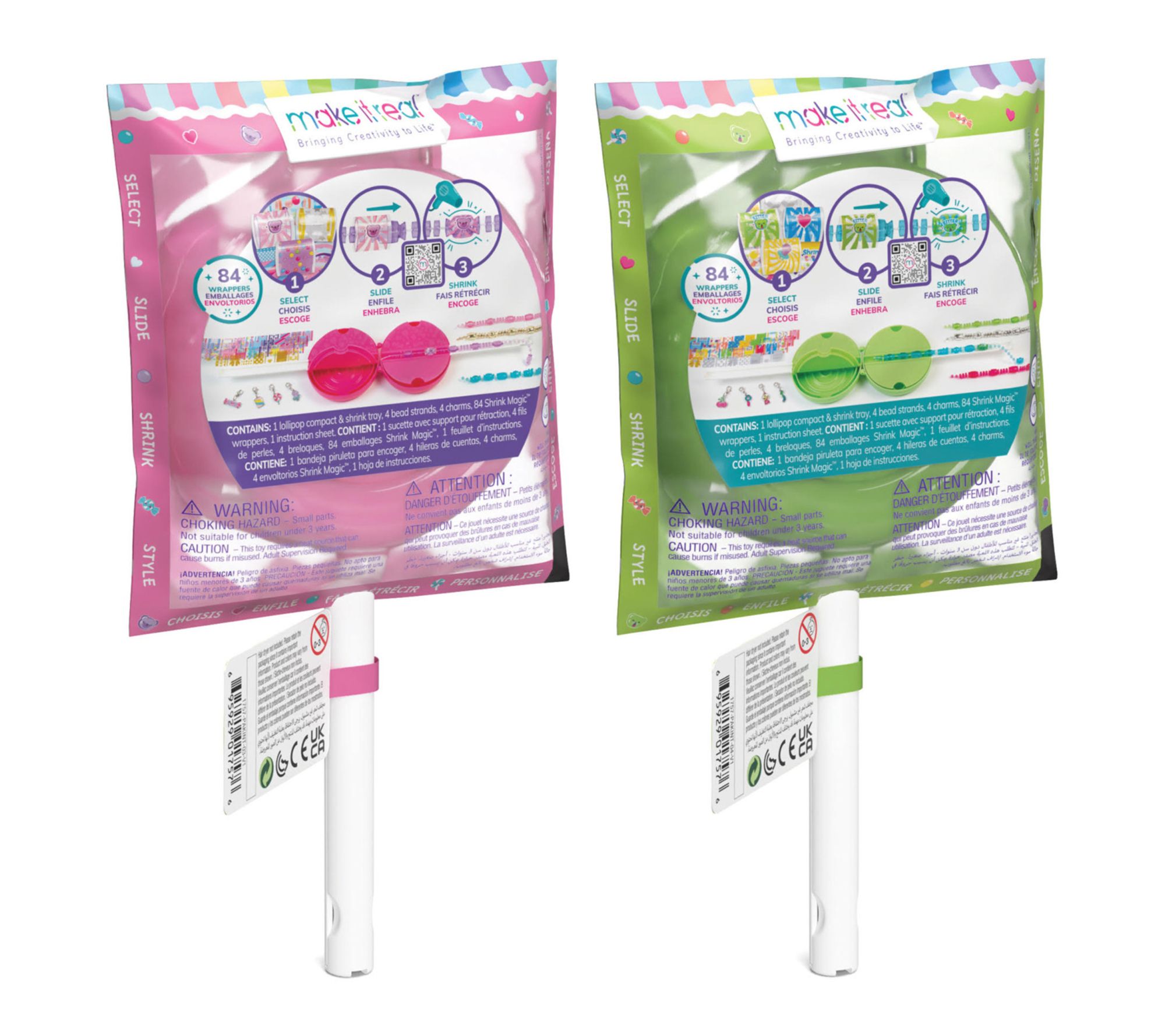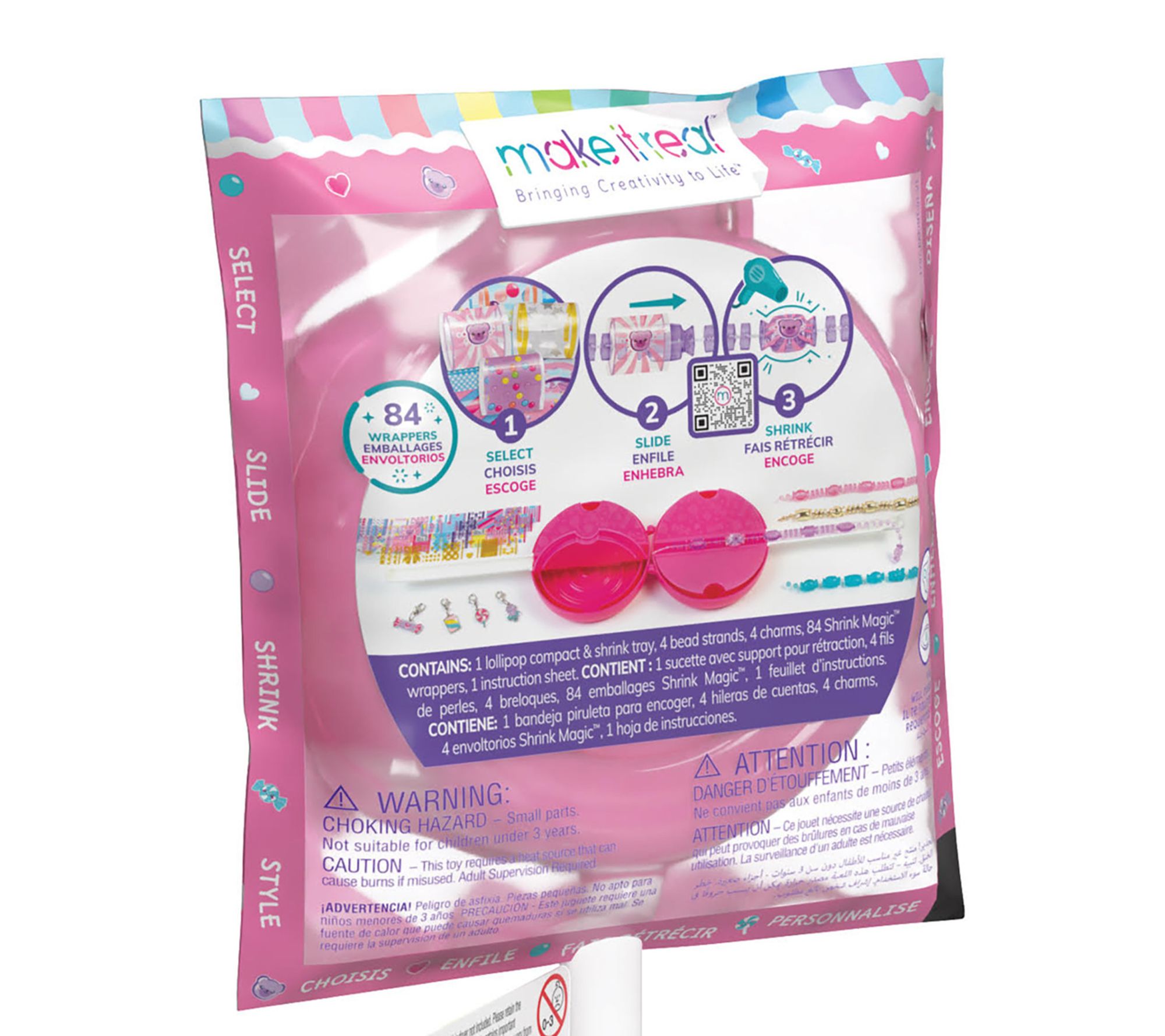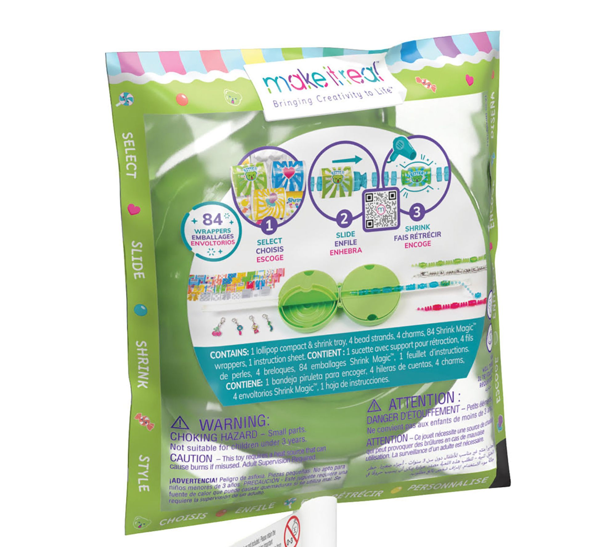 • Includes one lollipop compact and shrink tray, four bead strands, four candy-shaped charms, 84 Shrink Magic wrappers, and one instruction sheet