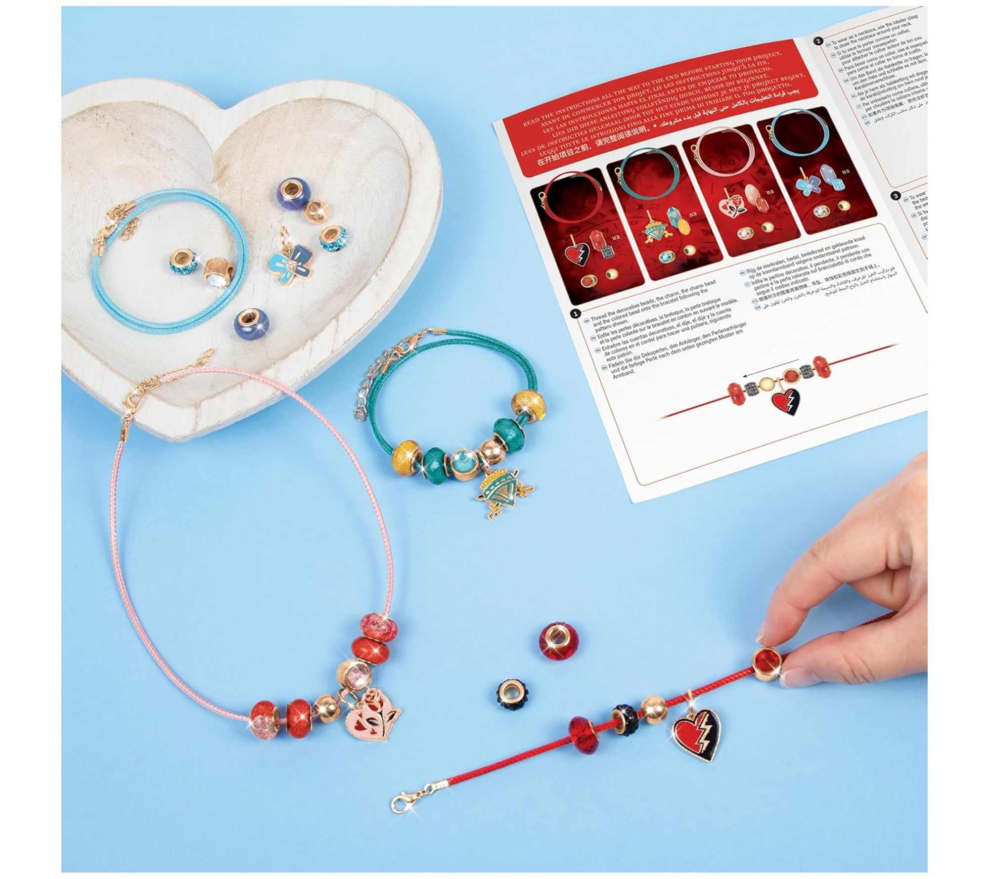 • Includes four cord bracelets, four pendant charms, four bead charms, four gold beads, 16 decorative beads, one story book, one instructions sheet