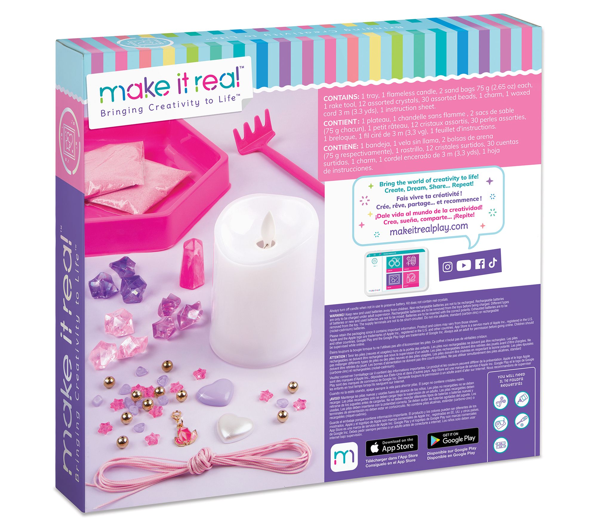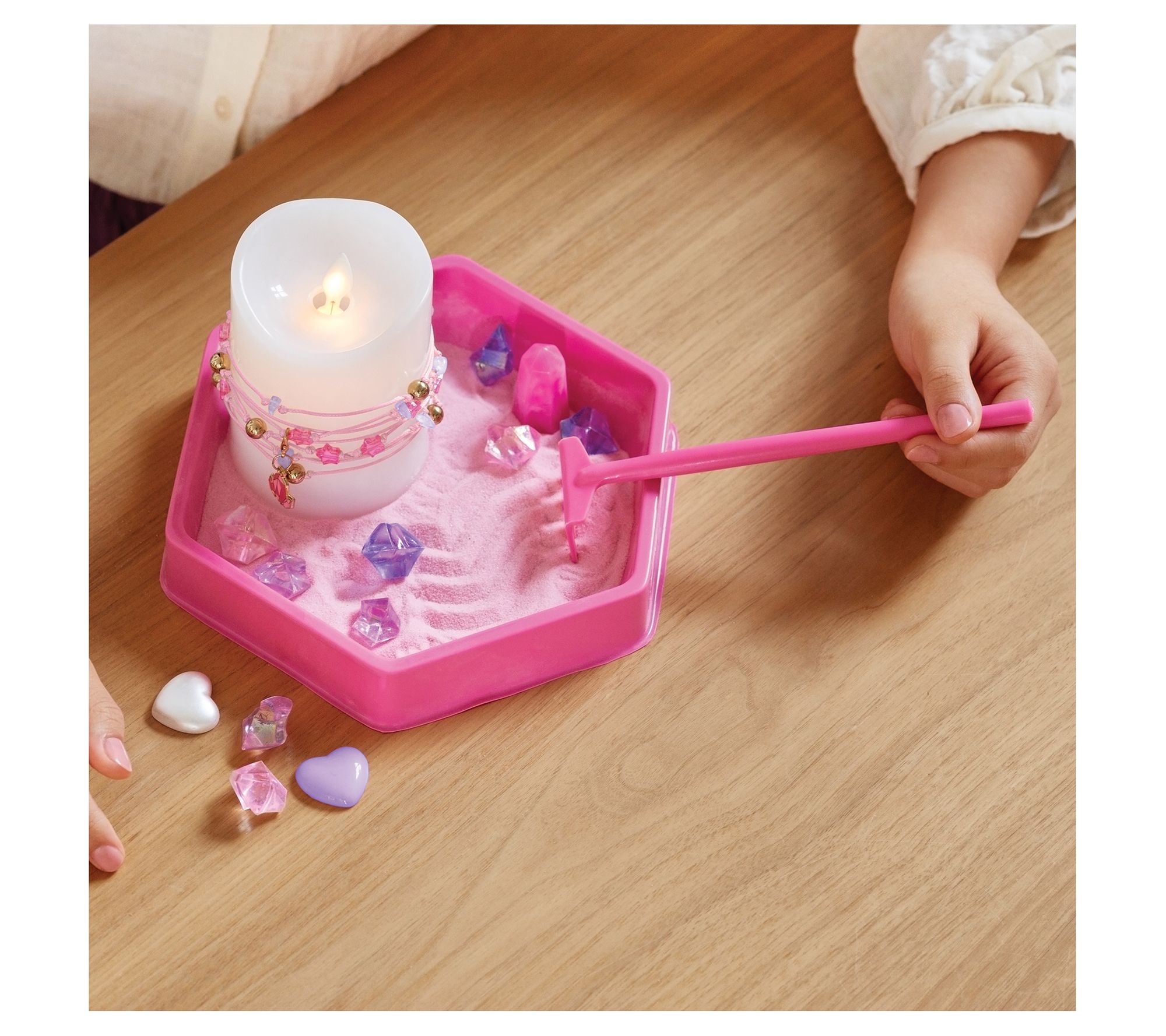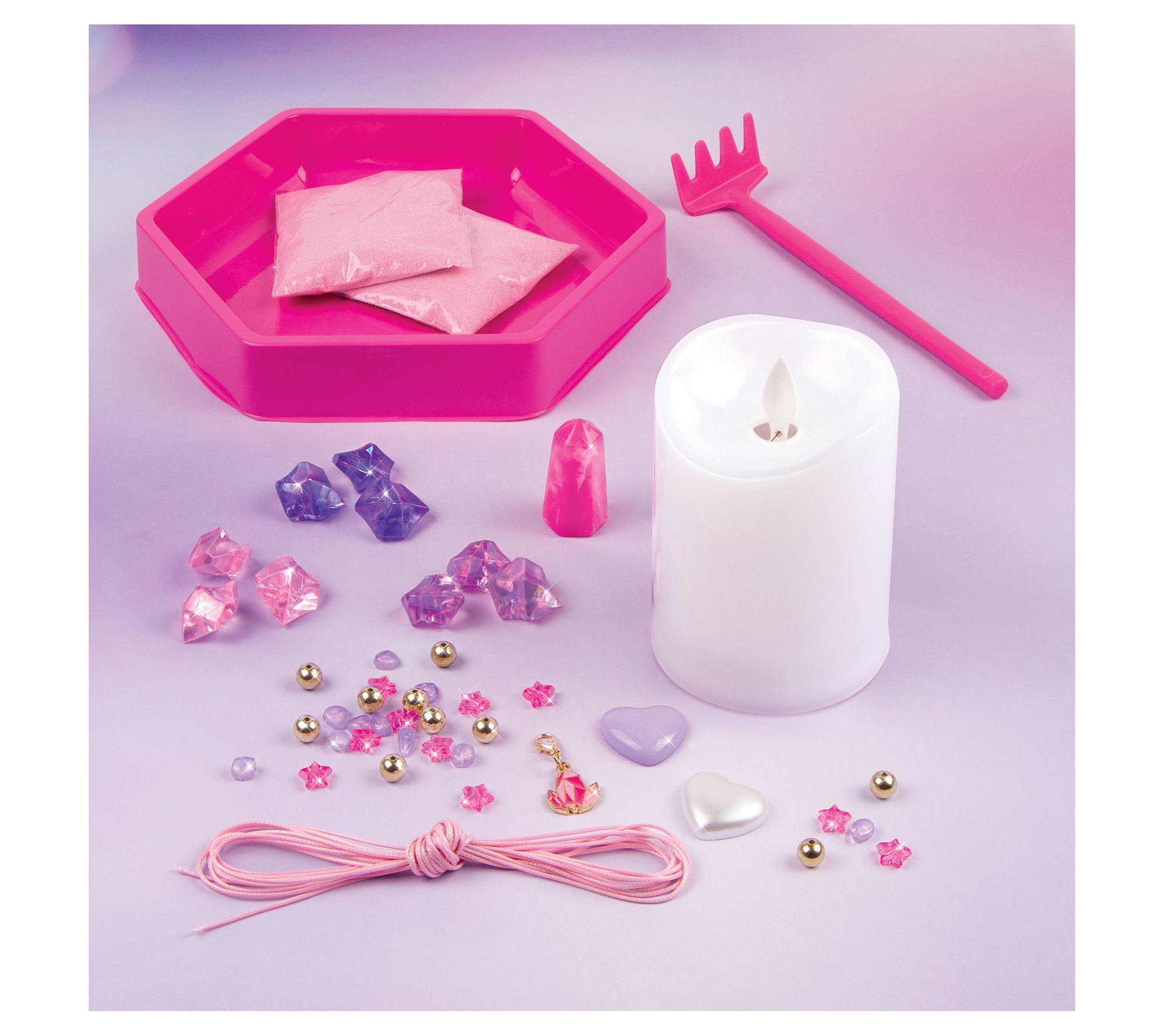 • Includes hexagon tray, flameless candle, two bags of sand, rake tool, 12 crystals, 30 beads, charm, waxed cord, and instruction sheet