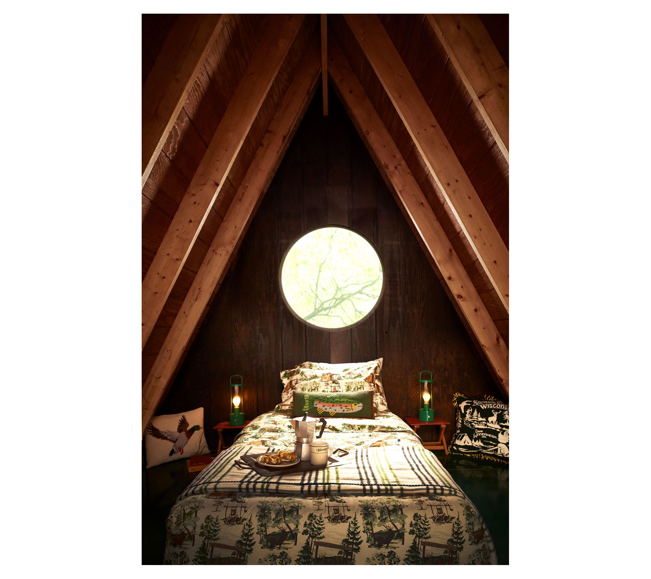 Bring the nostalgic charm of the great outdoors into your bedroom with the Camp Wandawega queen sheet set. Inspired by vintage barkcloth designs, these 100% cotton percale sheets feature scenes reminiscent of 1960s and '70s camping adventures. From Makers Collective.