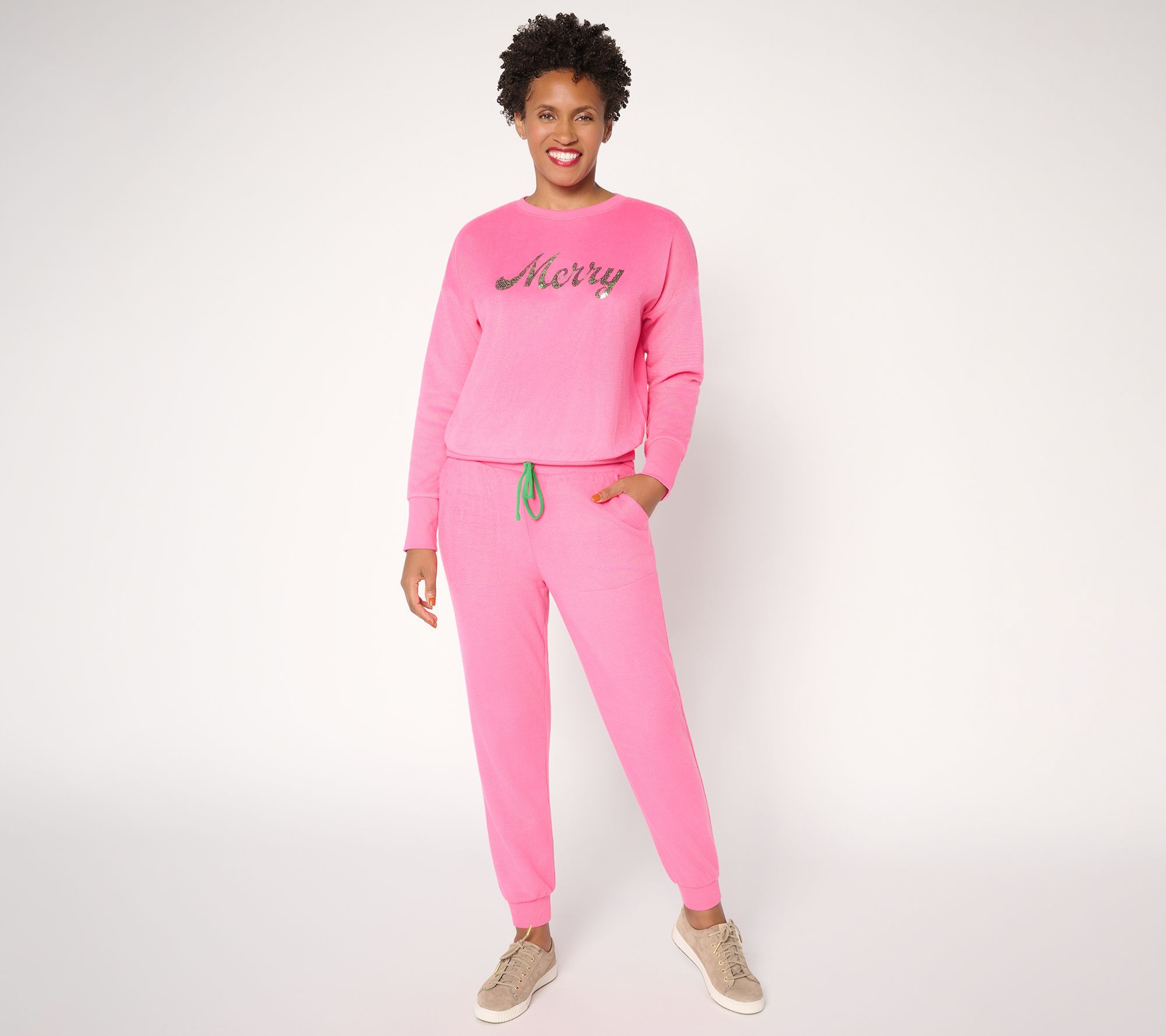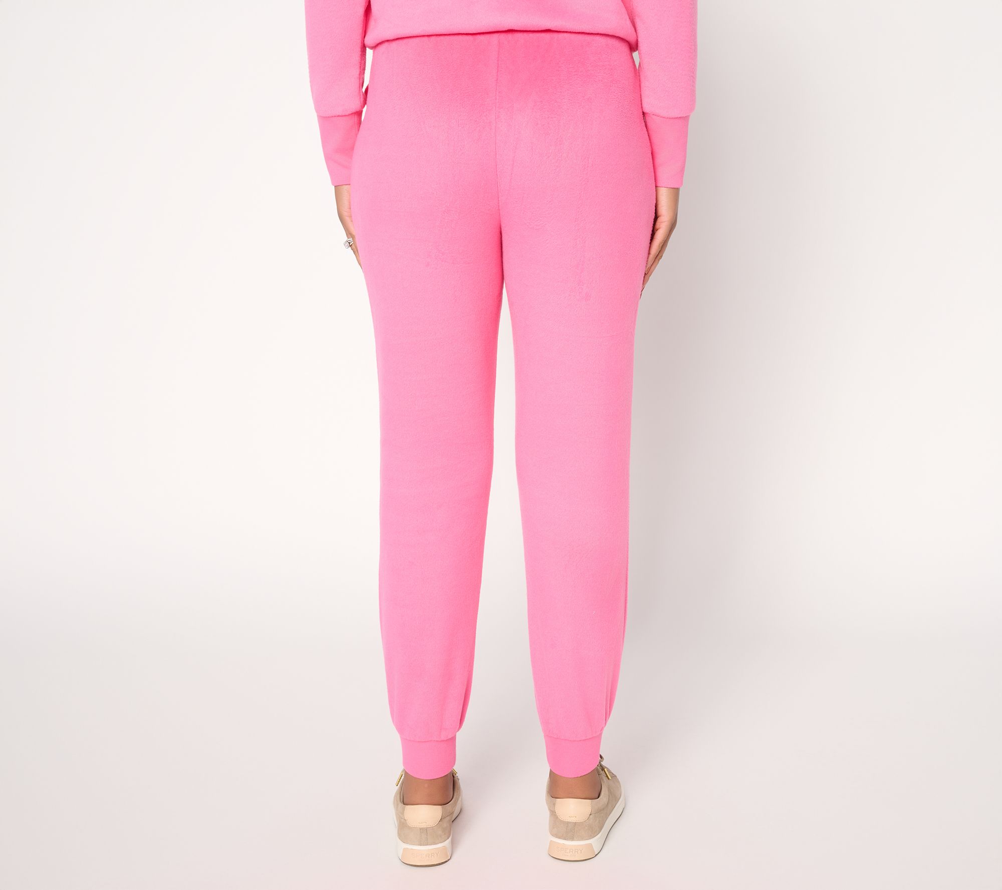 Make downtime merry all season long! Soft sherpa jersey joggers add warmth and style whether you're running errands or relaxing at home. Plush fleece fabric, a drawstring waistband, and ribbed cuffs deliver a cozy fit, while the tapered leg and side pockets keep your essentials close and your look effortless. From Mally Roncal.